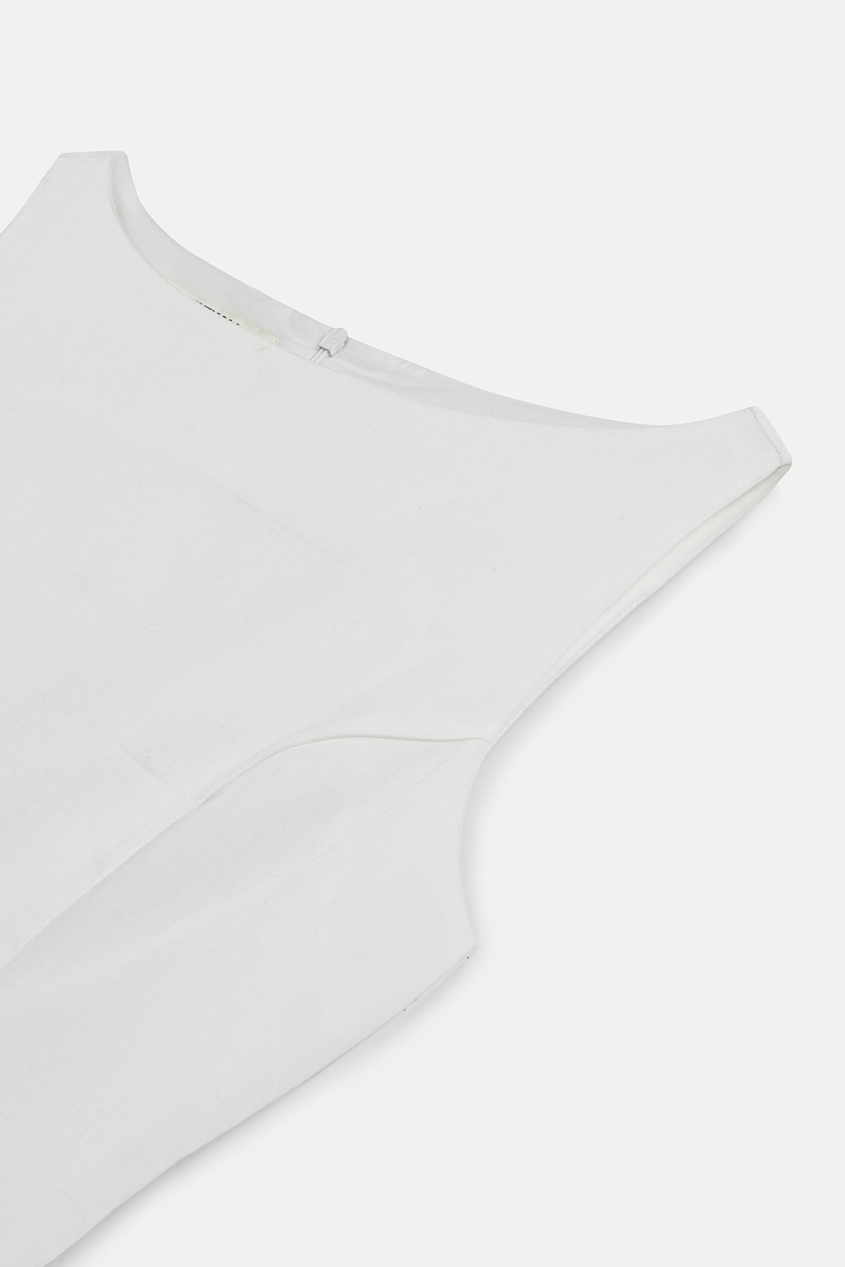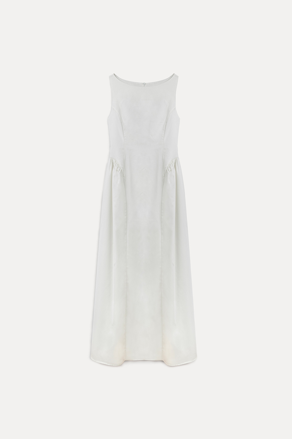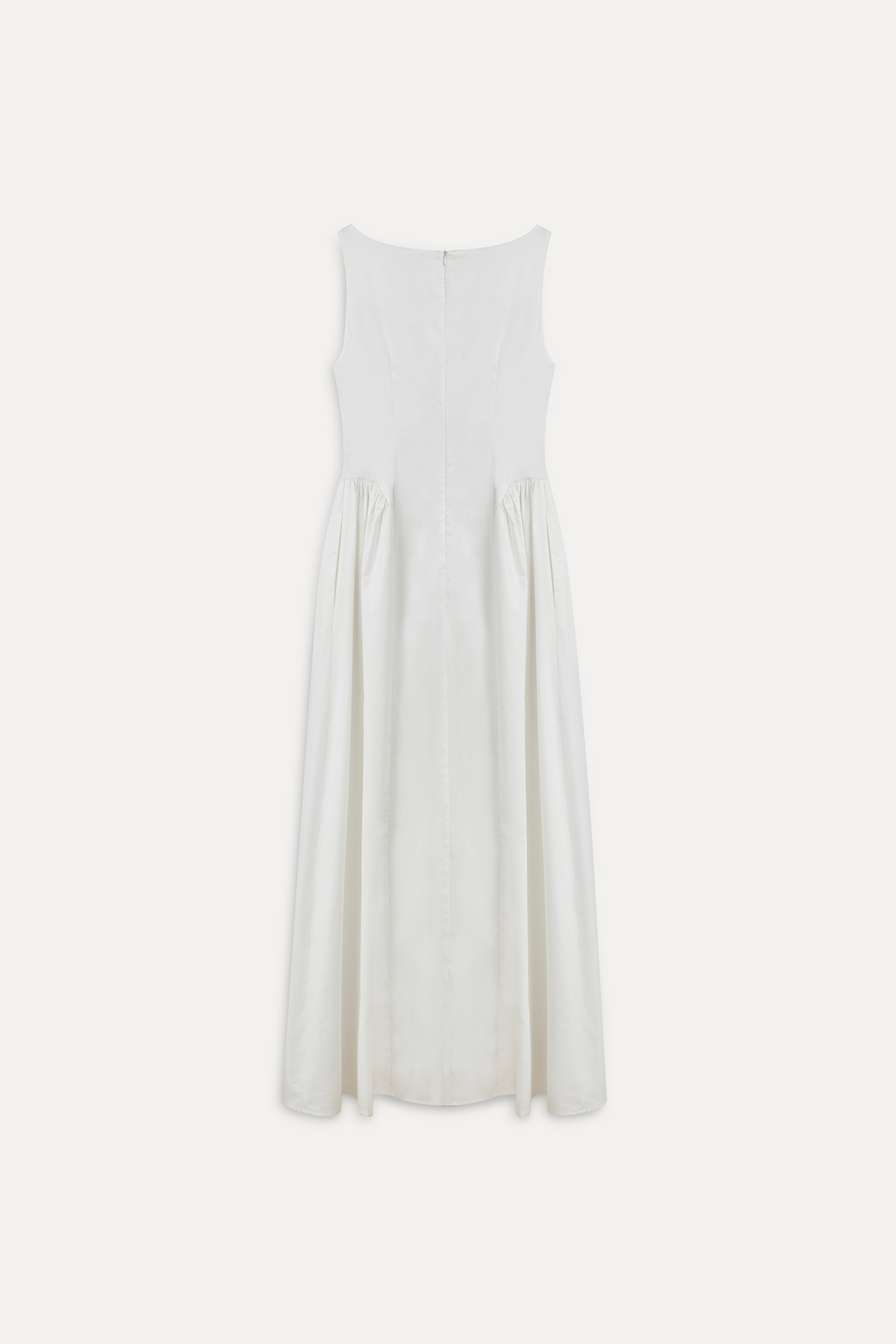 Kayık yaka, tam kalıp, askılı, maxi, astarlı, poplin elbise.