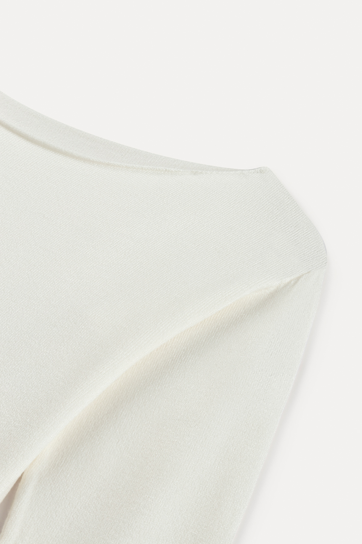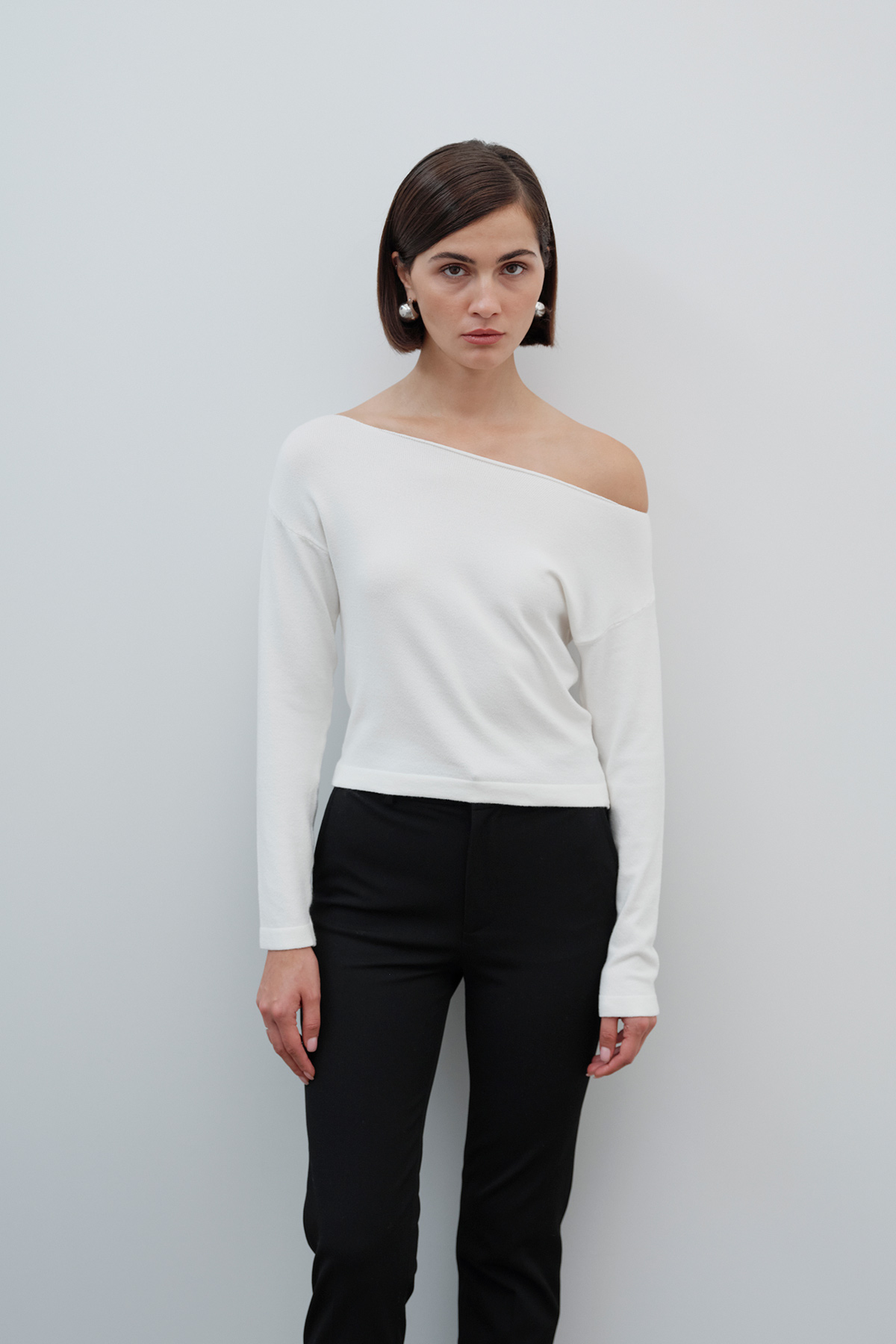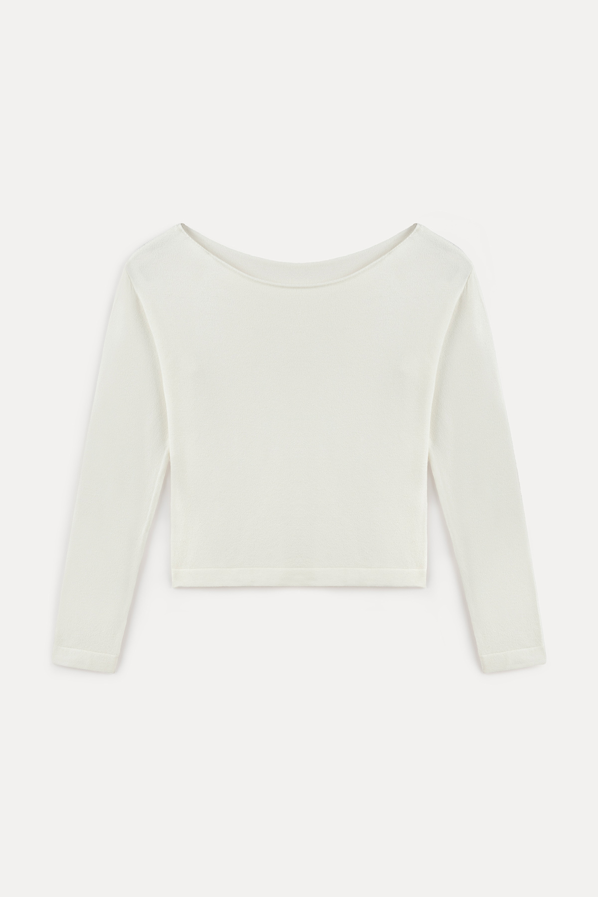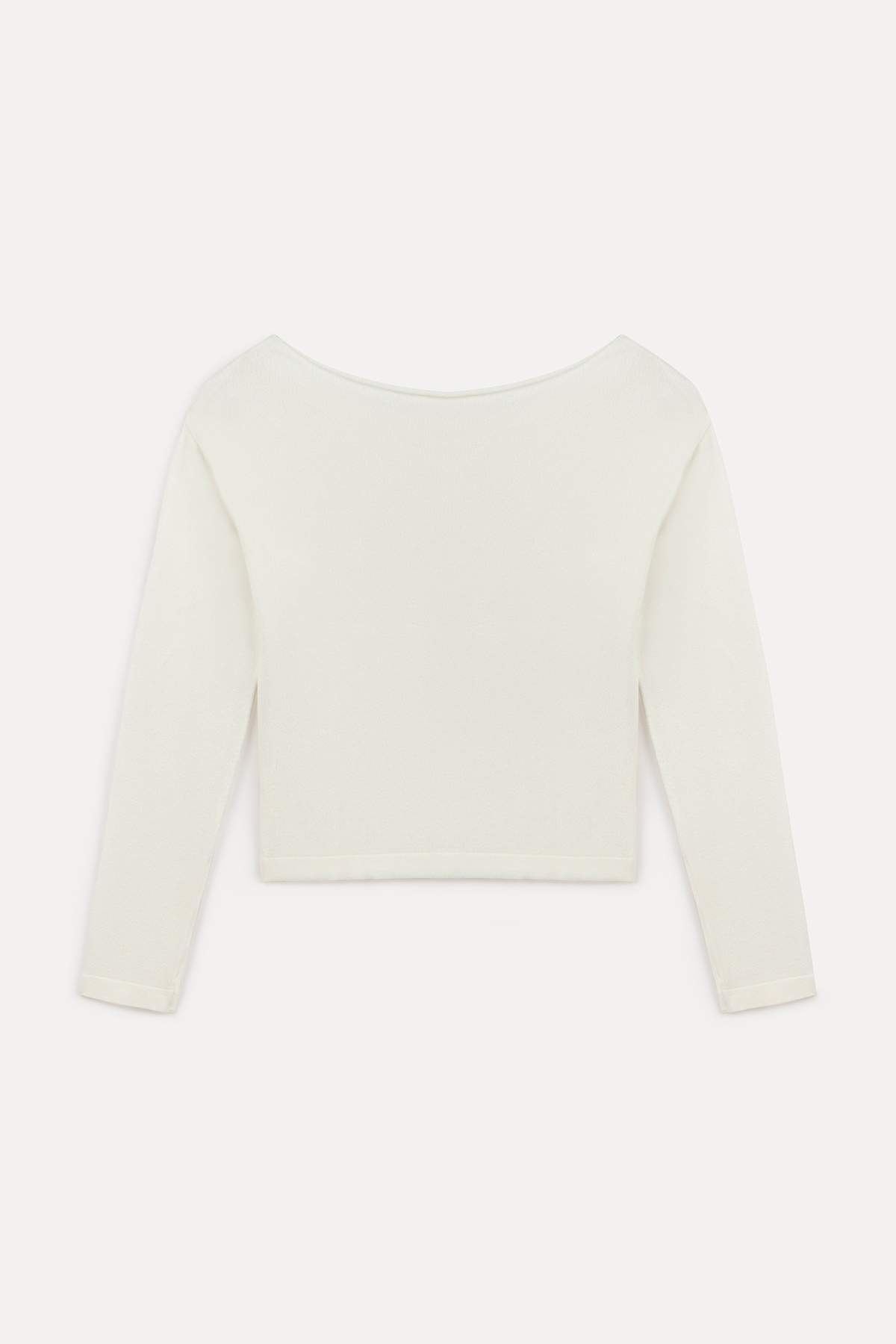 Kayık yaka, uzun kollu, omuzları açık, tam kalıp triko kazak