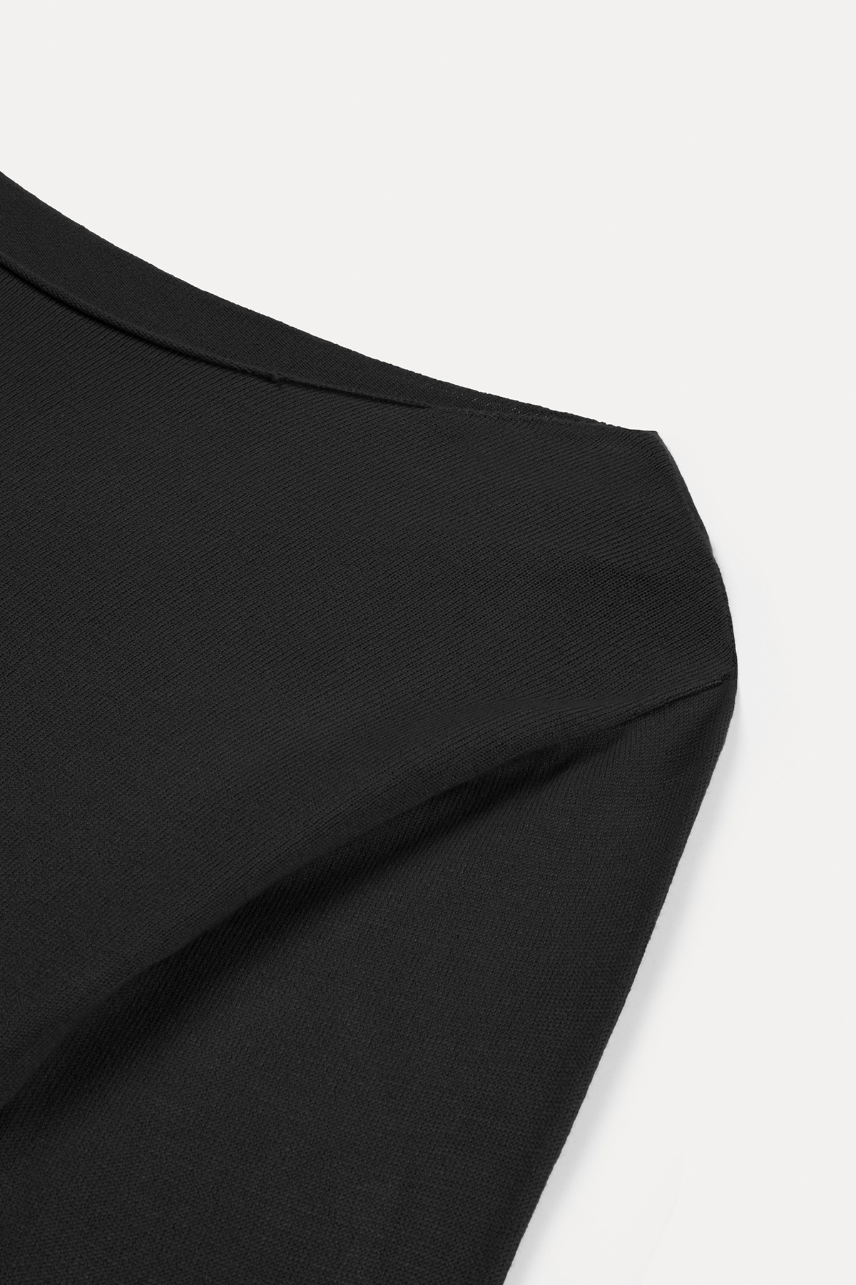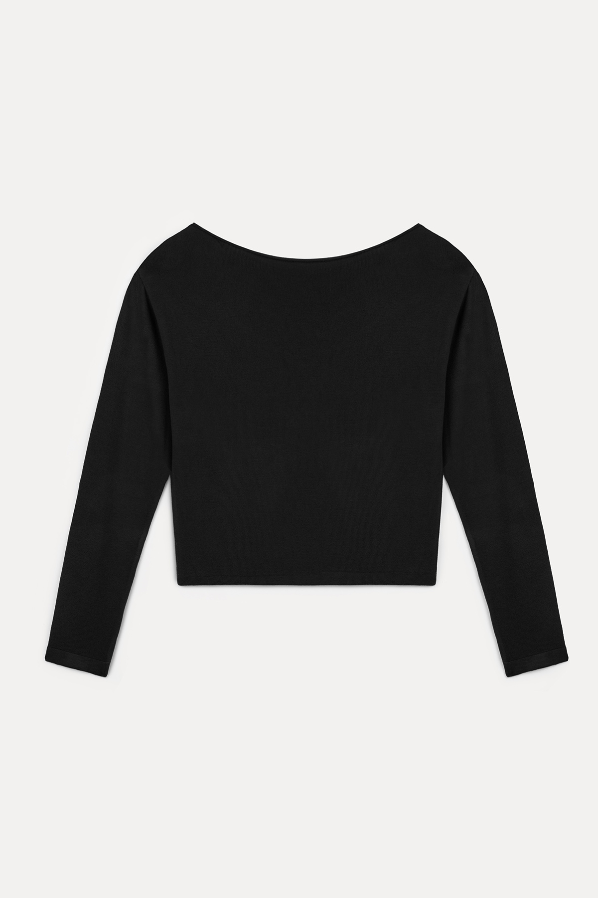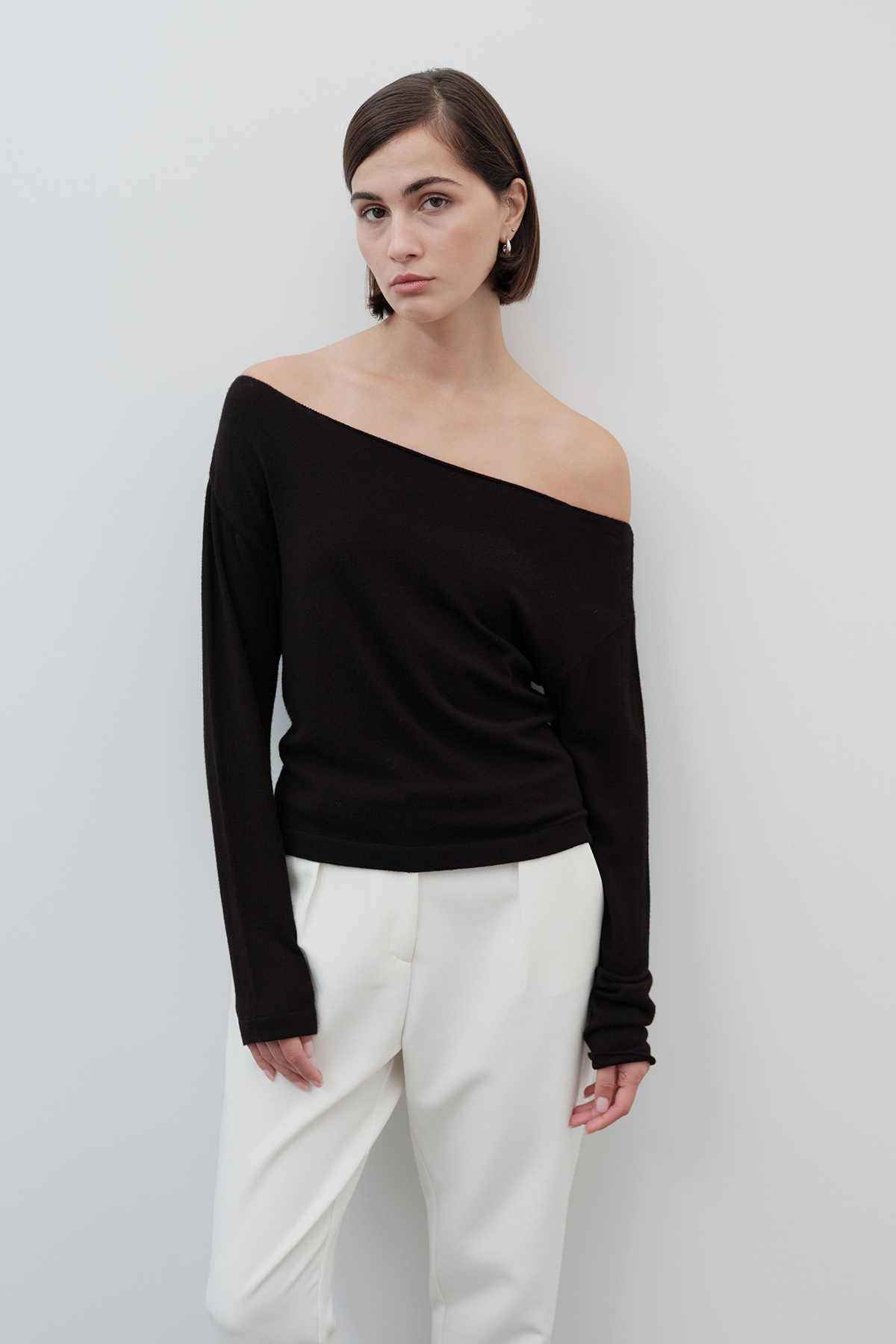 Kayık yaka, uzun kollu, omuzları açık, tam kalıp triko kazak