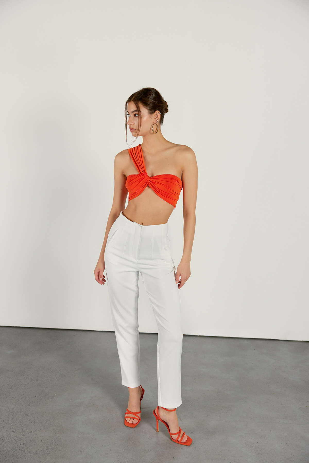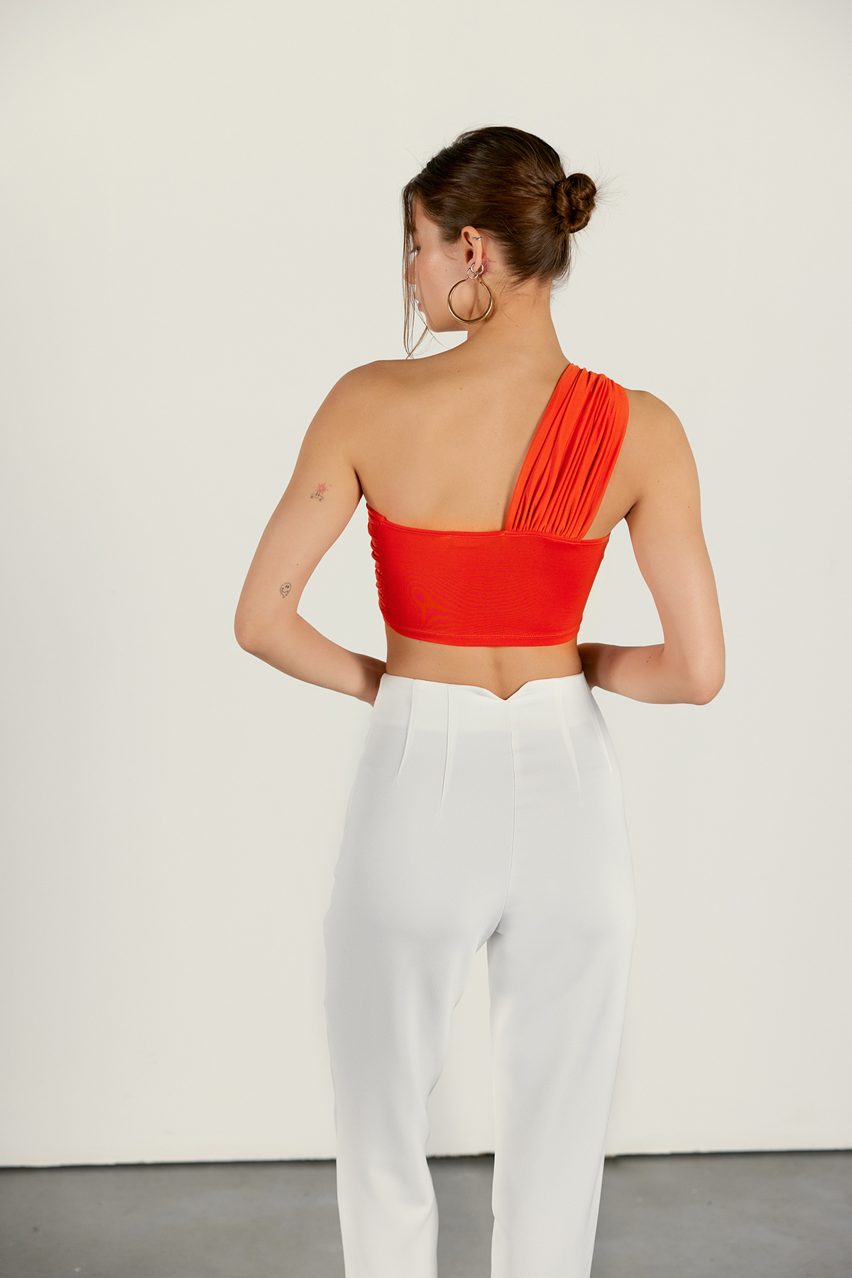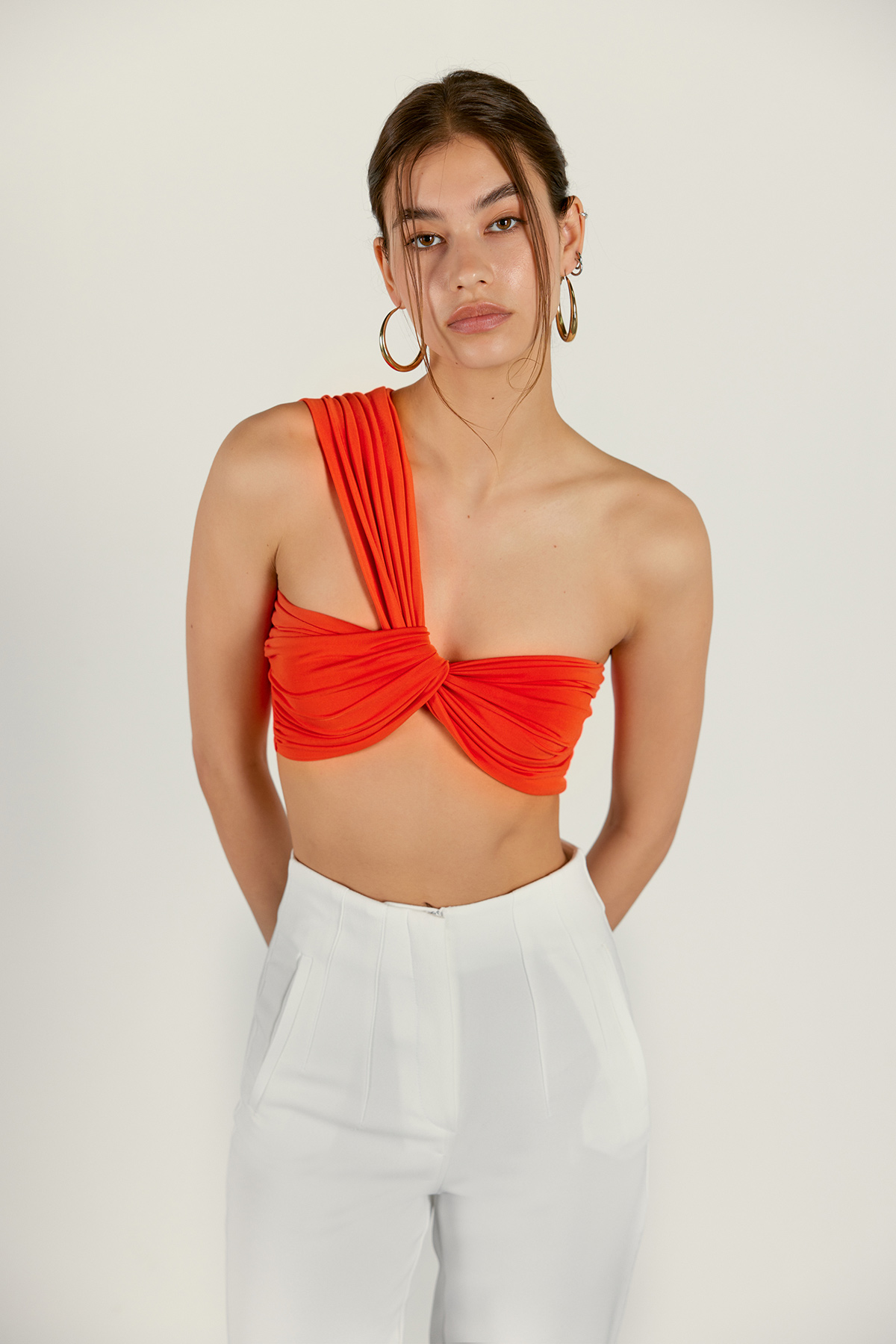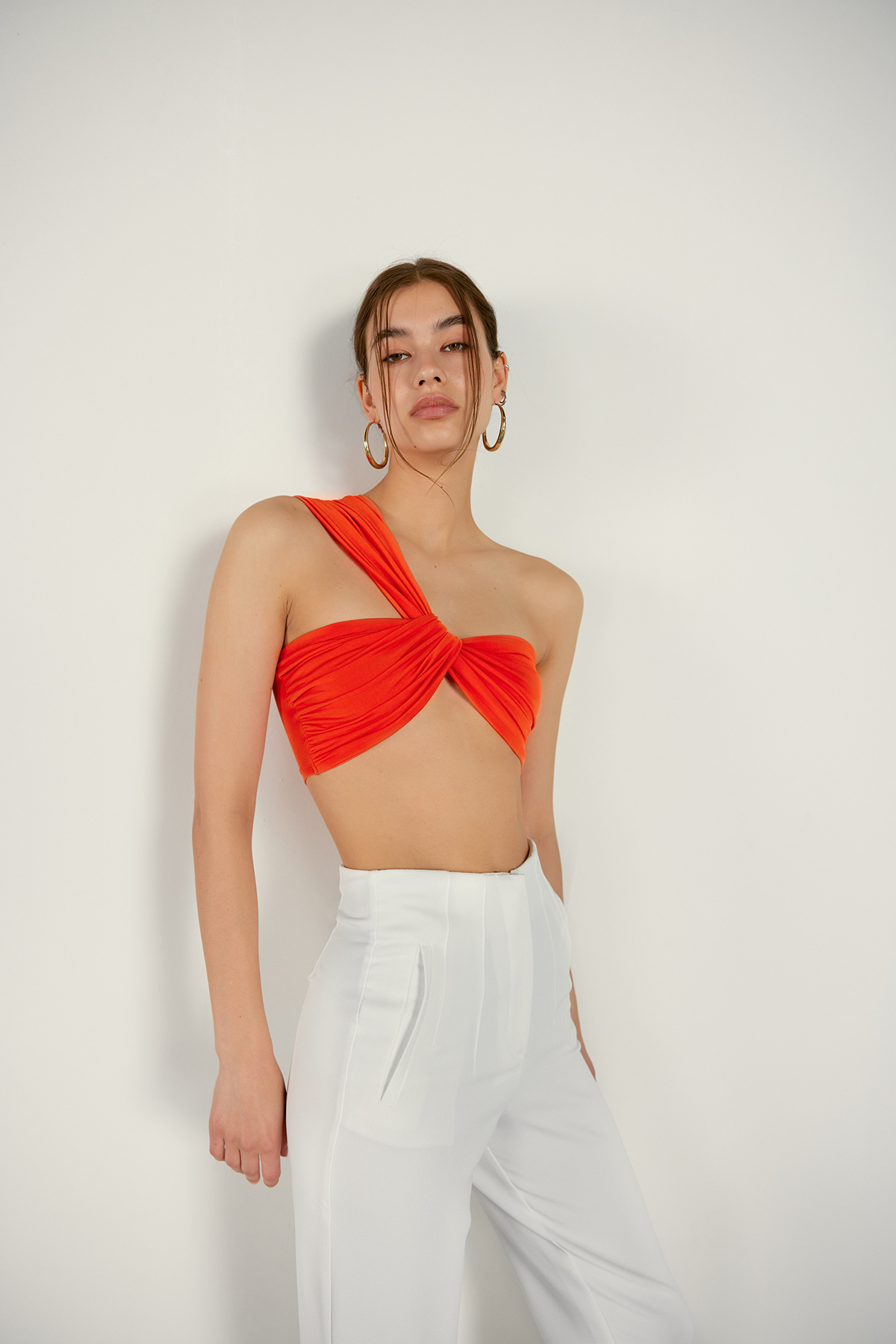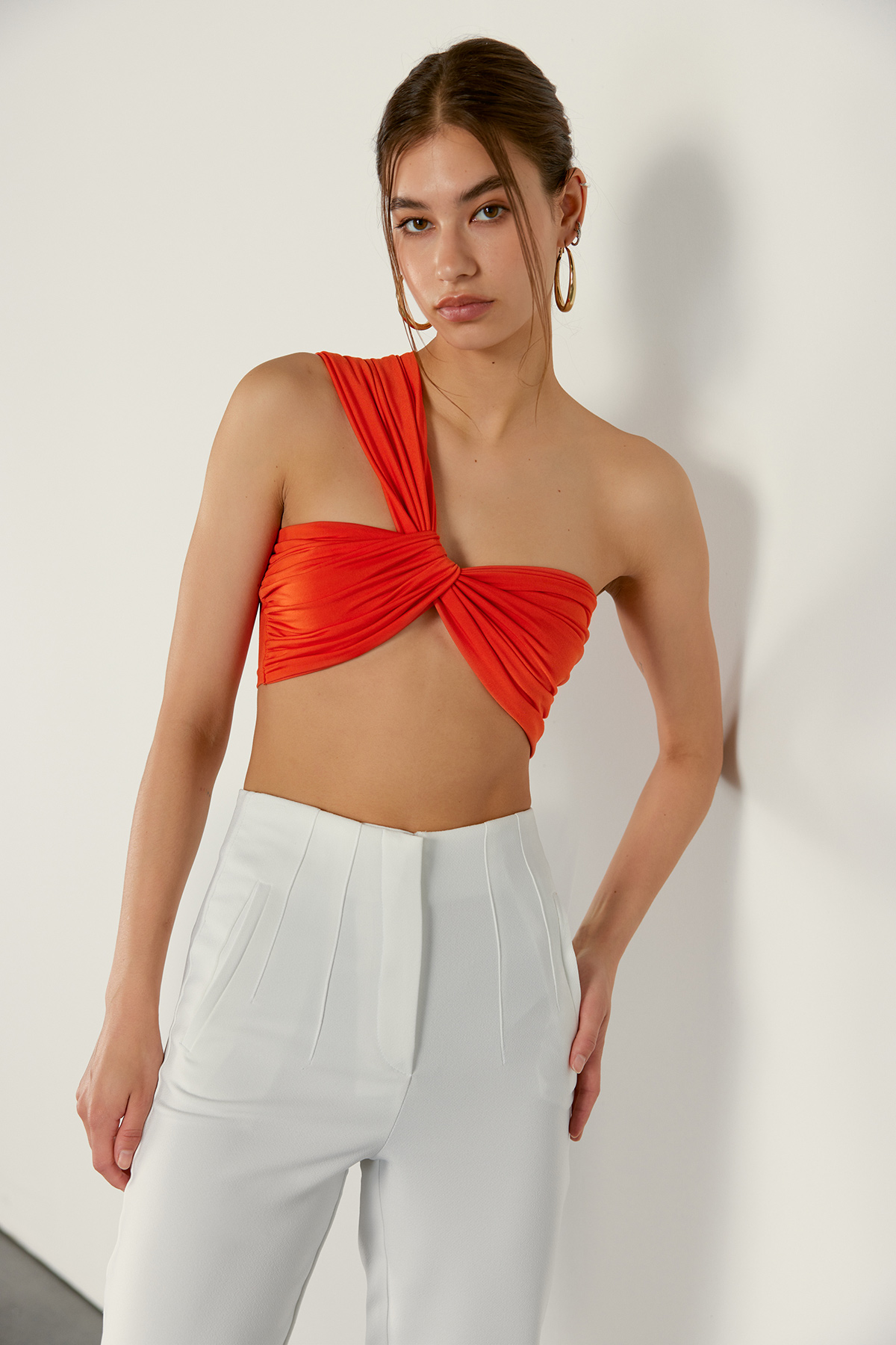 Tek omuz askılı,düğüm detaylı,yanları drapeli kadın bluz.