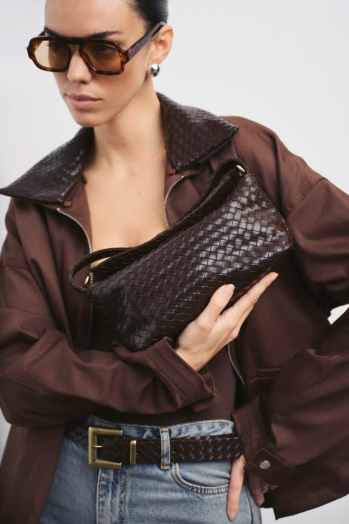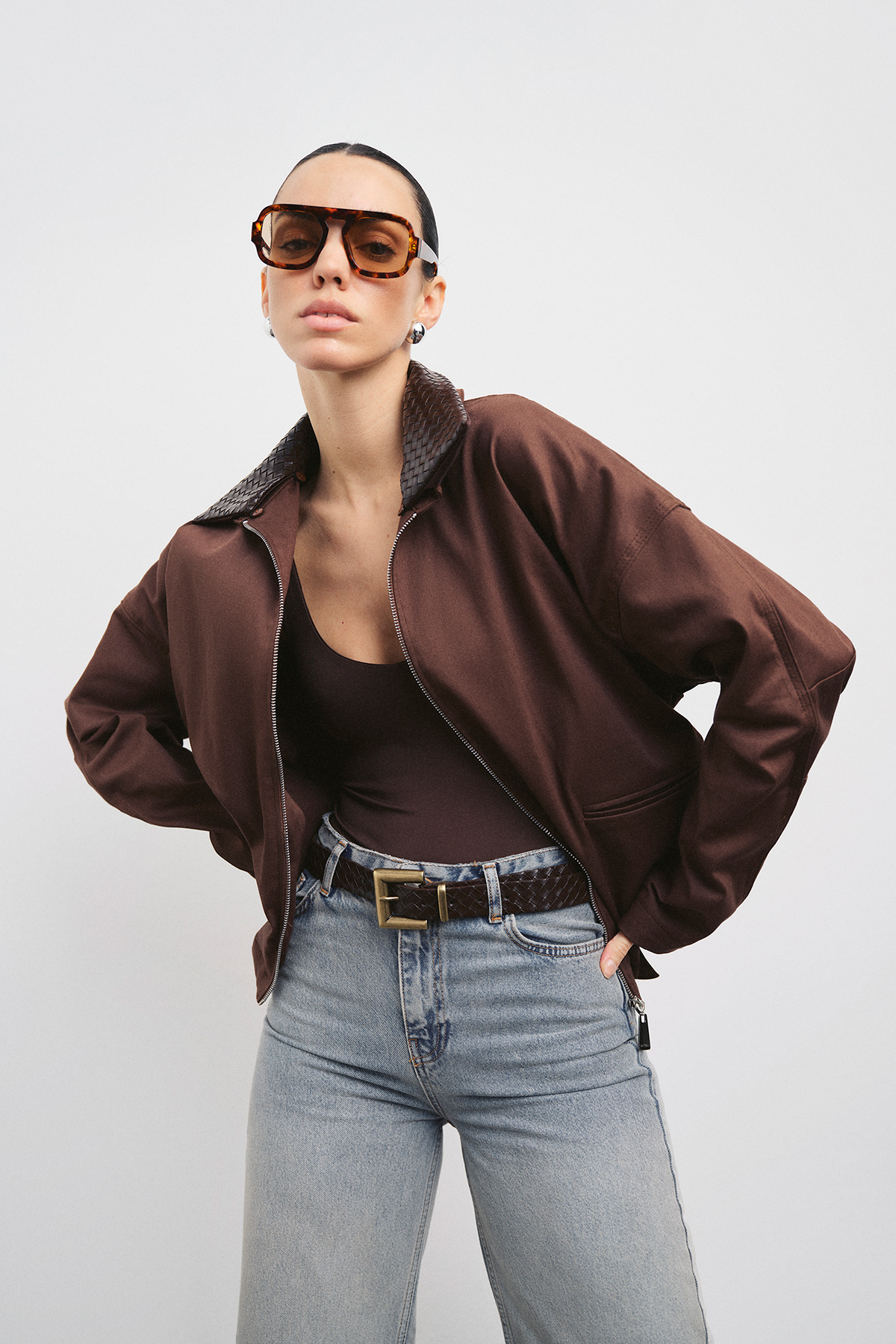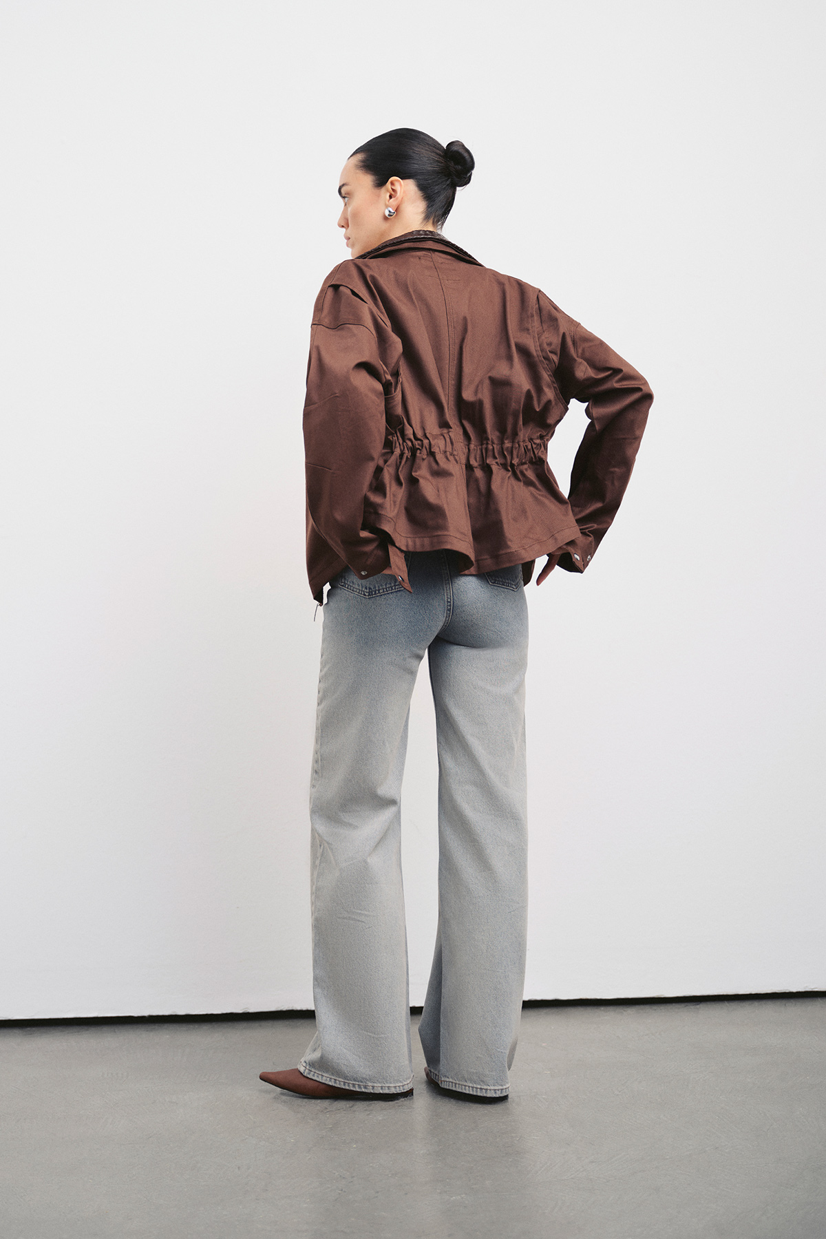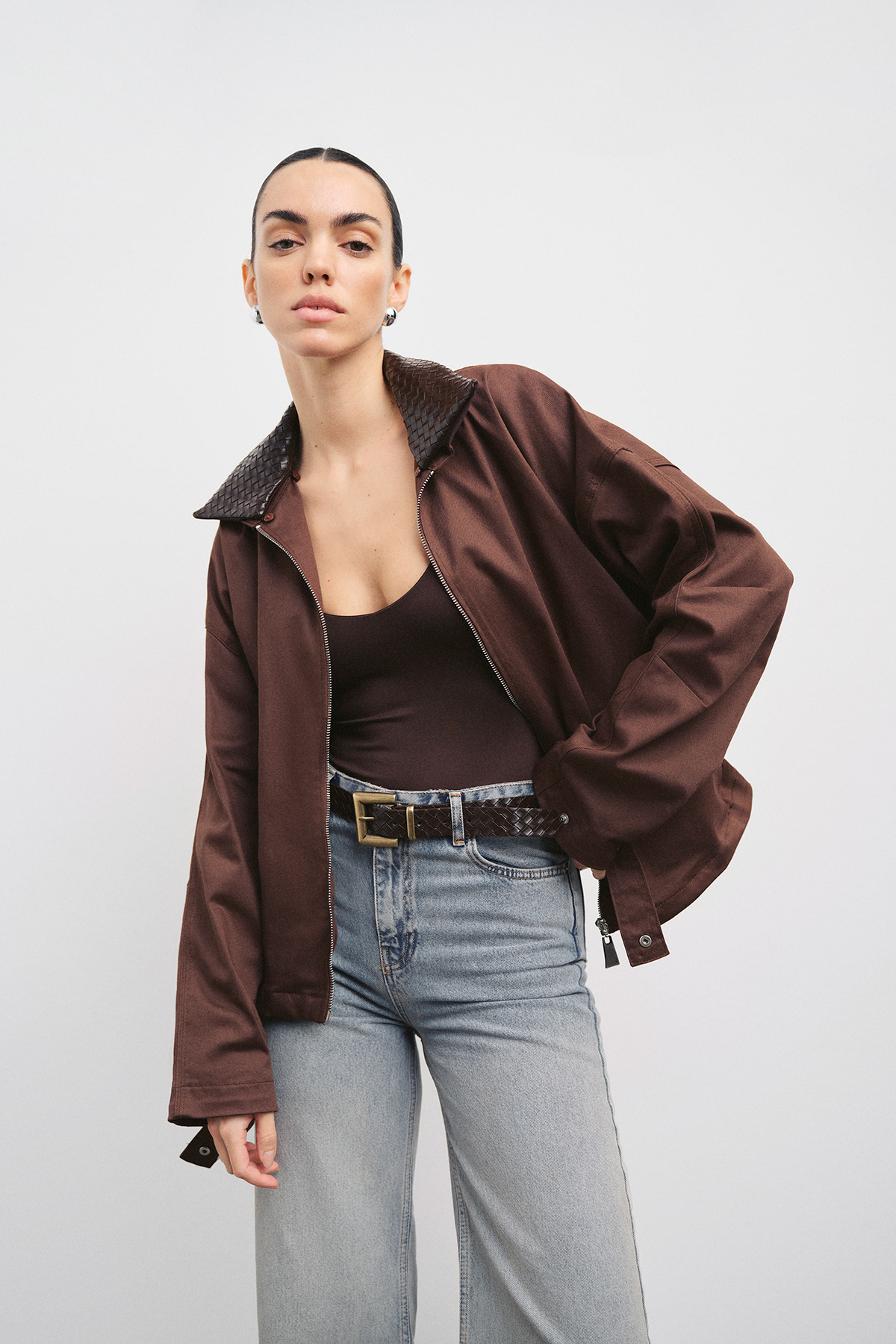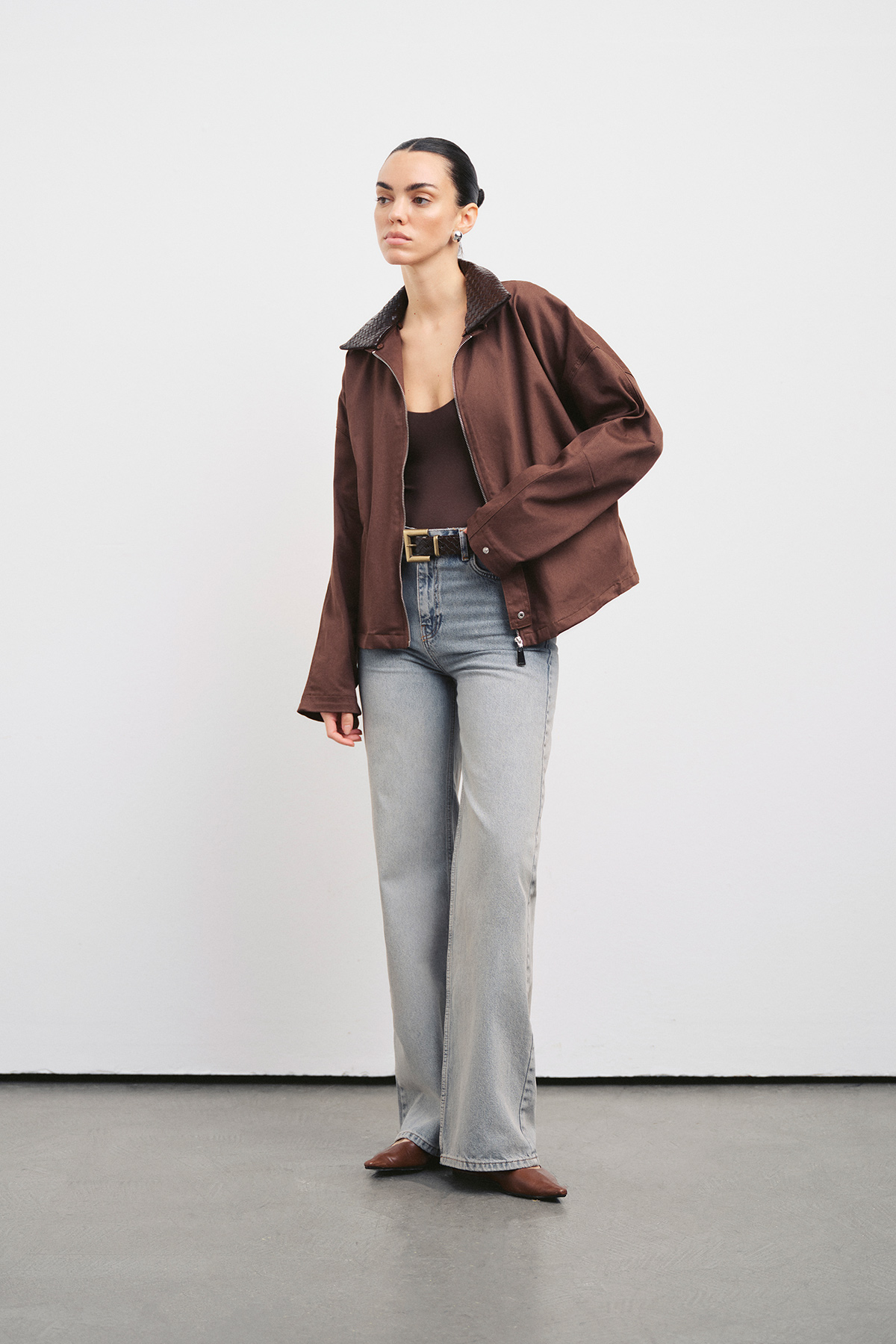 Deri kontrast yakalı,cepli,fermuarlı,çıkarılabilir yaka, oversize kalıp.