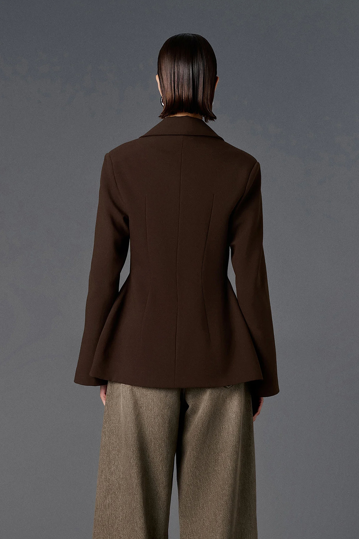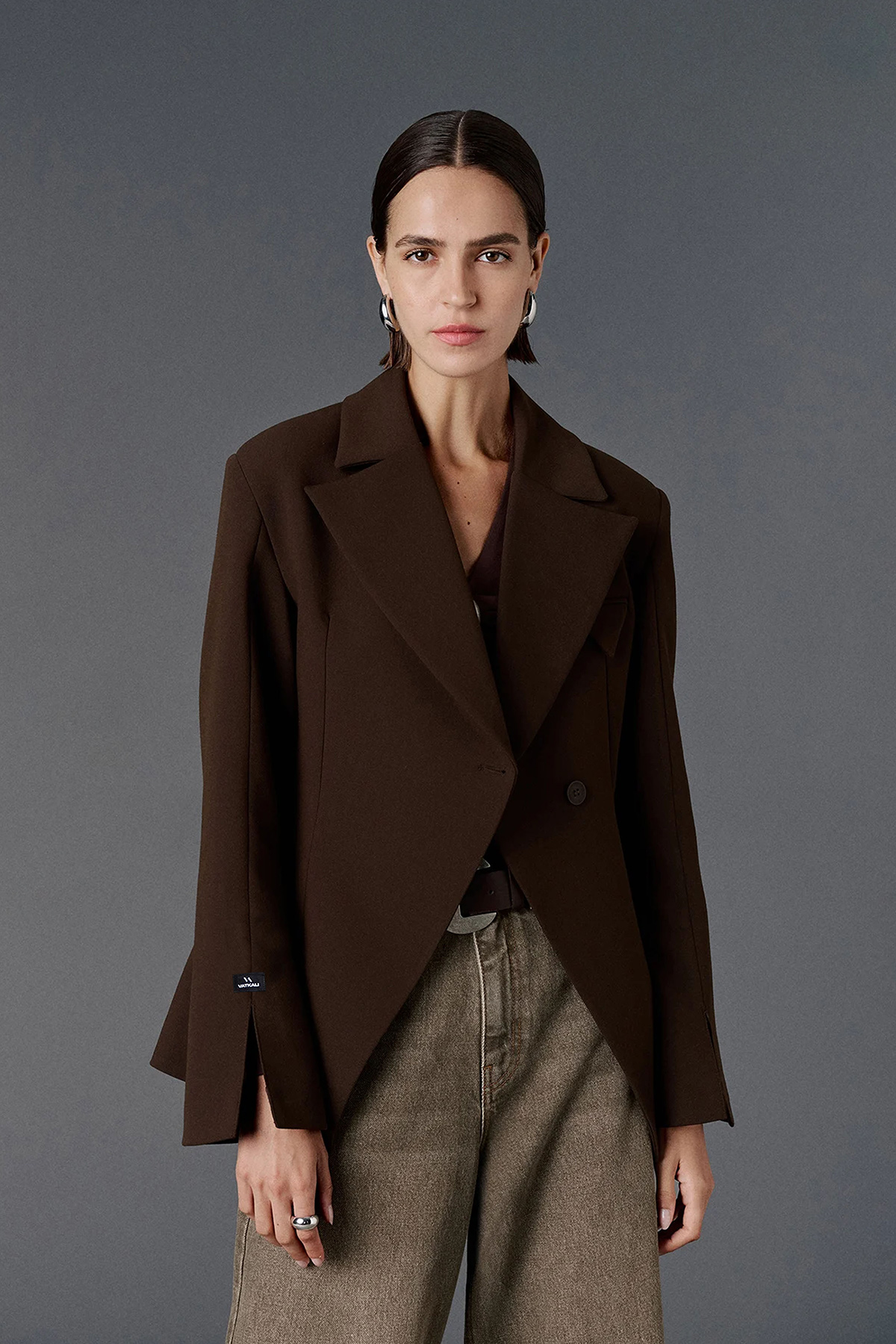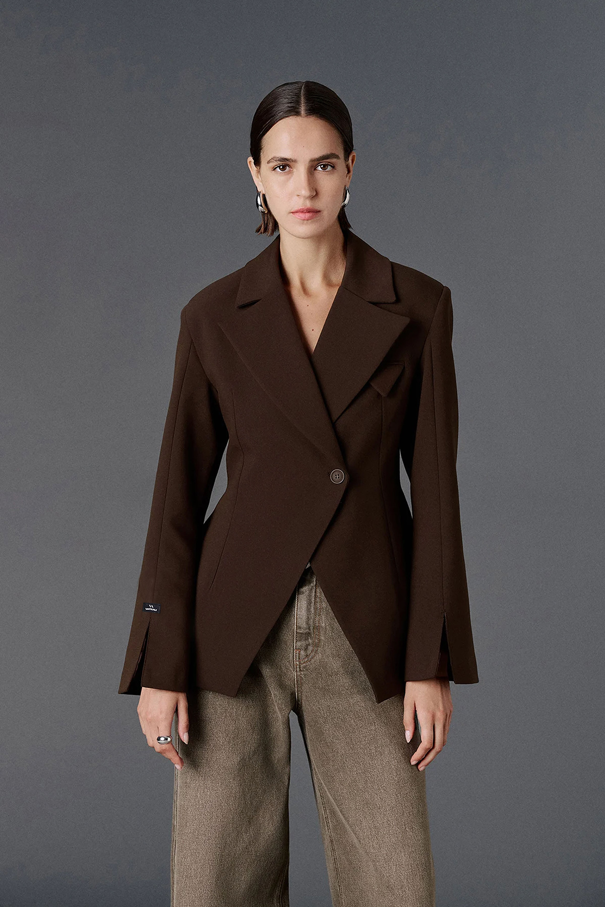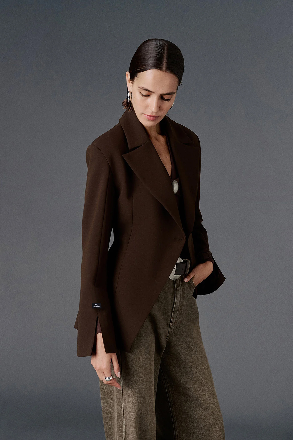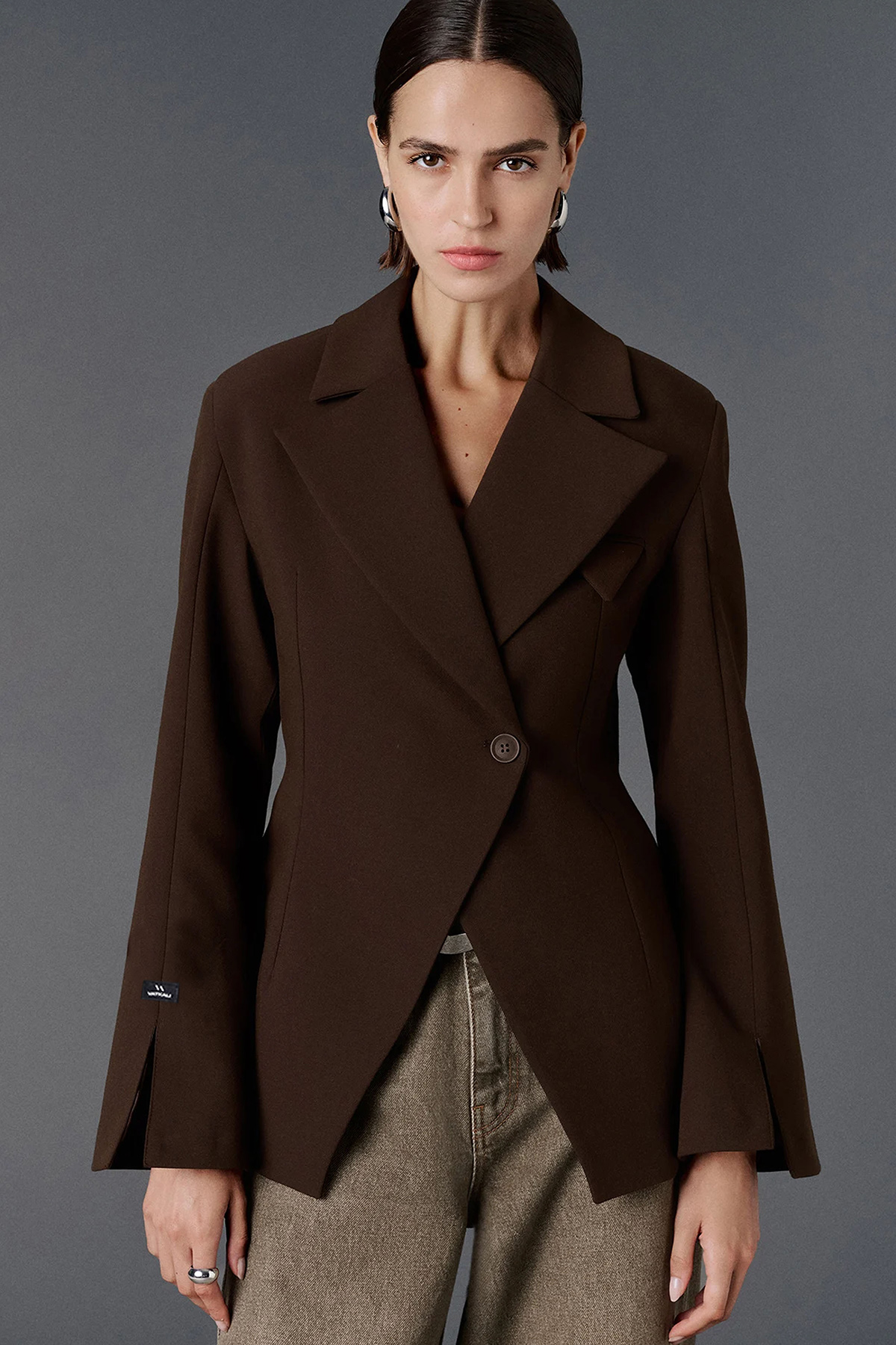 Vatkalı, tek düğmeli, uzun kollu, manşeti yırtmaçlı, kruvaze yaka, astarlı, vücuda oturan blazer ceket.
