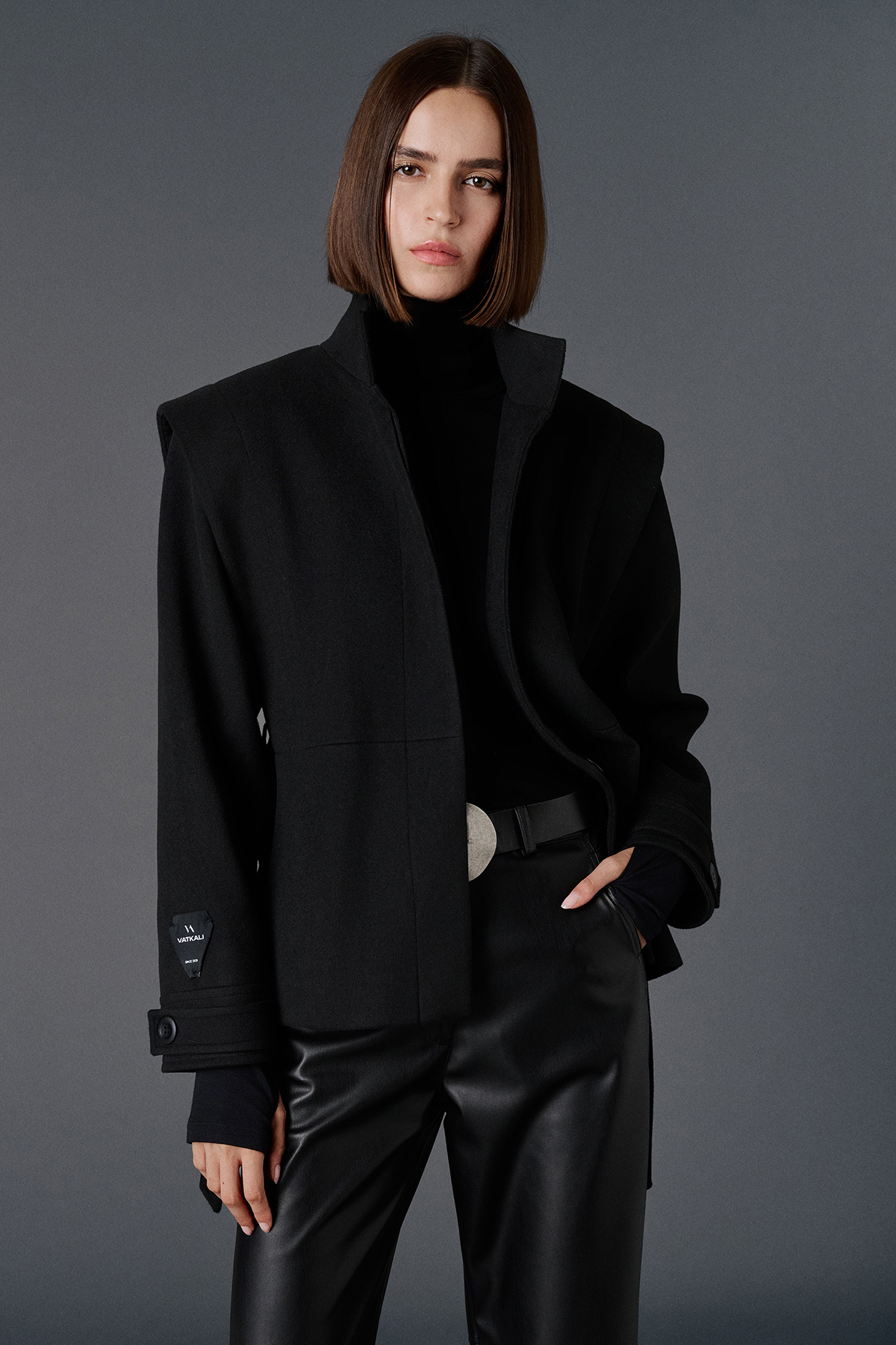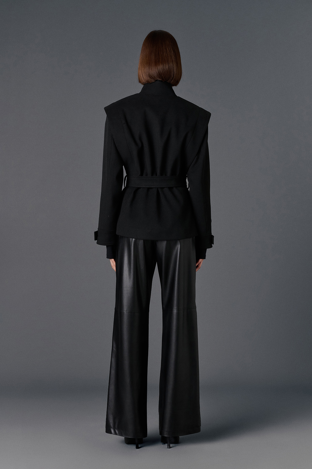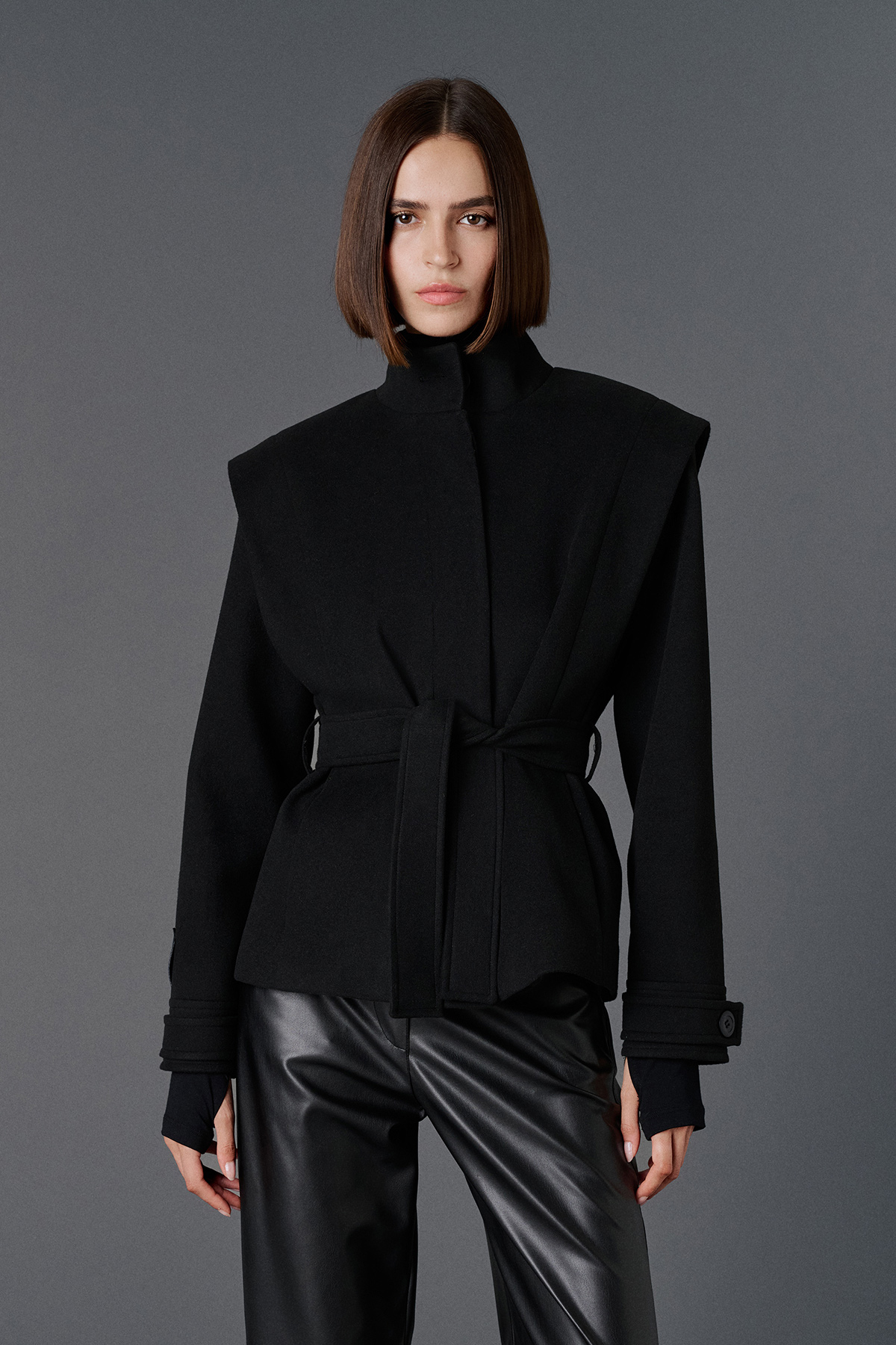 Kuşaklı, dik yaka, astarlı, vatkalı, 2 cepli, gizli düğme kapamalı, manşeti logo detaylı, kısa kaşe kaban.