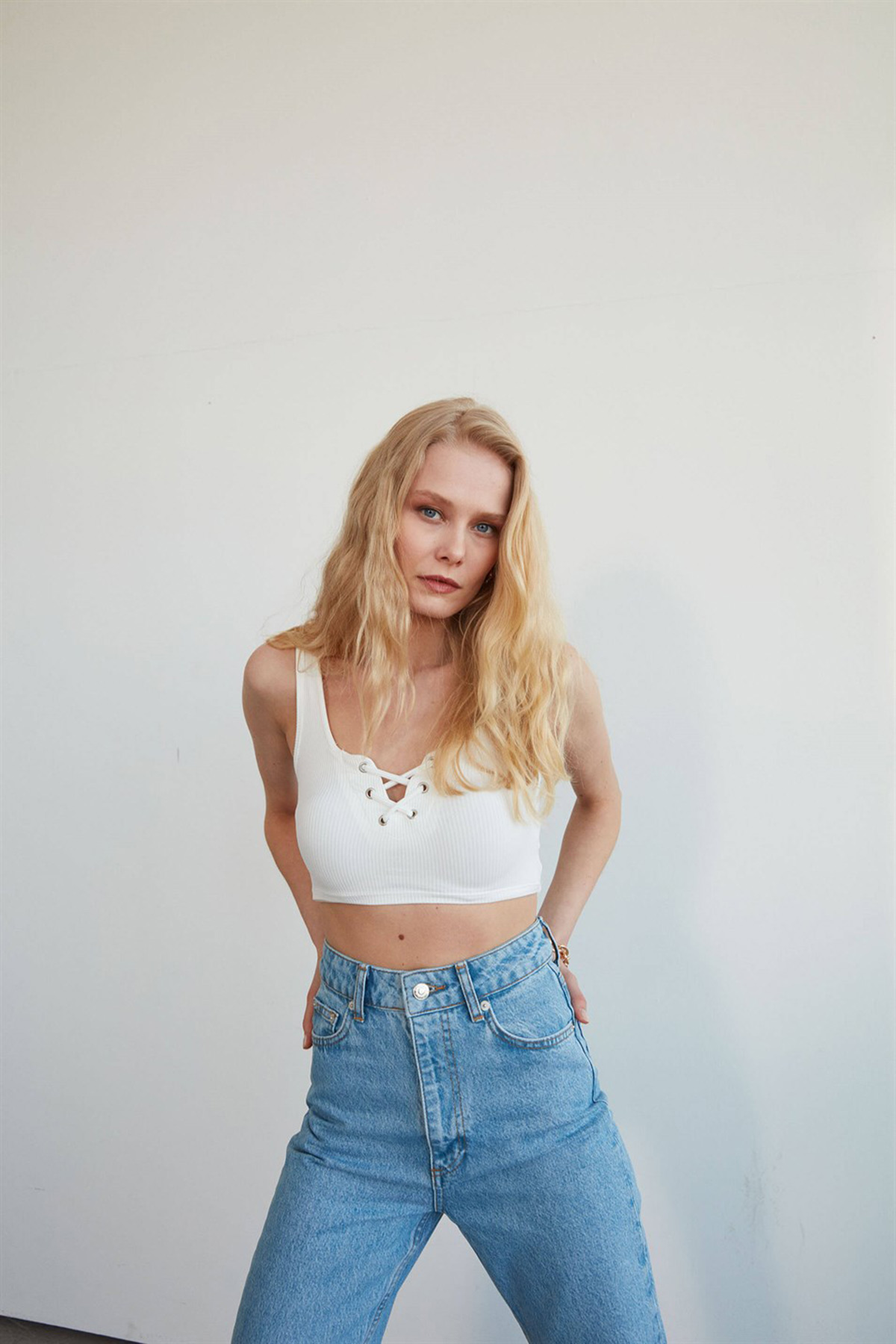 Kalın askılı, fitilli, önü bağcık model kadın crop top.