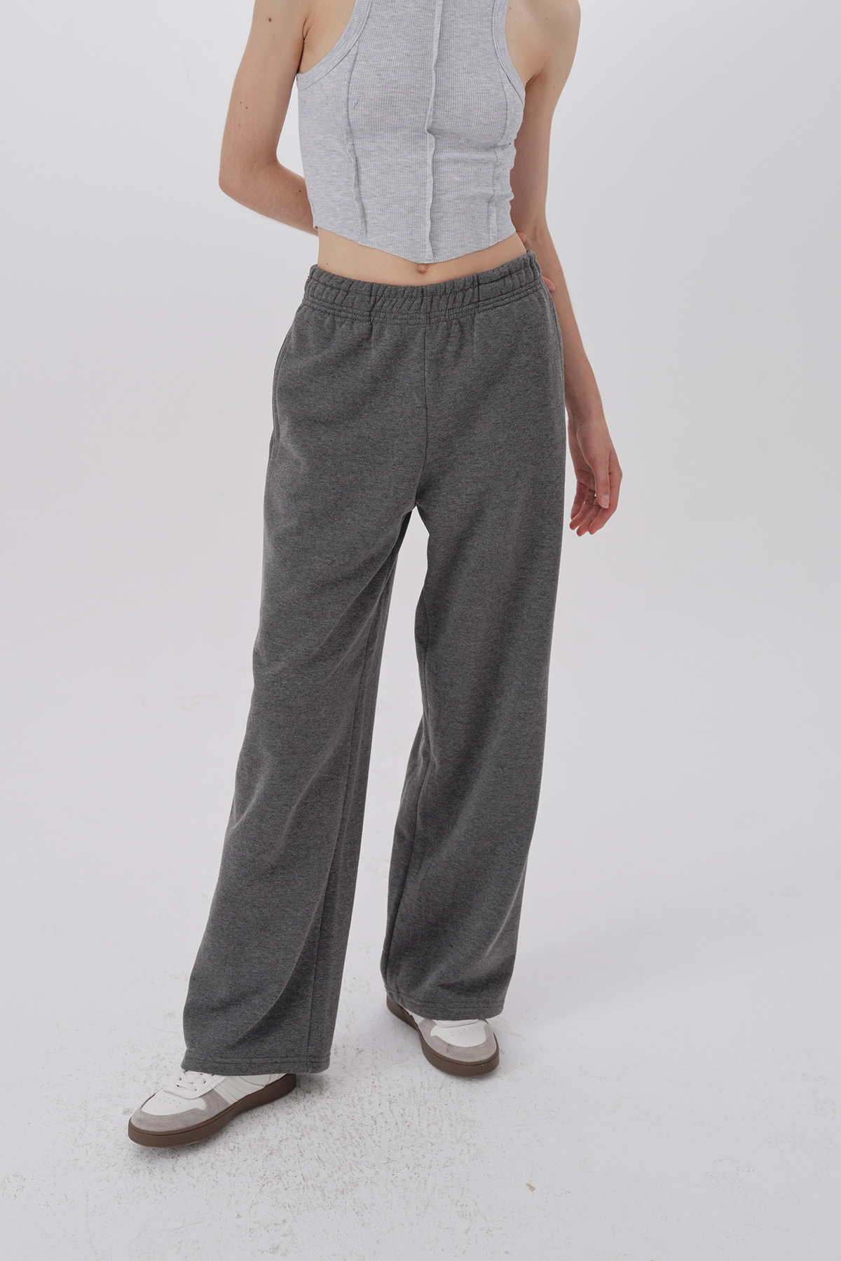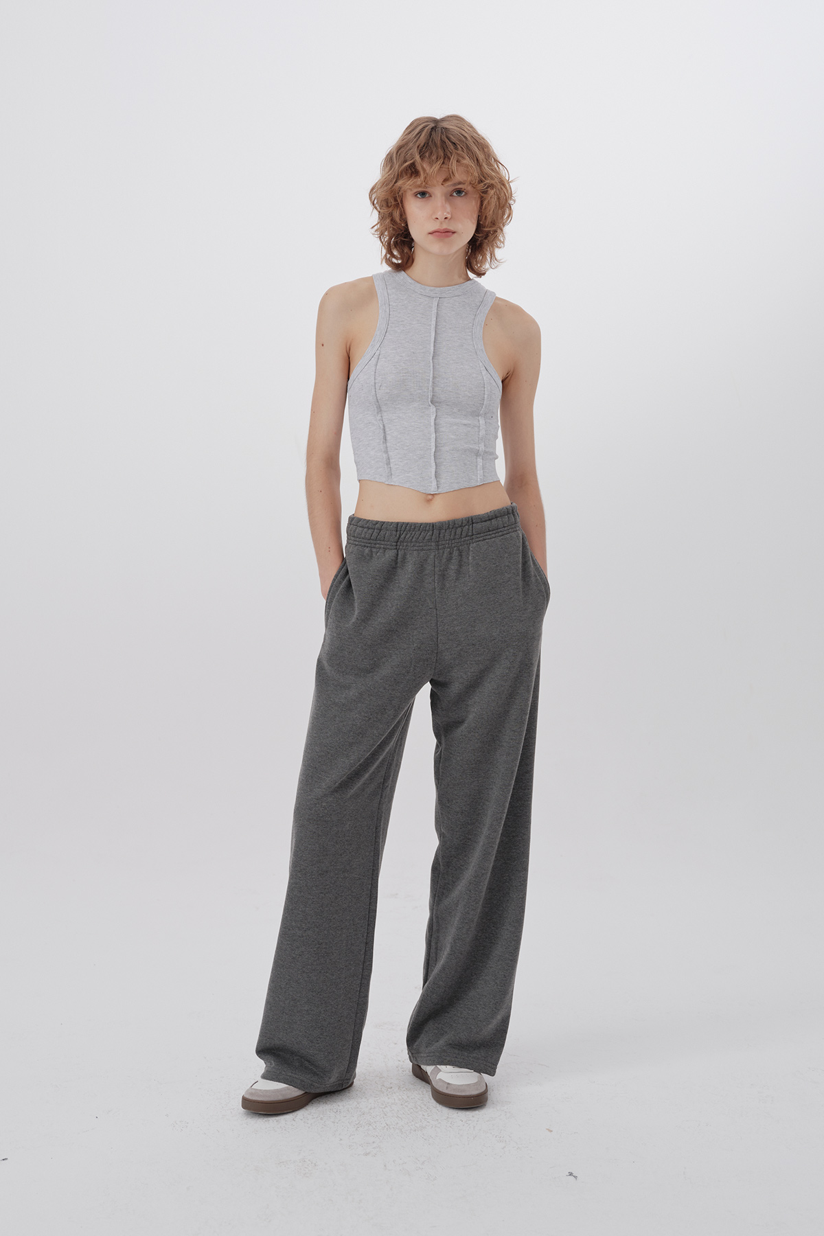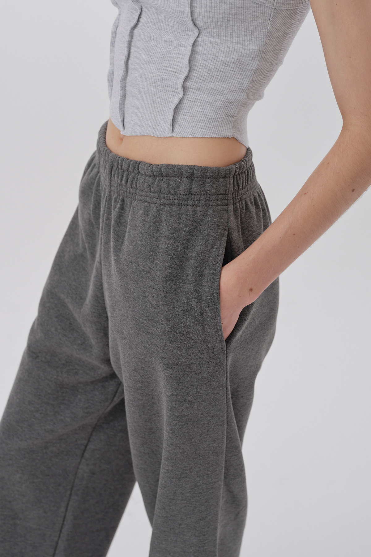 Yüksek bel, beli lastikli, yandan 2 cepli, tam kalıp jogger pantolon.