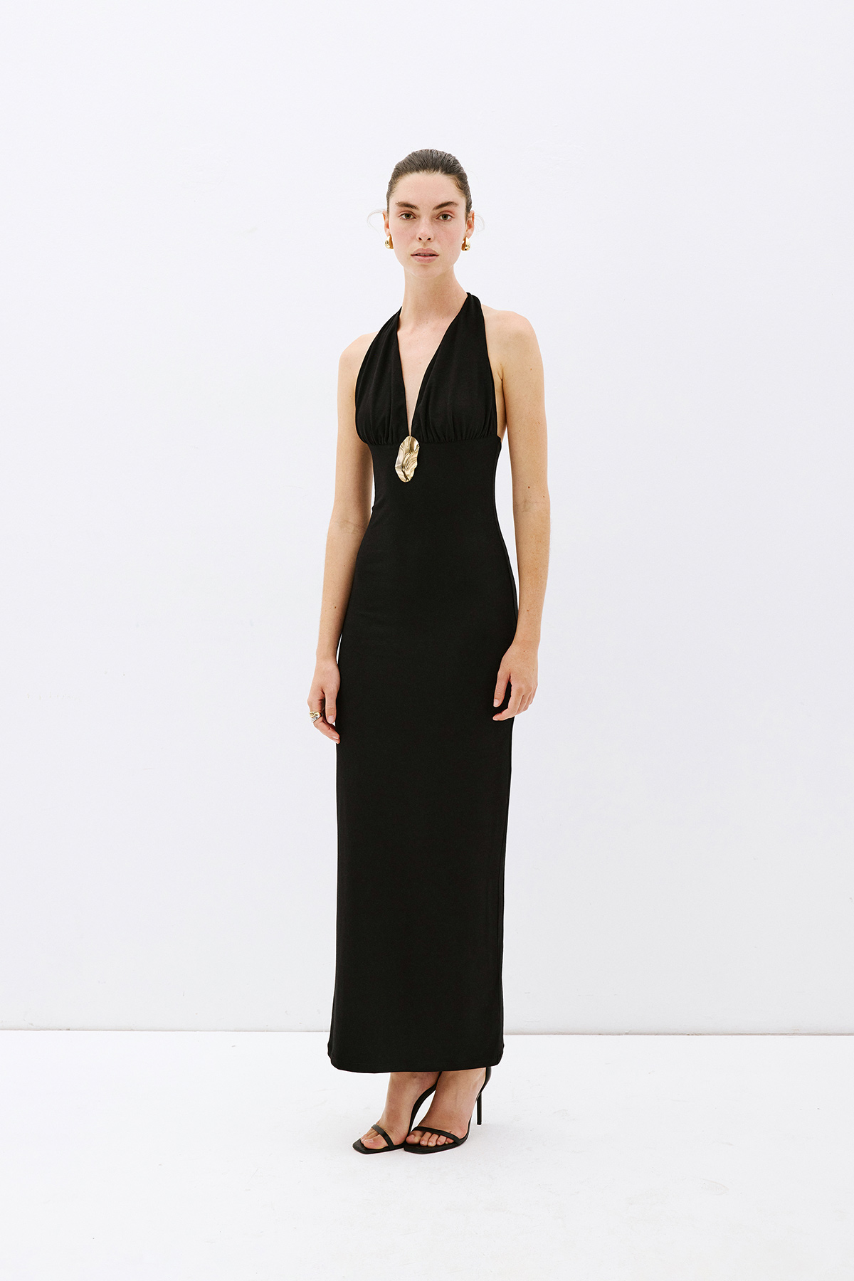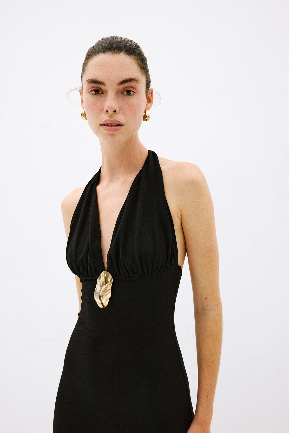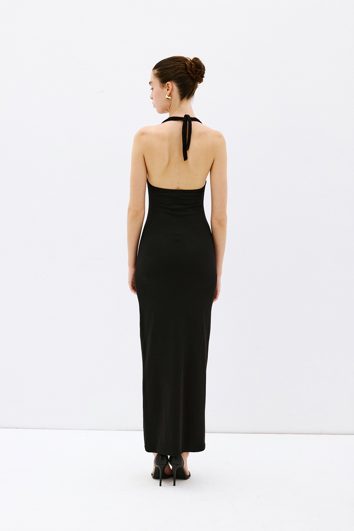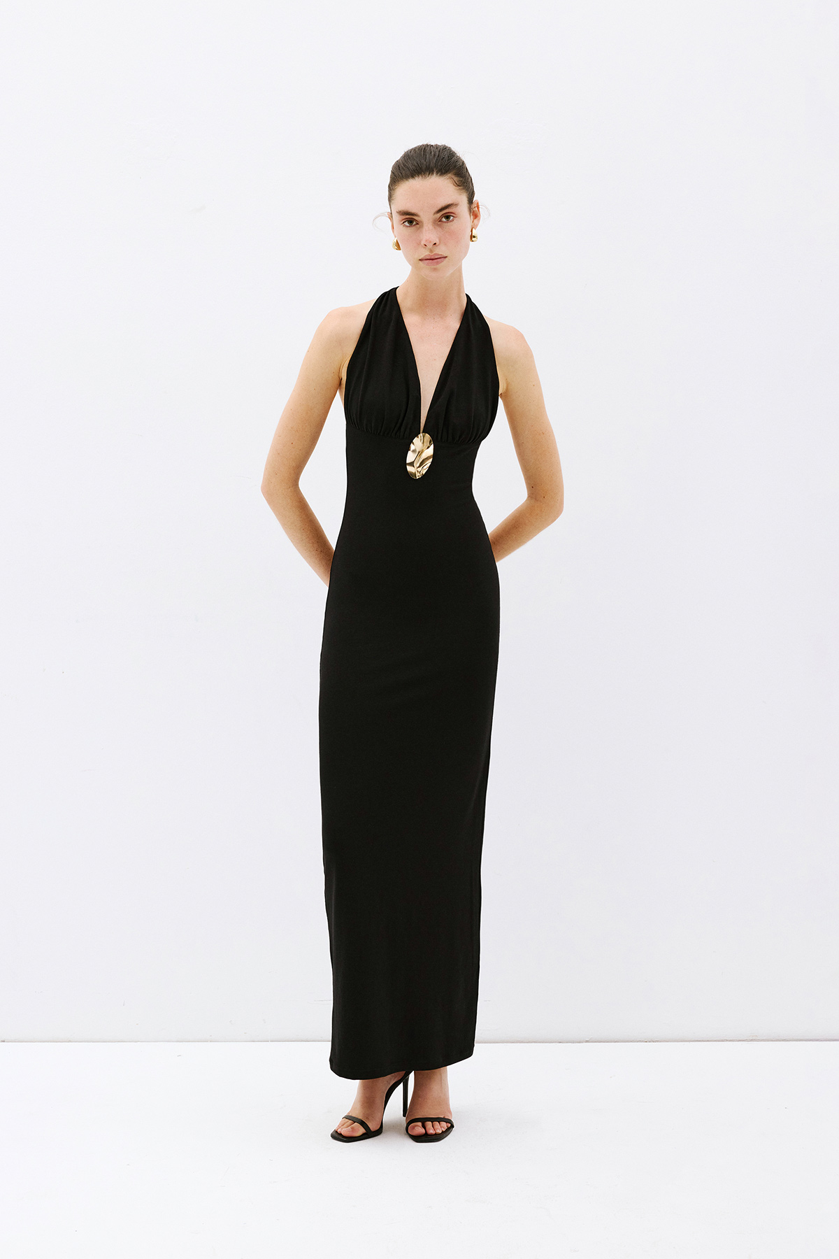 Derin V yaka, boyundan bağlamalı, metal aksesuar detaylı, vücuda oturan premium maxi elbise.