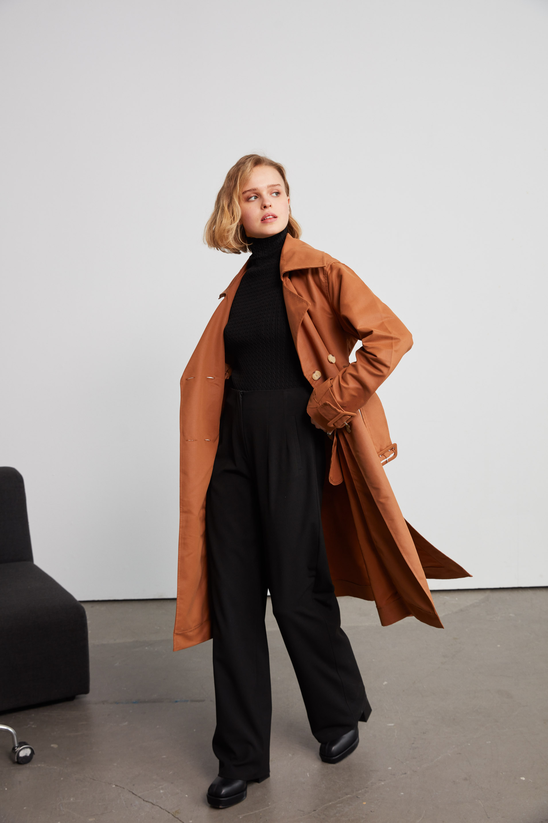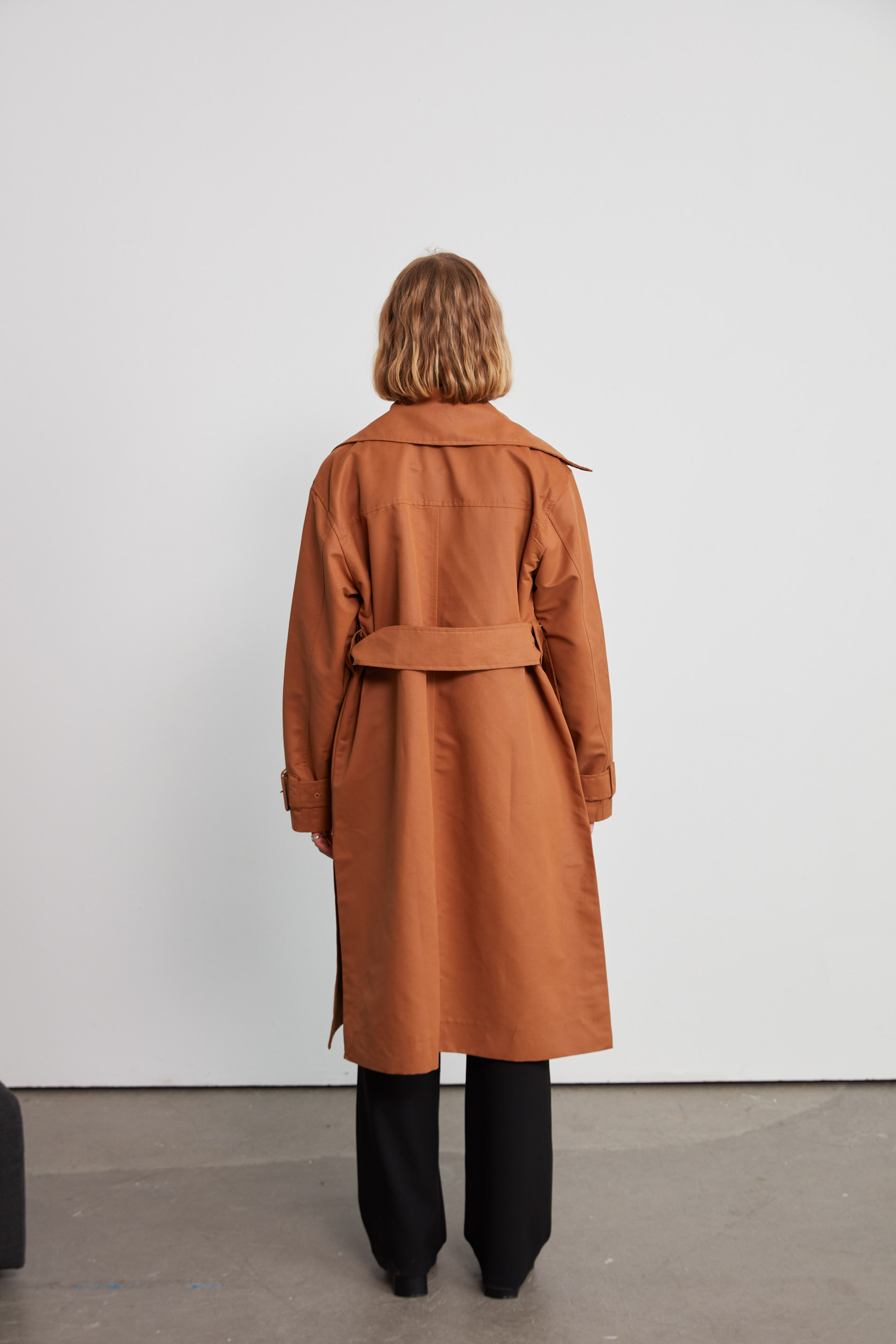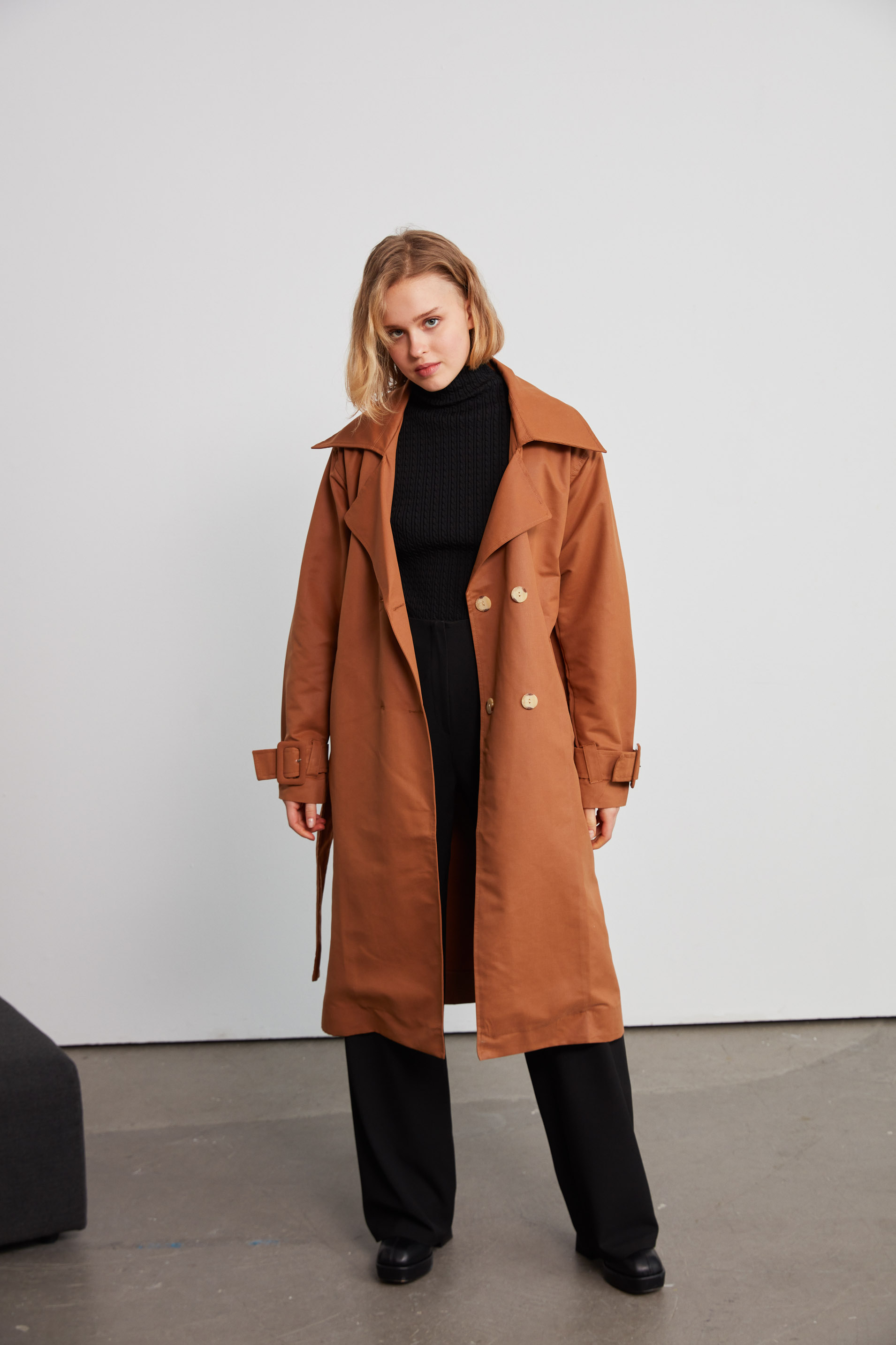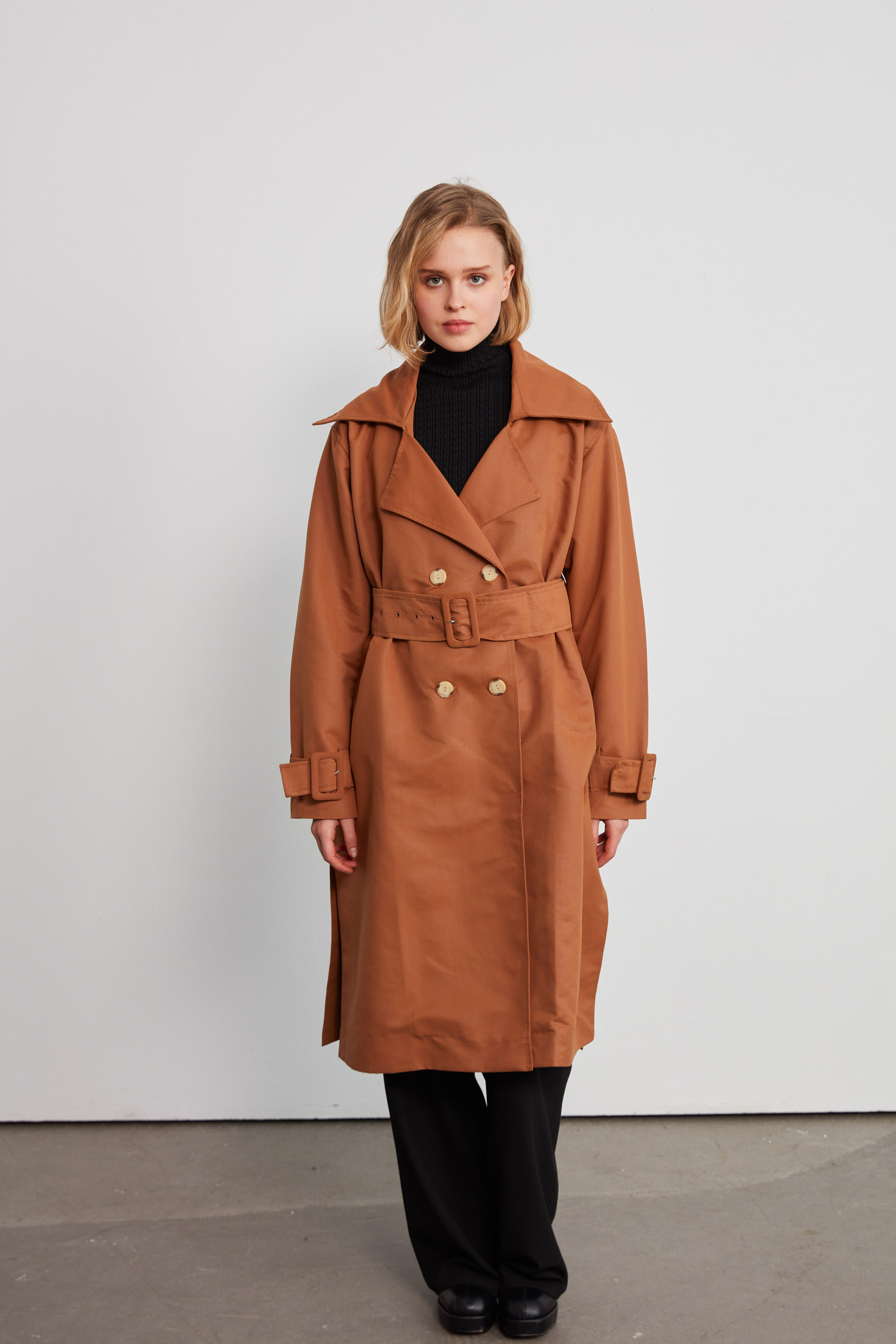 Kruvaze yaka, kemerli ve düğmeli,yanları yırtmaç detaylı, astarlı, kol ucu kemer detaylı oversize trençkot.