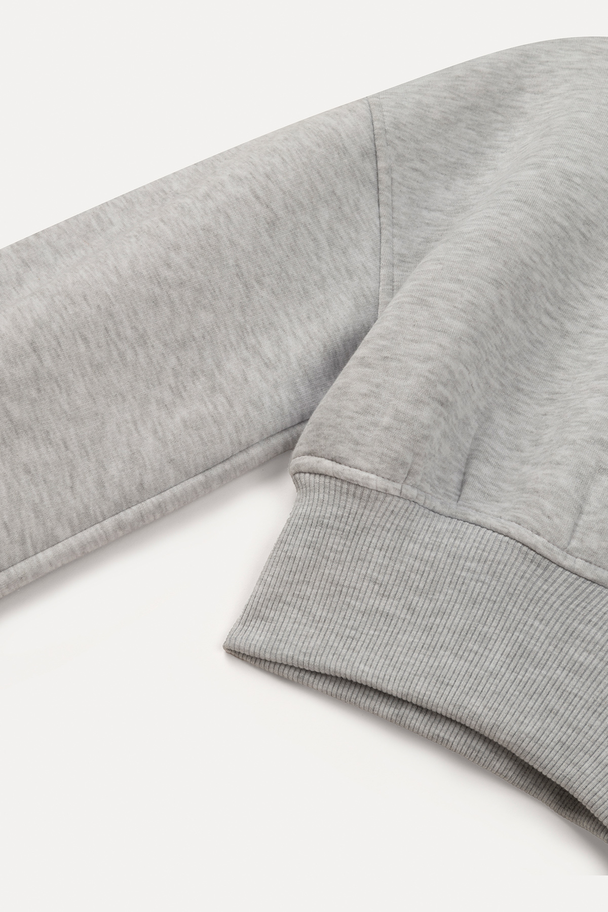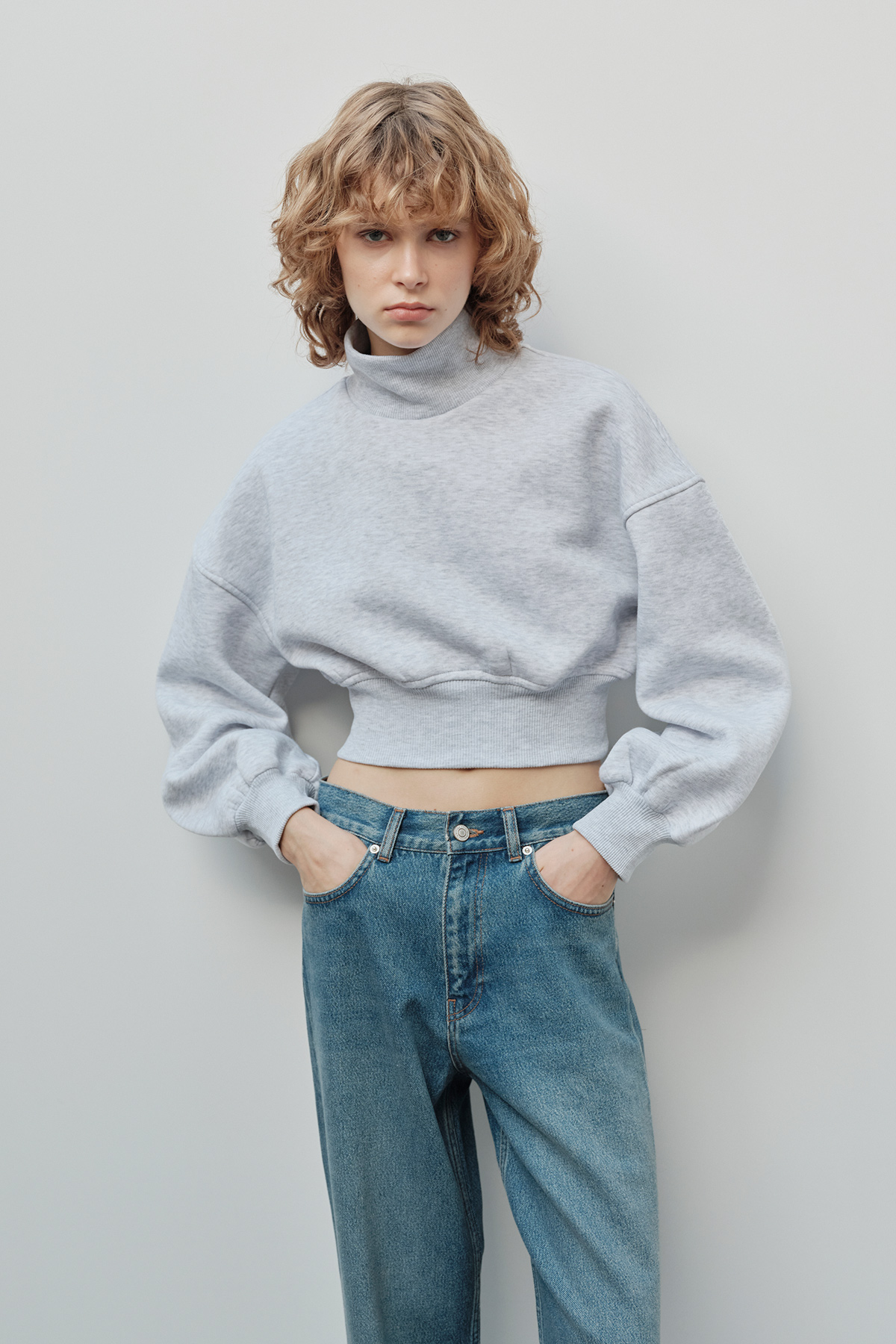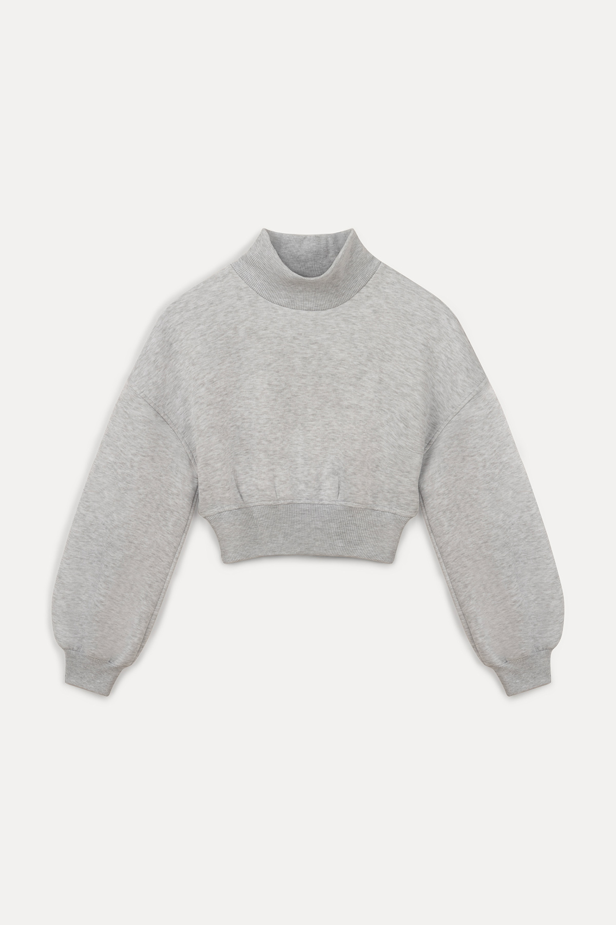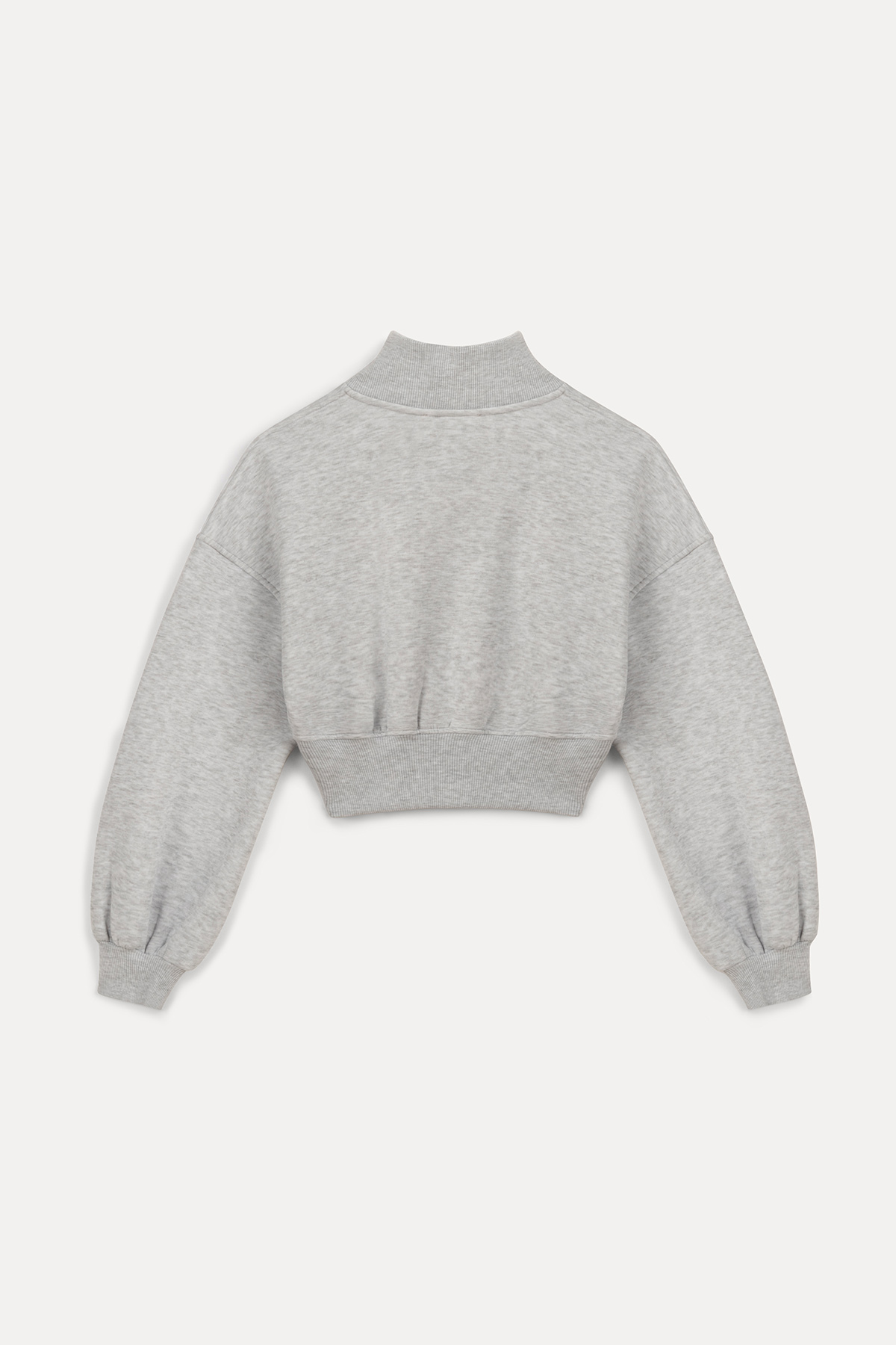 Dik yaka, balon kollu, beli elastik bantlı, oversıze kalıp, pamuklu crop sweatshirt.