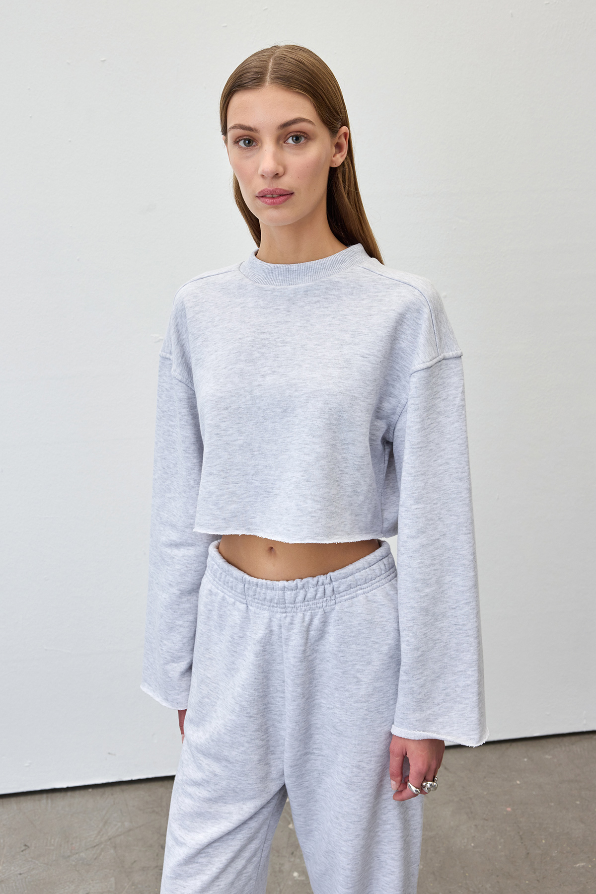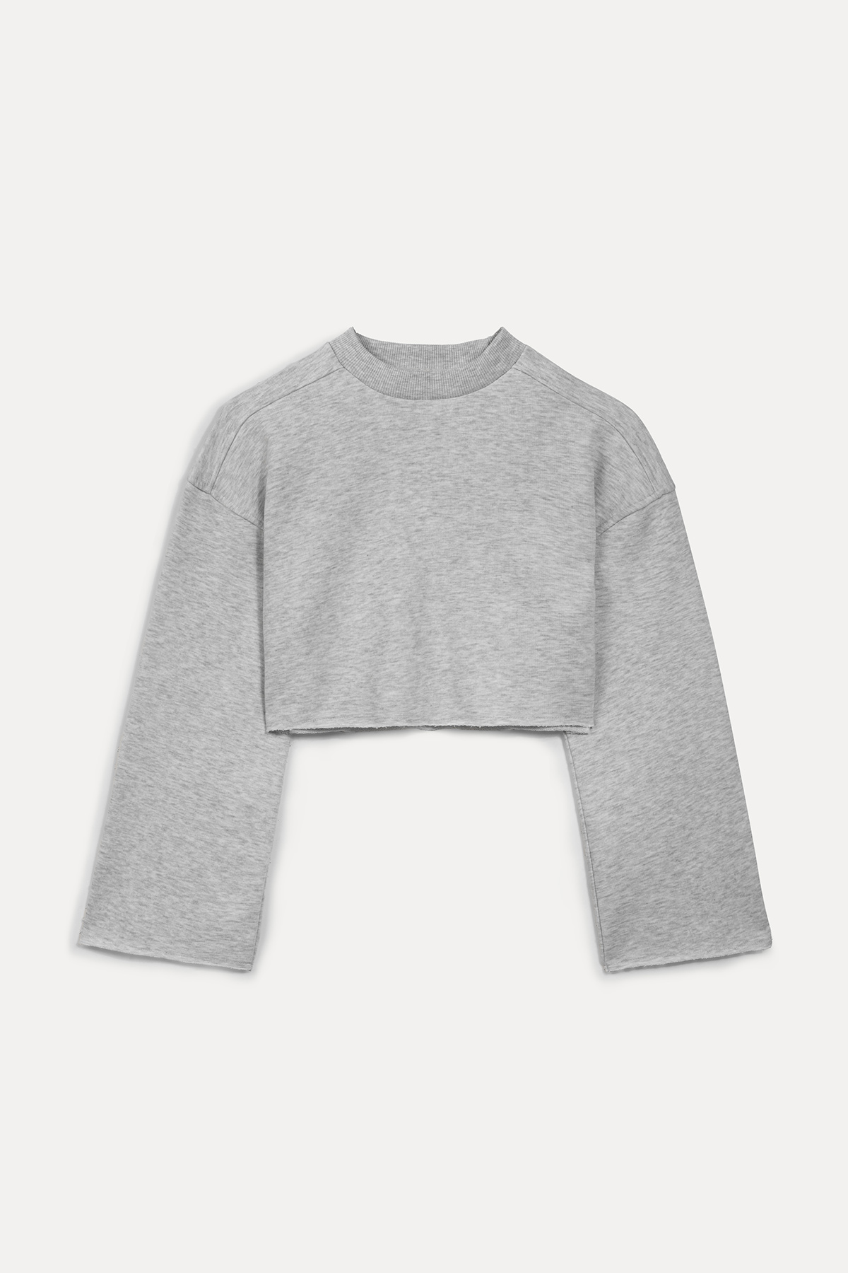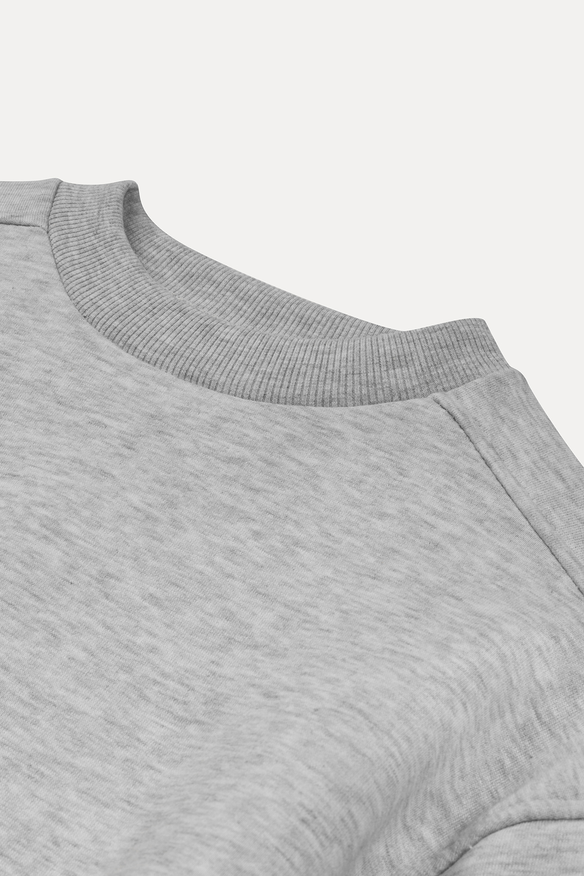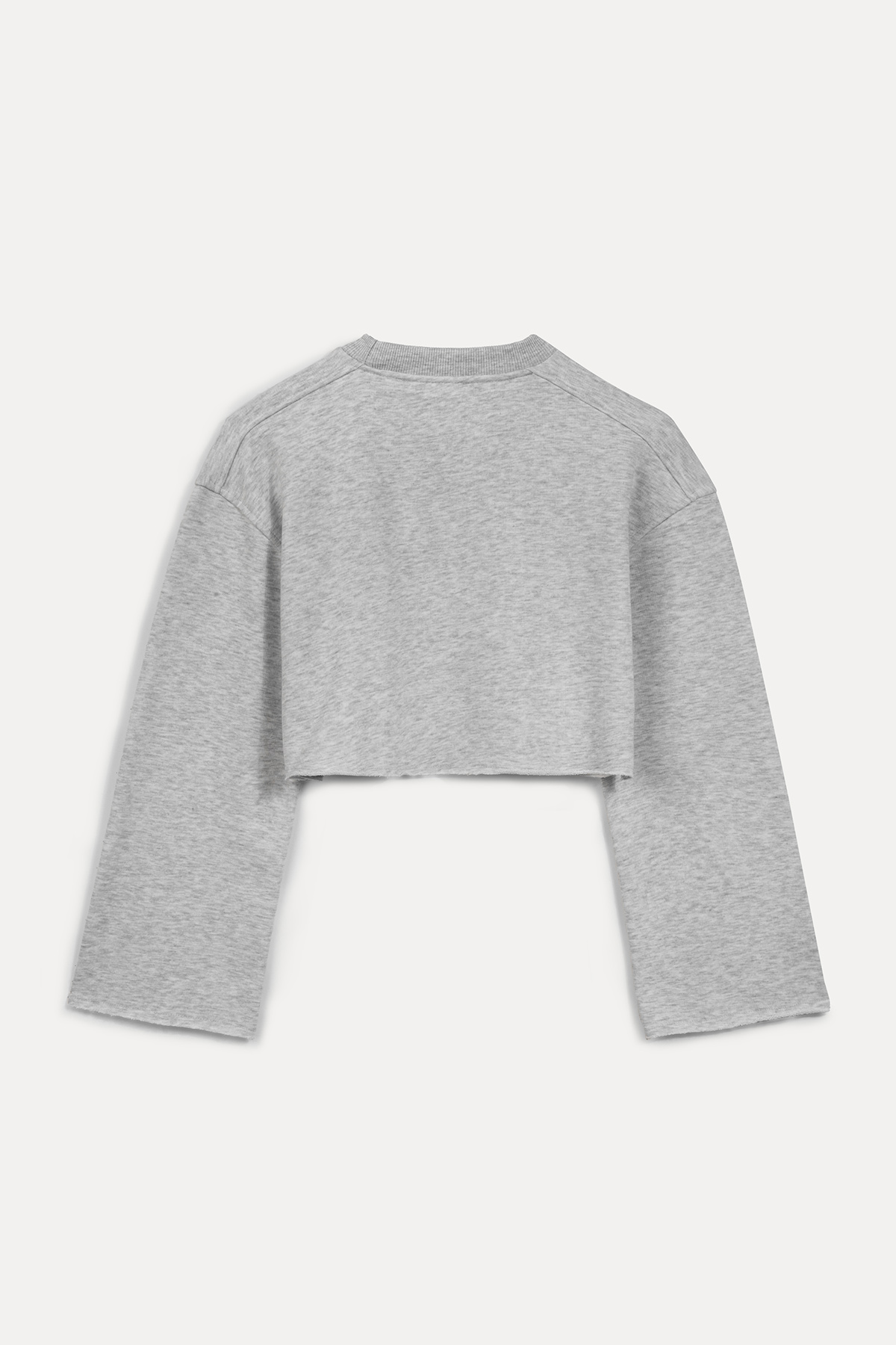 Bisiklet yaka, oversıze kalıp, geniş kollu crop sweatshirt.