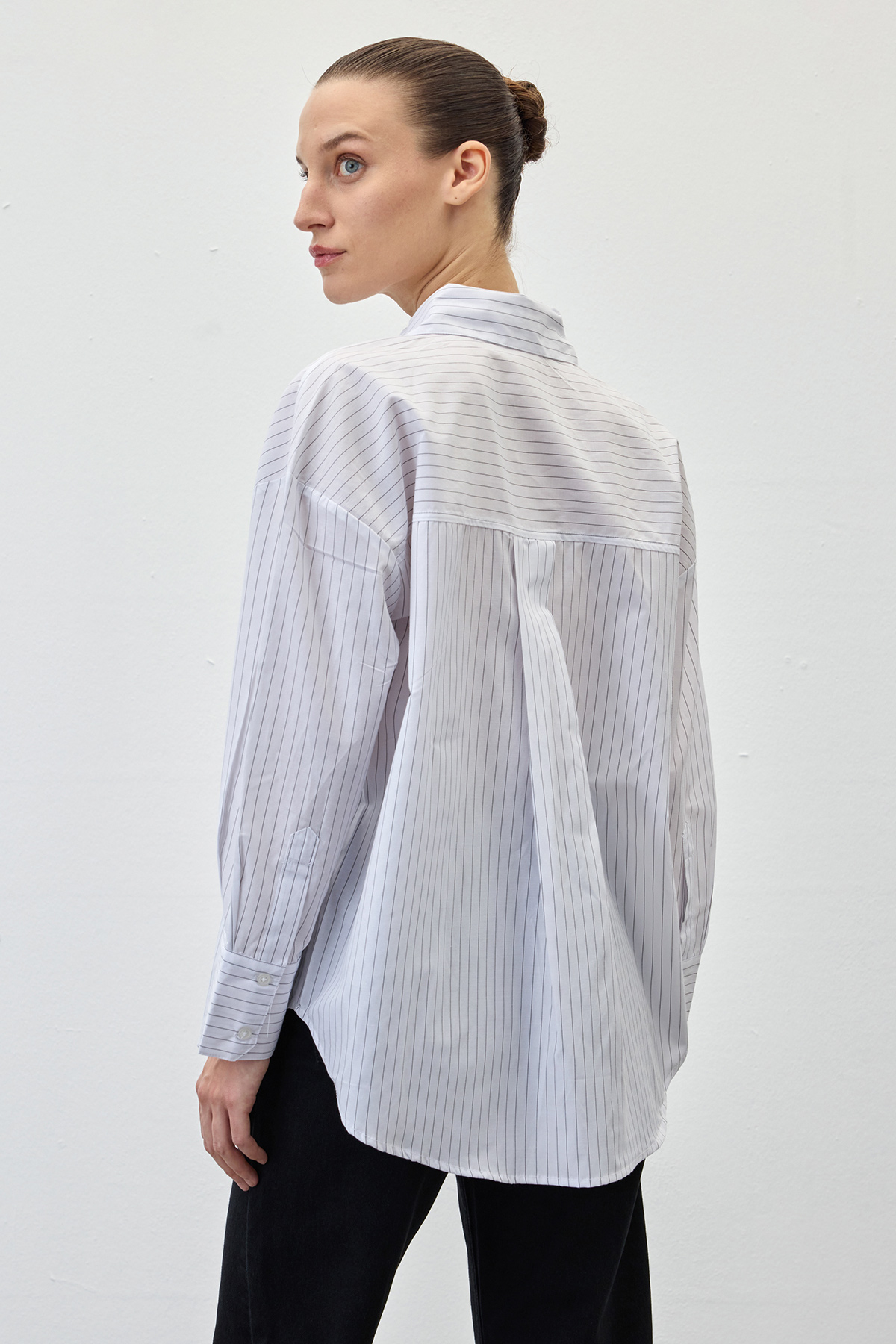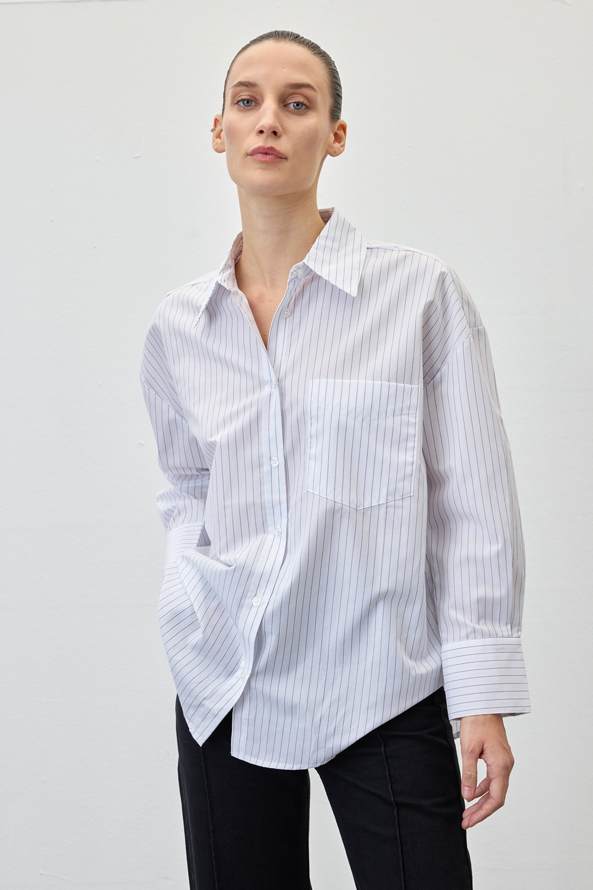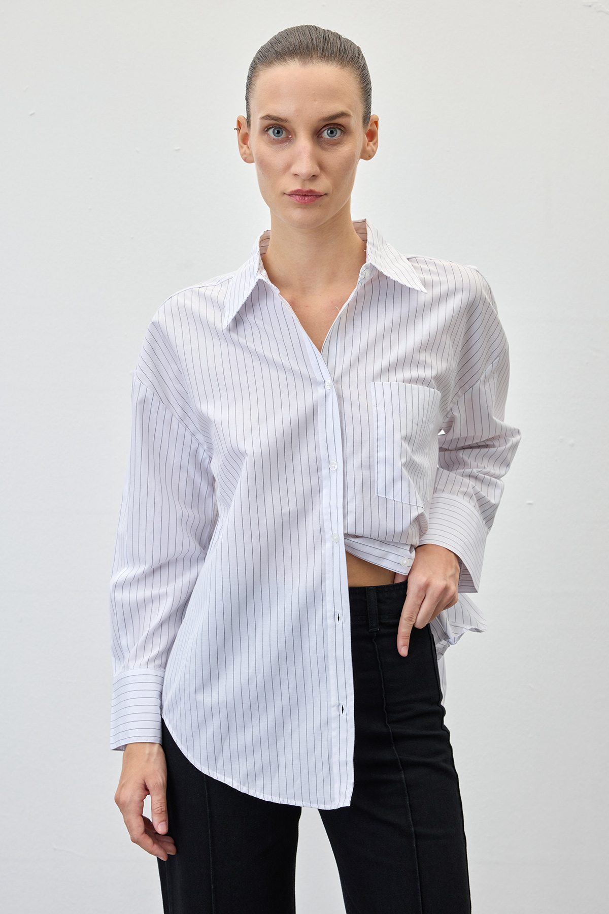 Gömlek yaka, düğmeli, önü tek cepli, oversize, manşeti düğmeli uzun kollu, kenarları oval kesim, rahat Kalıp Gömlek