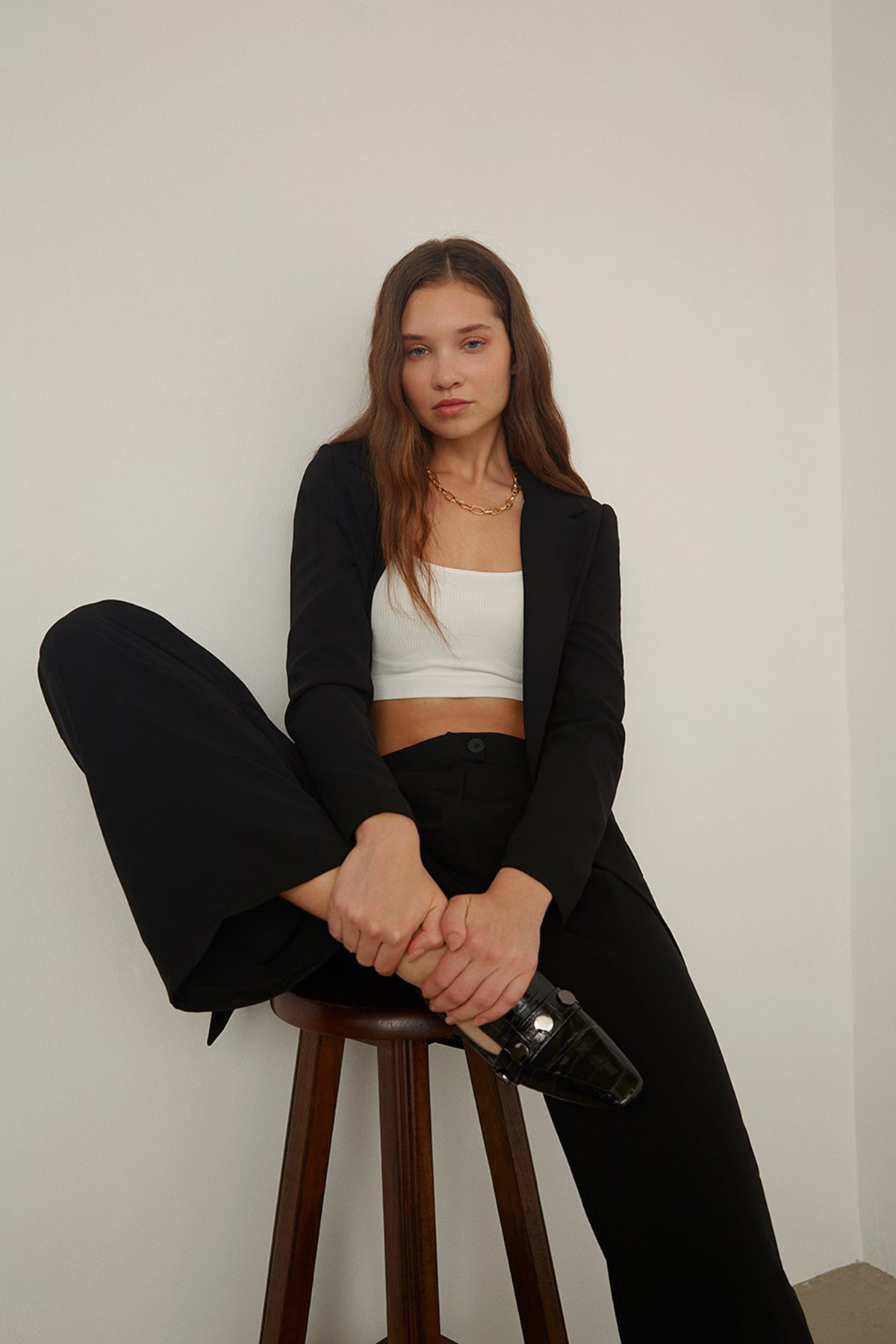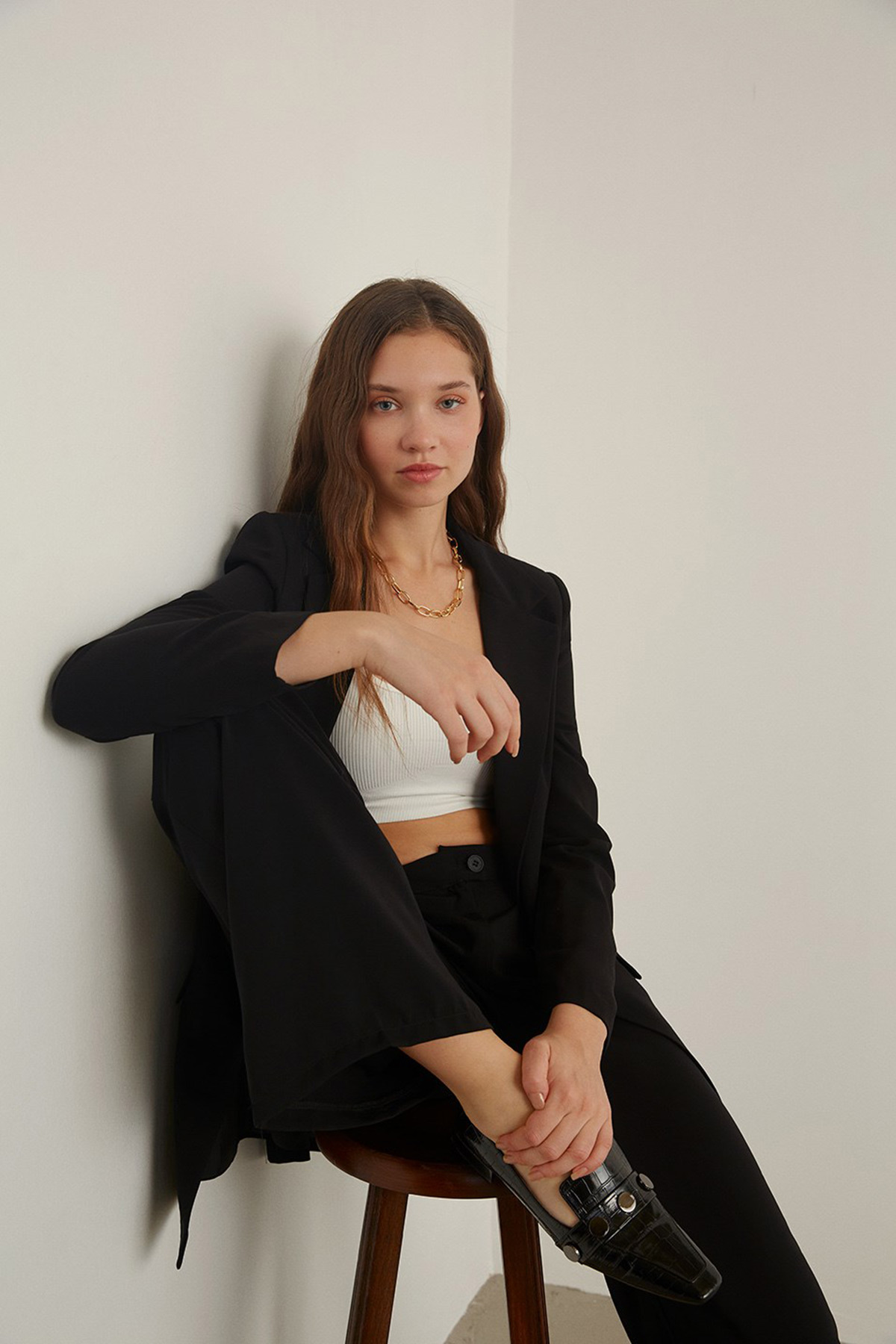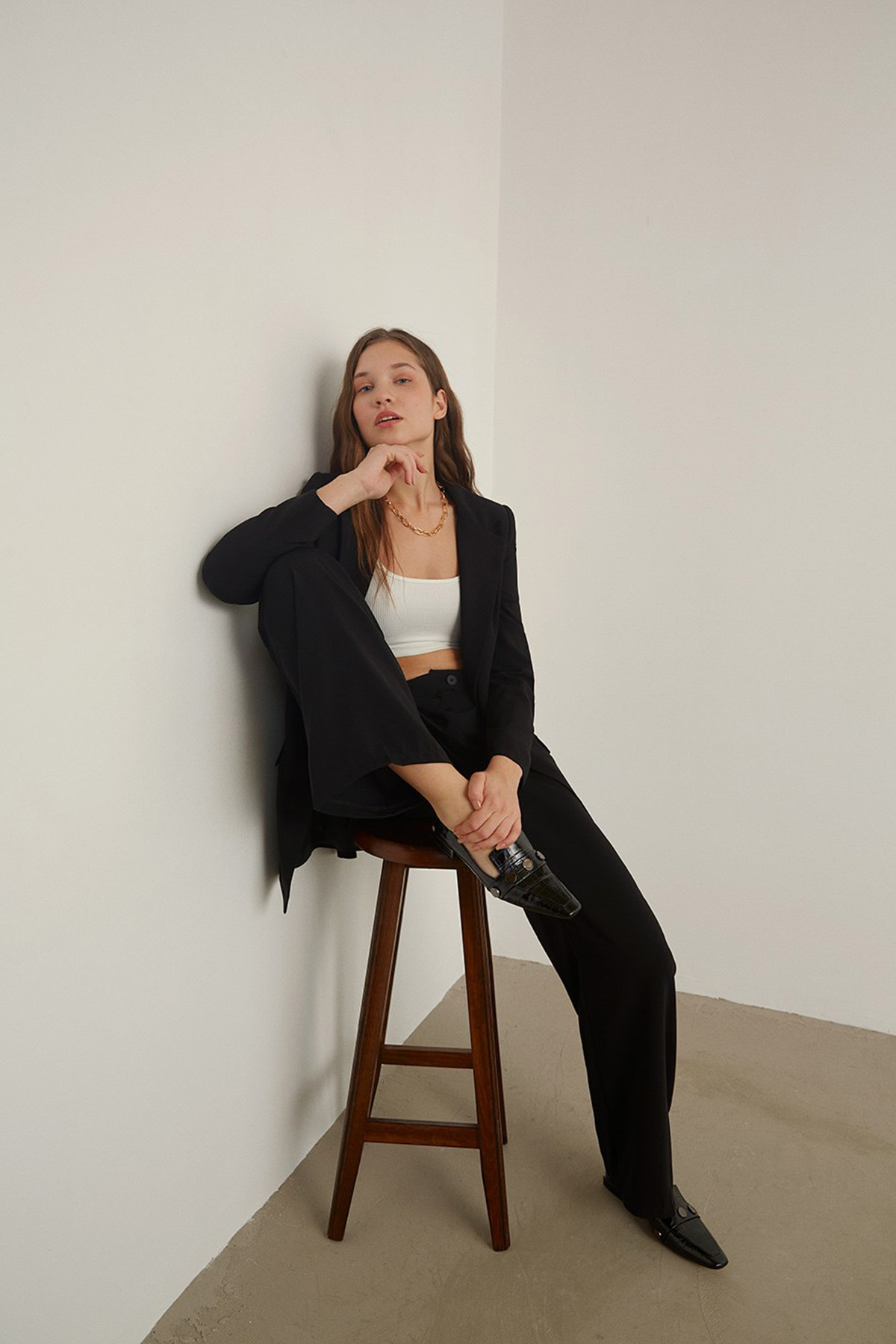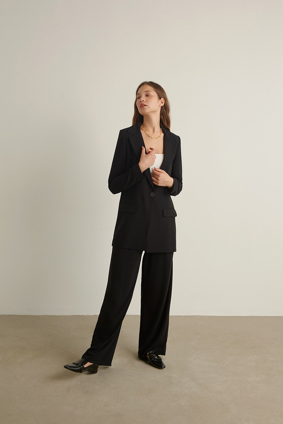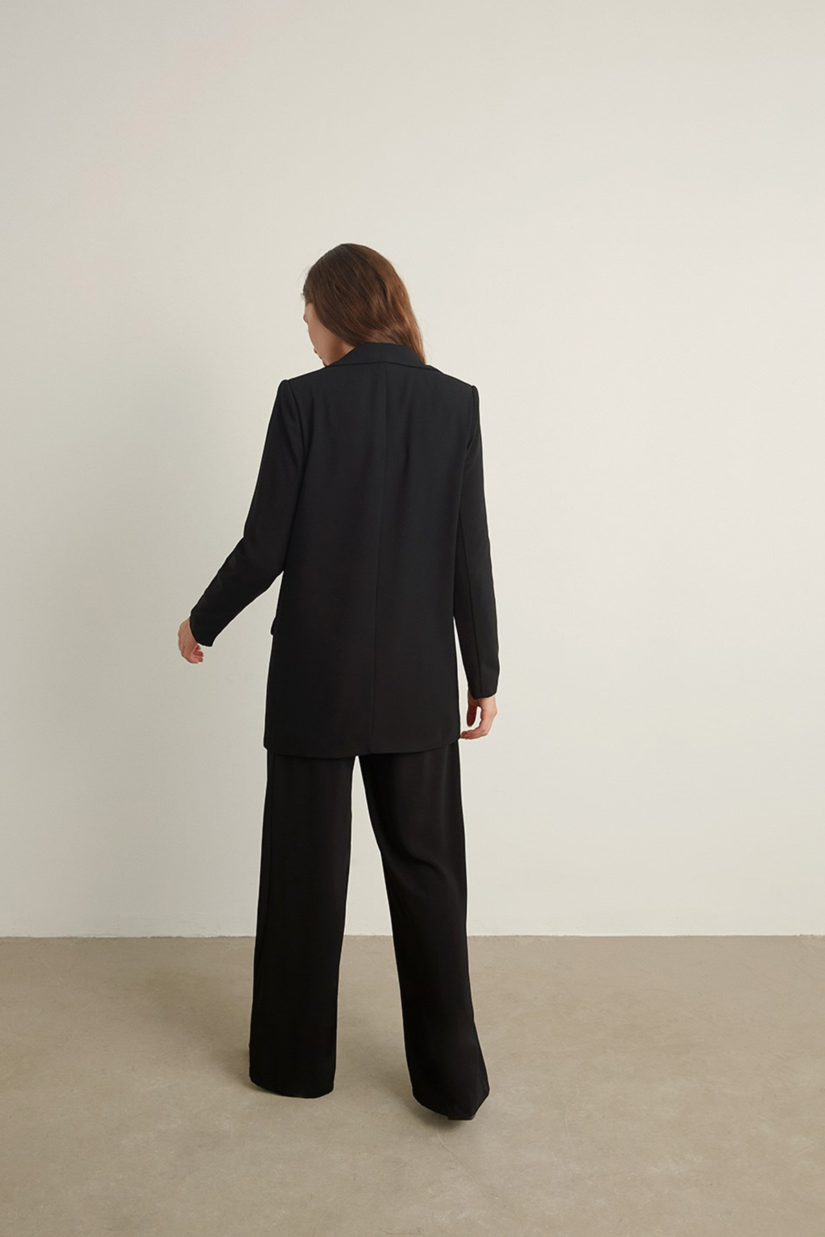 Kruvaze yaka, tek düğme, vatkalı.2 yalancı cepli, astarlı ceket.Pensli, krep kumaş, palazzo pantolon takım.