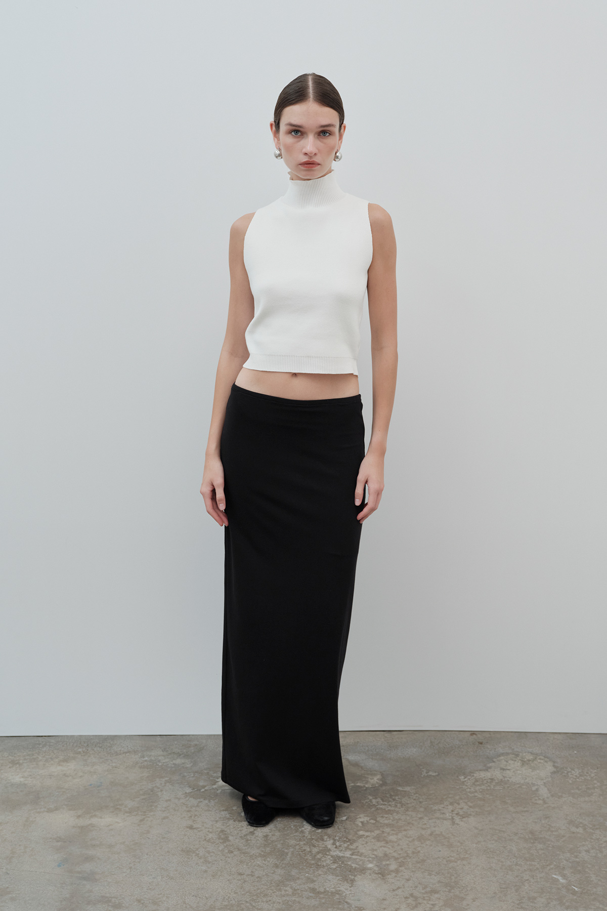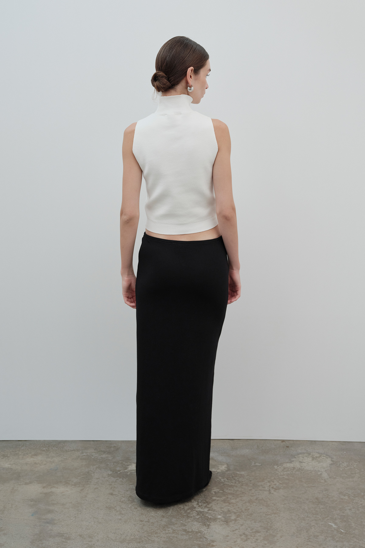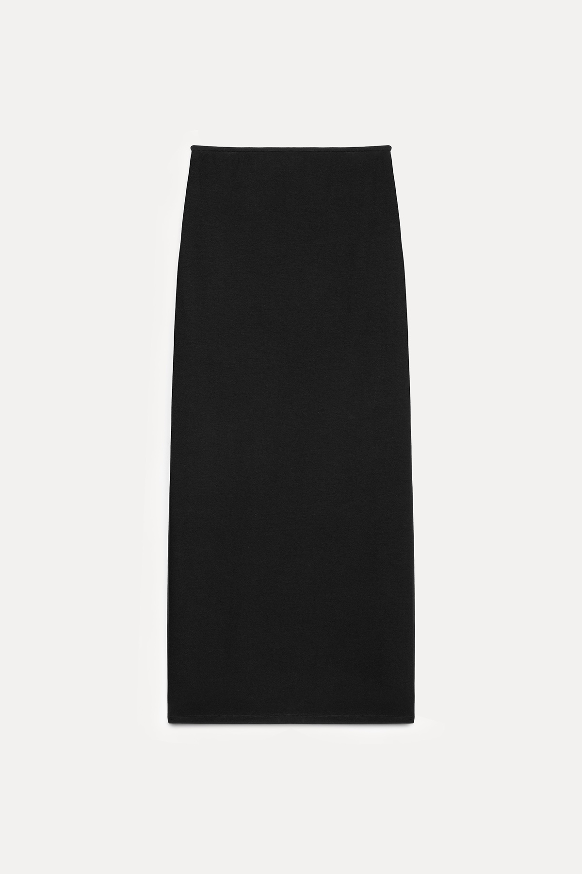 Yüksek bel, beli lastikli, fermuarsız, astarlı, tam kalıp maxi kalem etek.