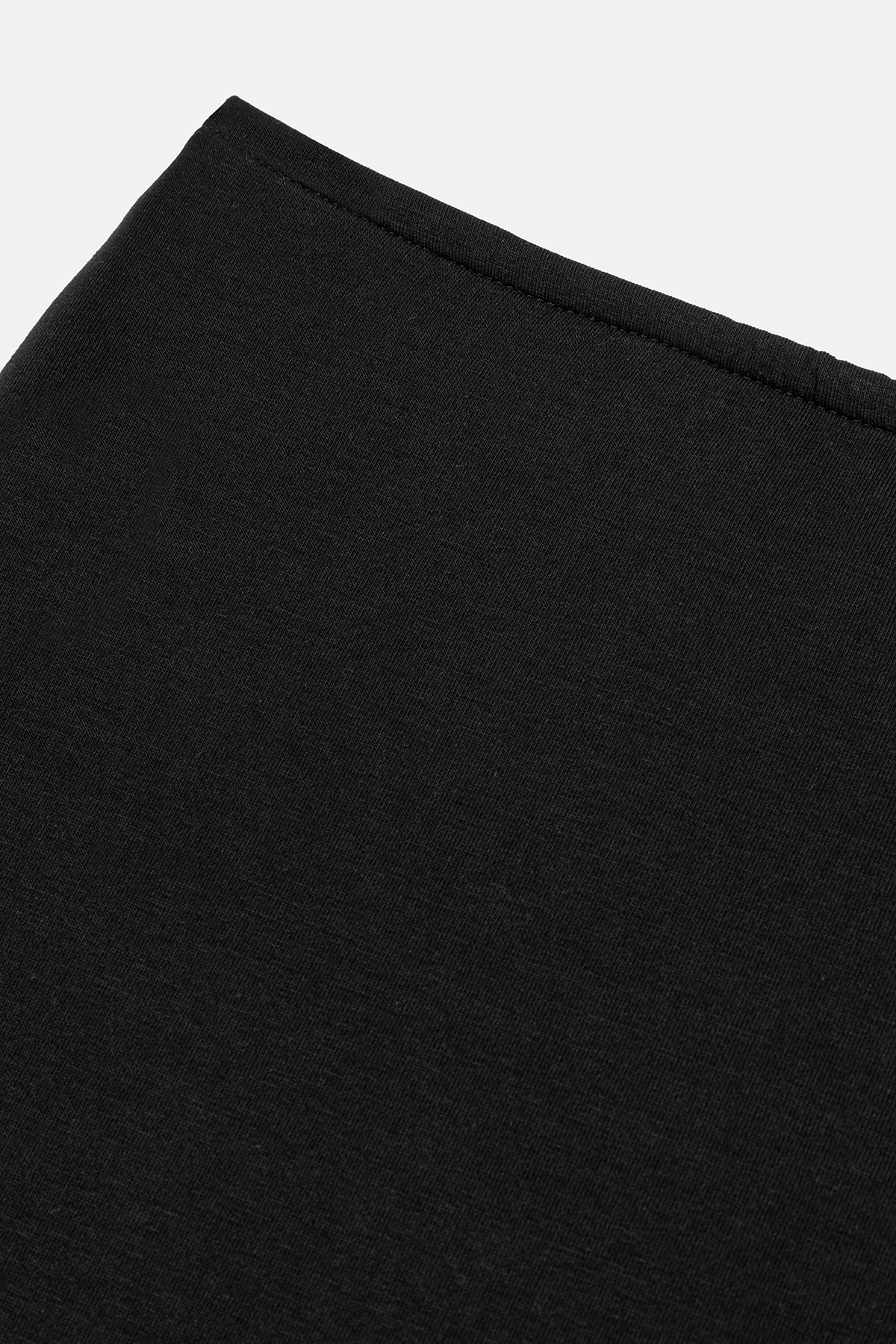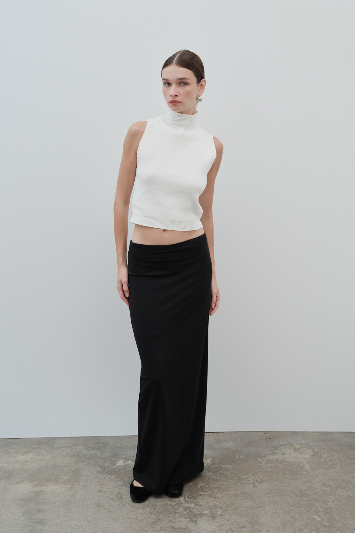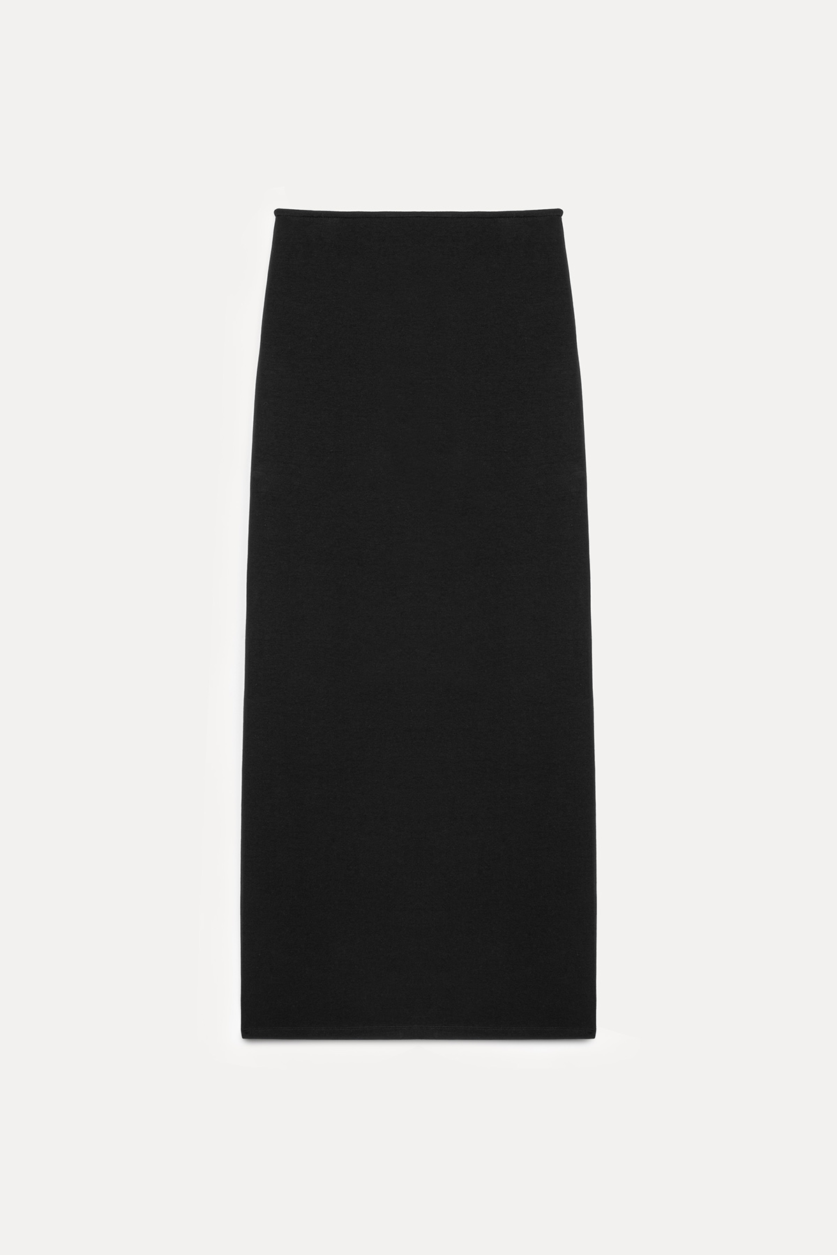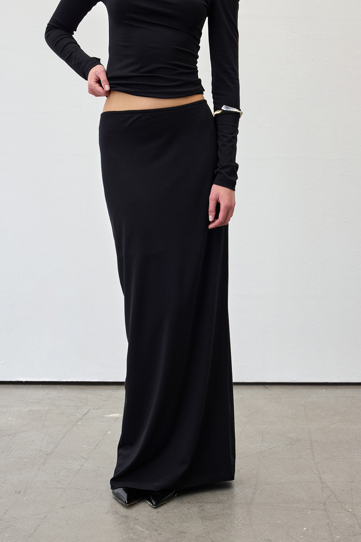 Yüksek bel, beli lastikli, fermuarsız, astarlı, tam kalıp maxi kalem etek.