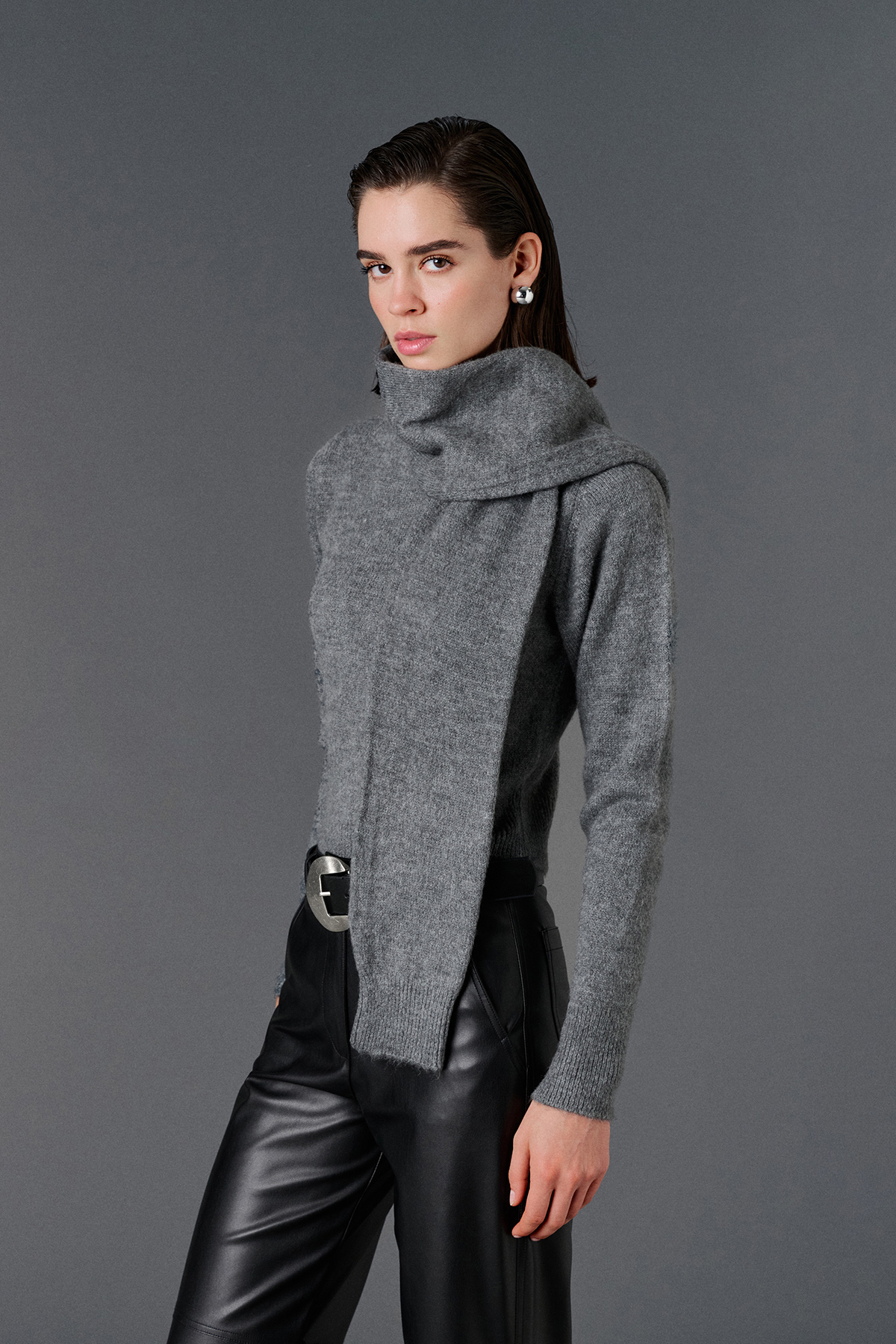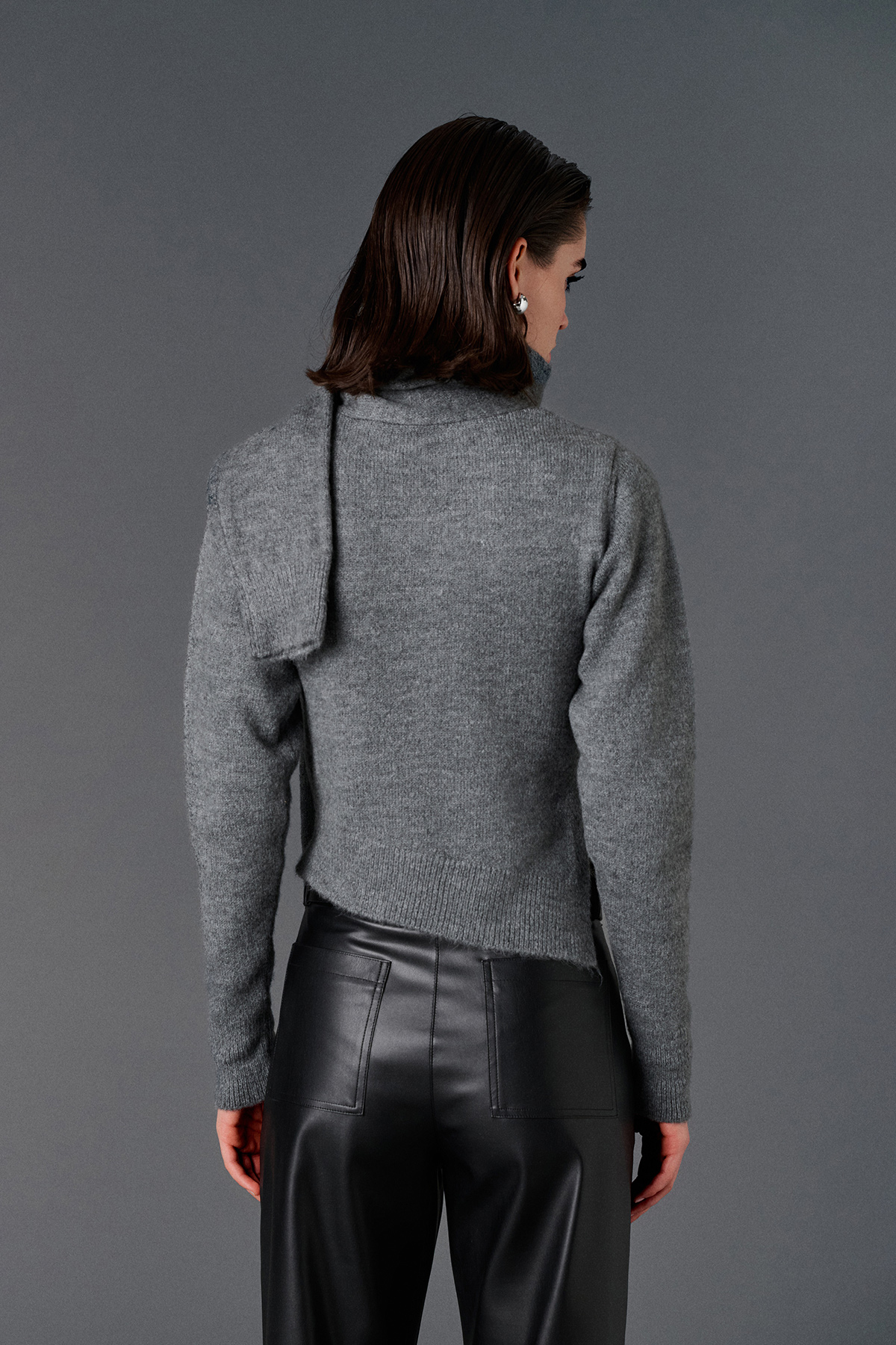 Şal yaka, asimetrik kesim, yandan yırtmaçlı, regular kazak.