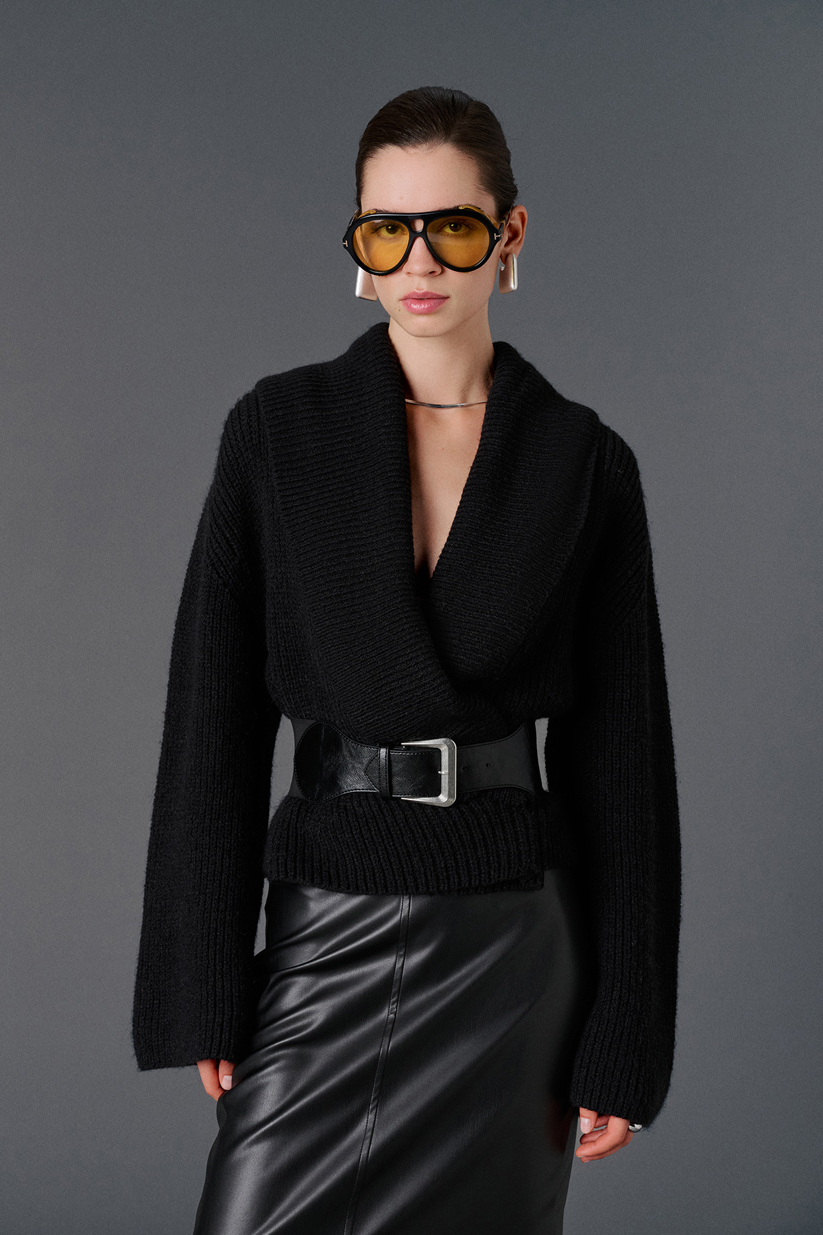 Şal yaka, önü kruvaze, geniş kollu oversize kazak