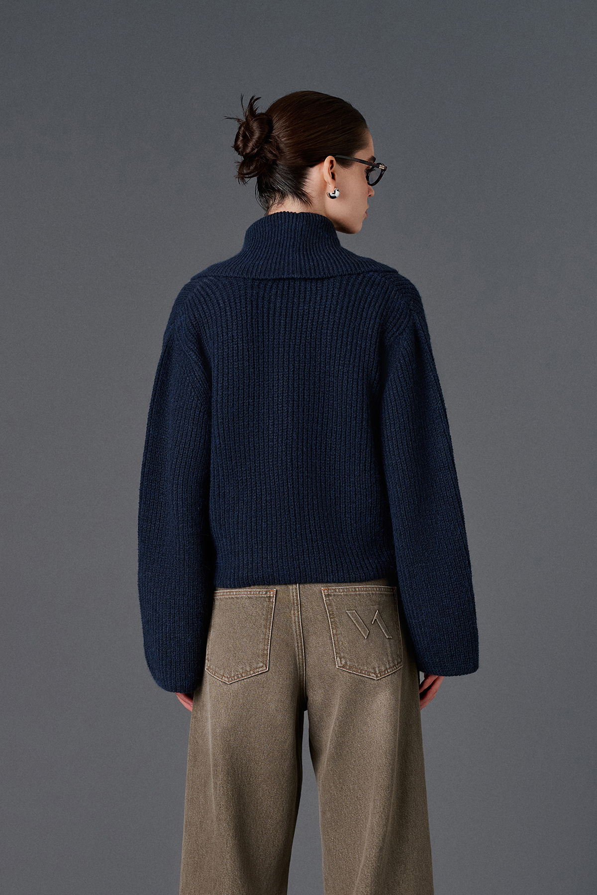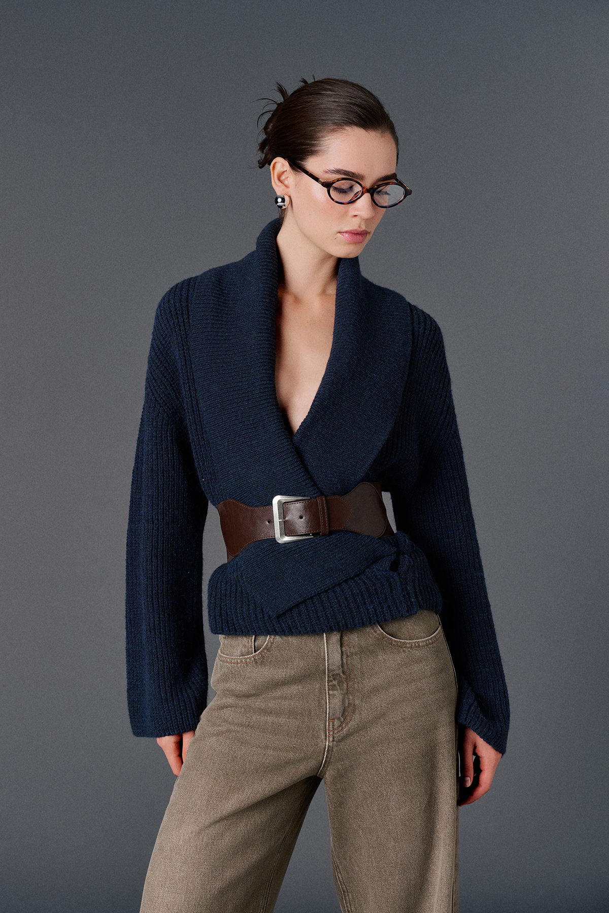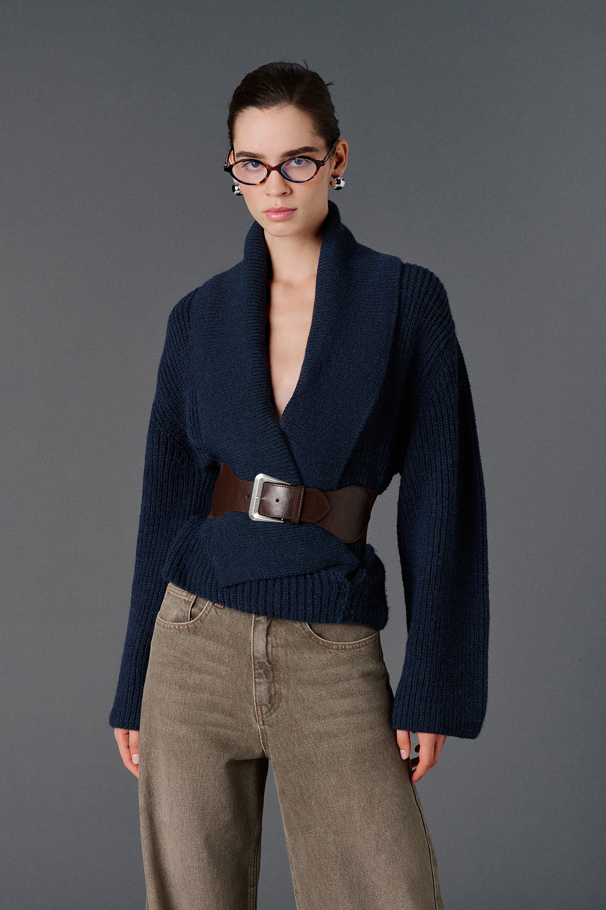 Şal yaka, önü kruvaze, geniş kollu oversize kazak