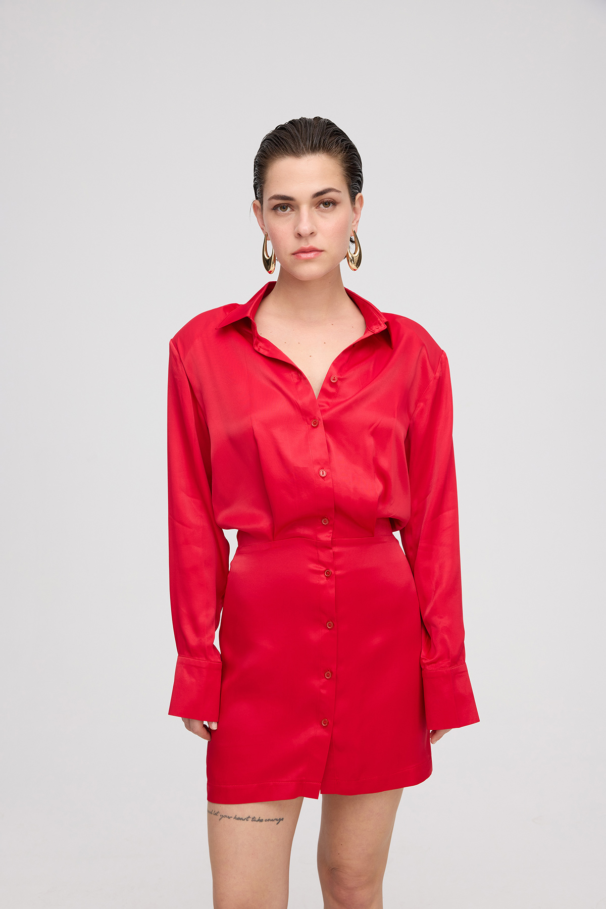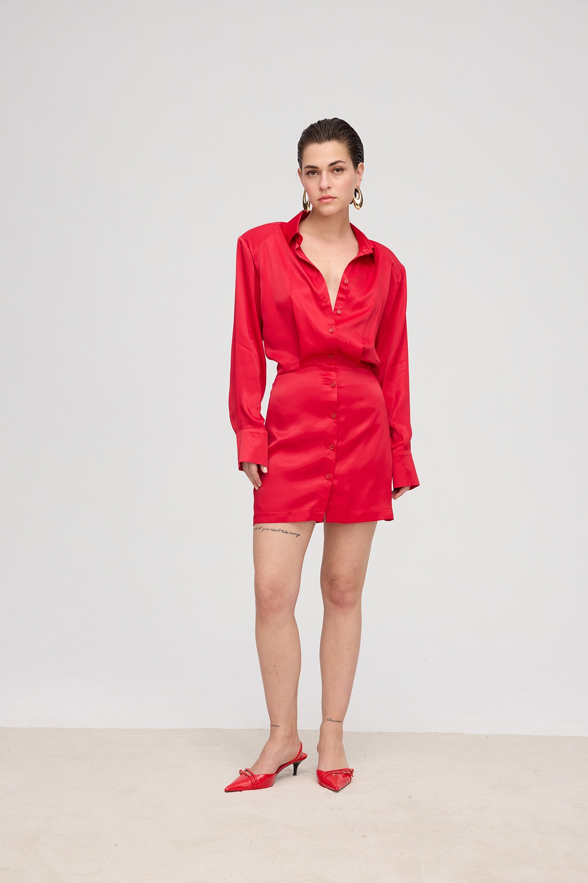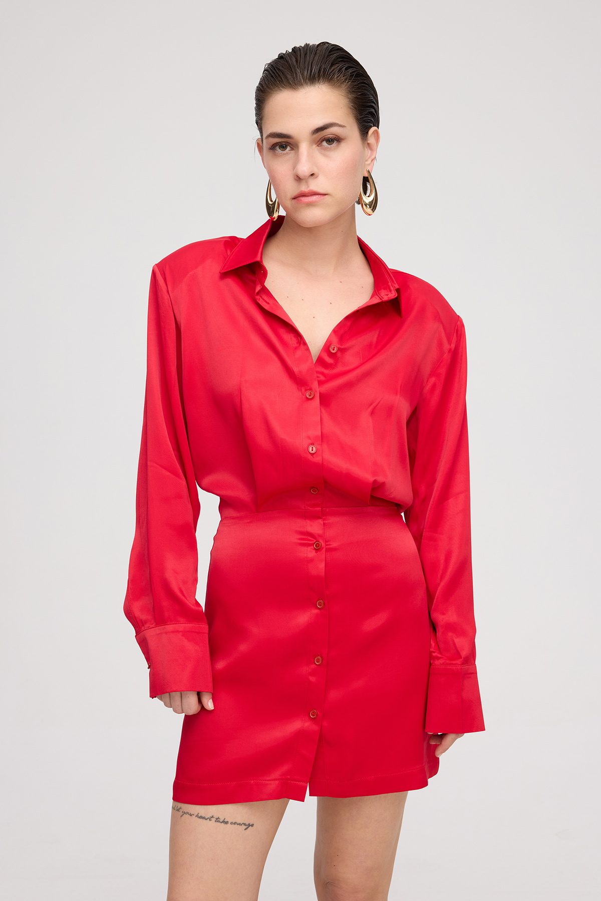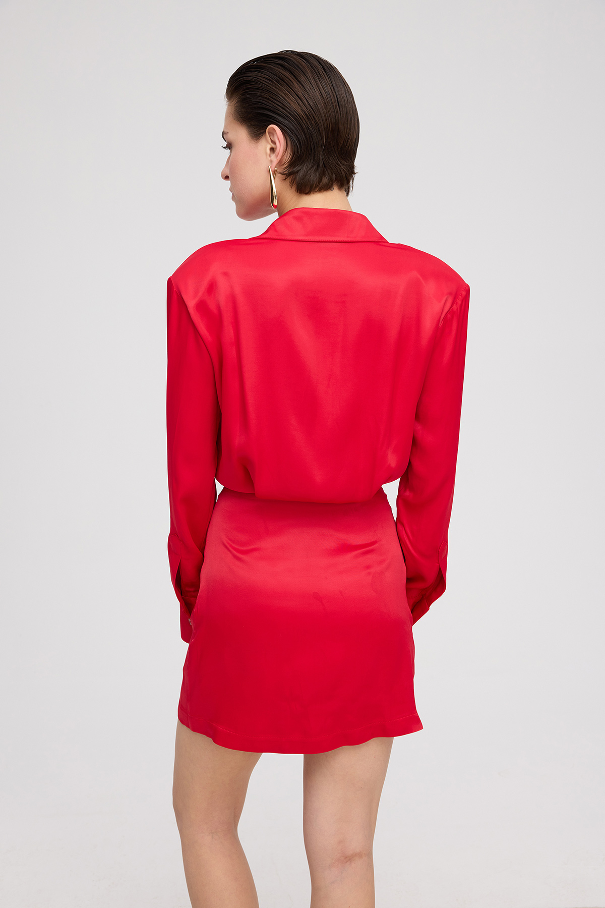 Gömlek yaka, uzun kollu, saten, düğmeli,beli oturtmalı, vatkalı mini elbise