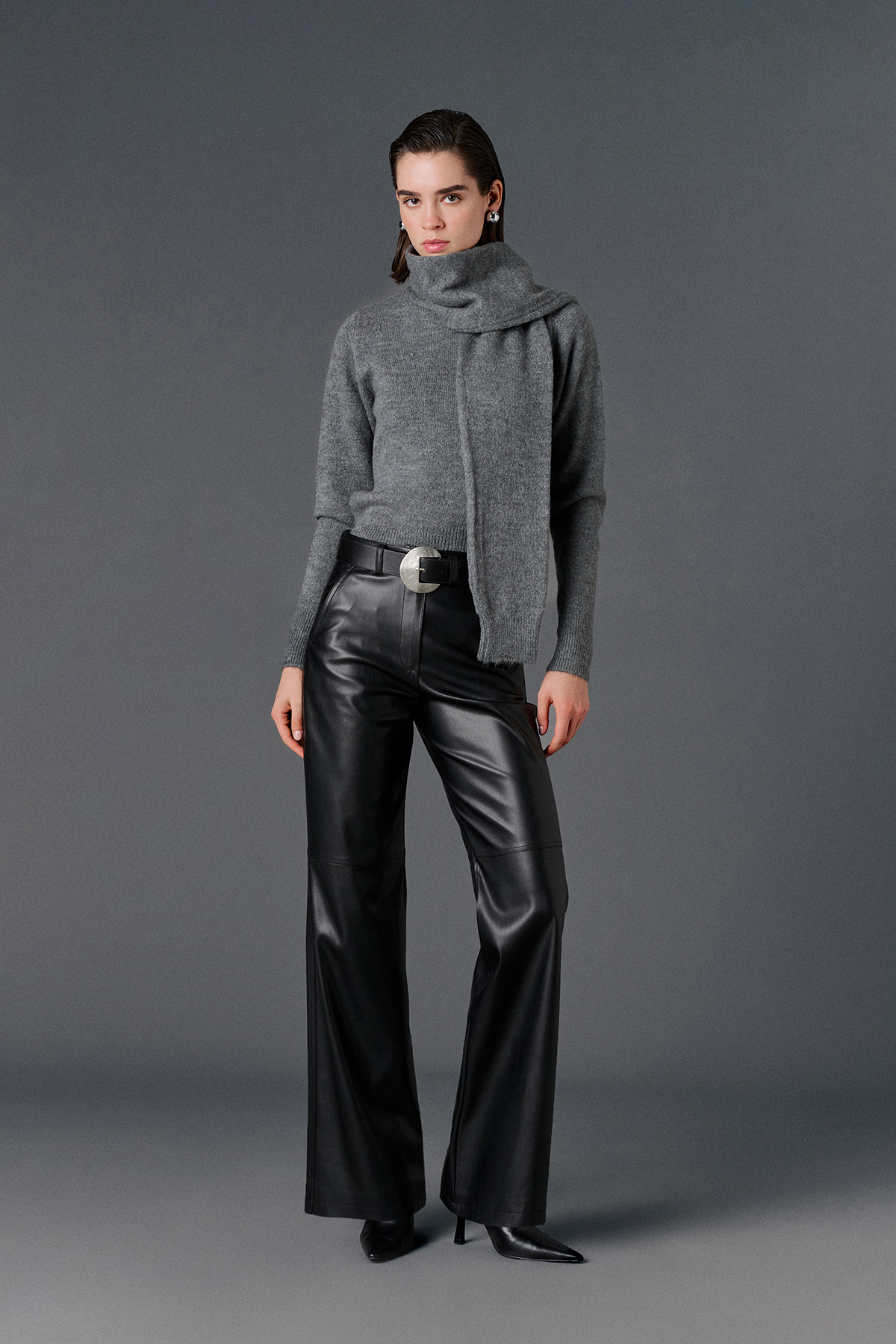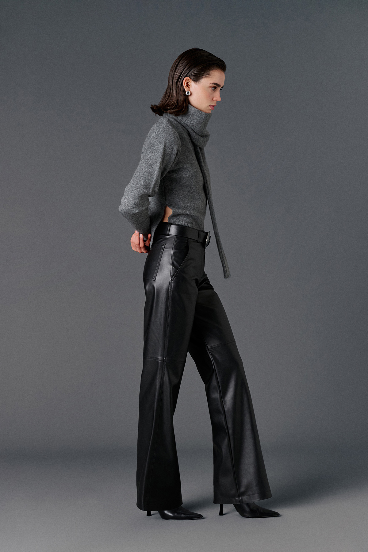 Yüksek bel, siyah, önü kanca ve fermuar kapamalı,deri görünümlü, önden 2, arkadan 2 cepli, palazzo pantolon.