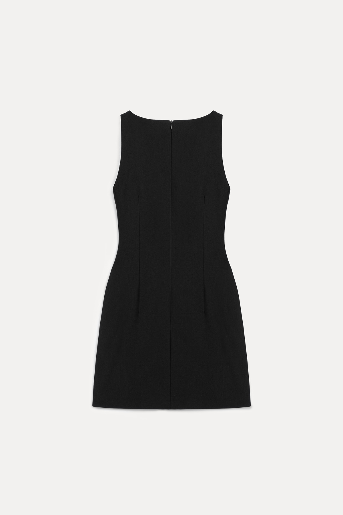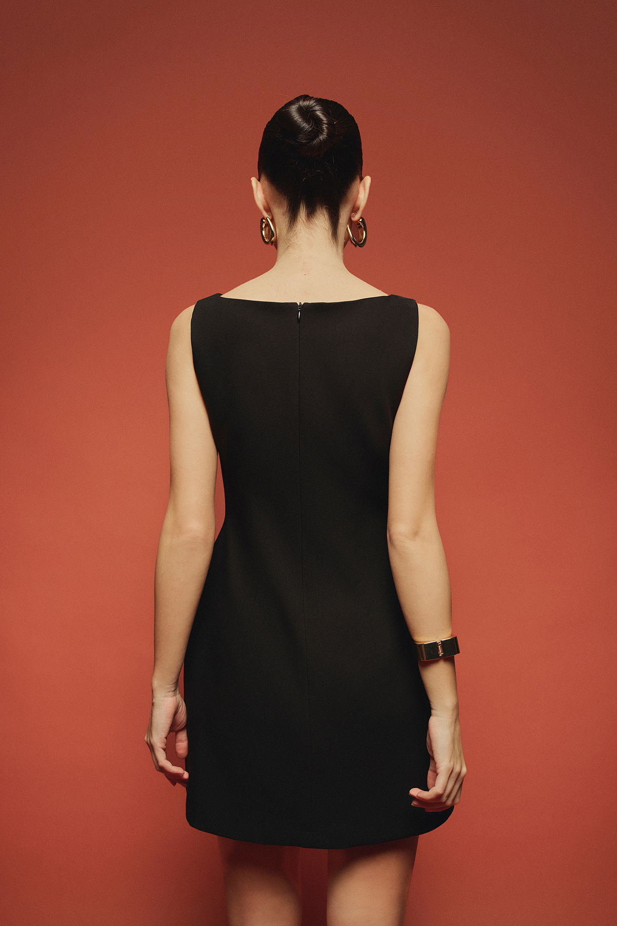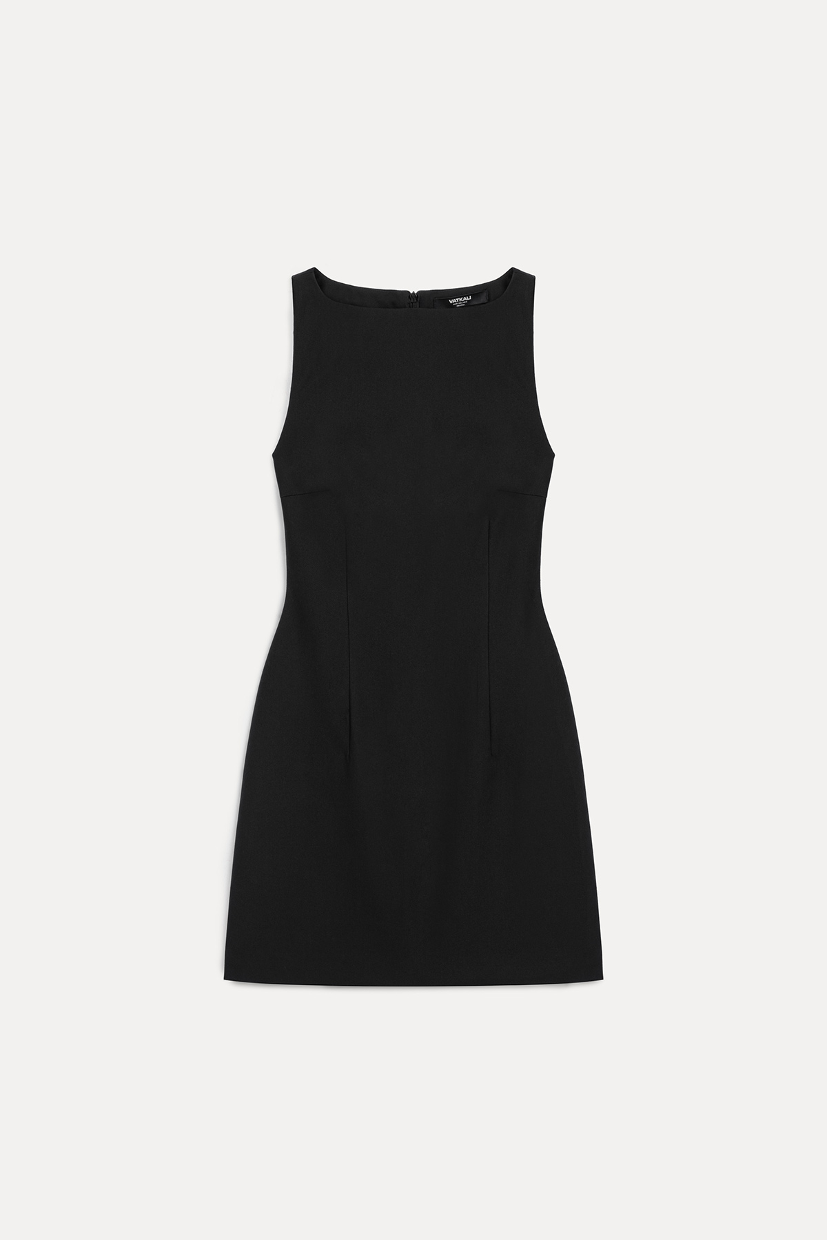 Kayık yaka,tam kalıp,cepsiz,askılı, arkası gizli fermuarlı,astarsız kısa siyah elbise.