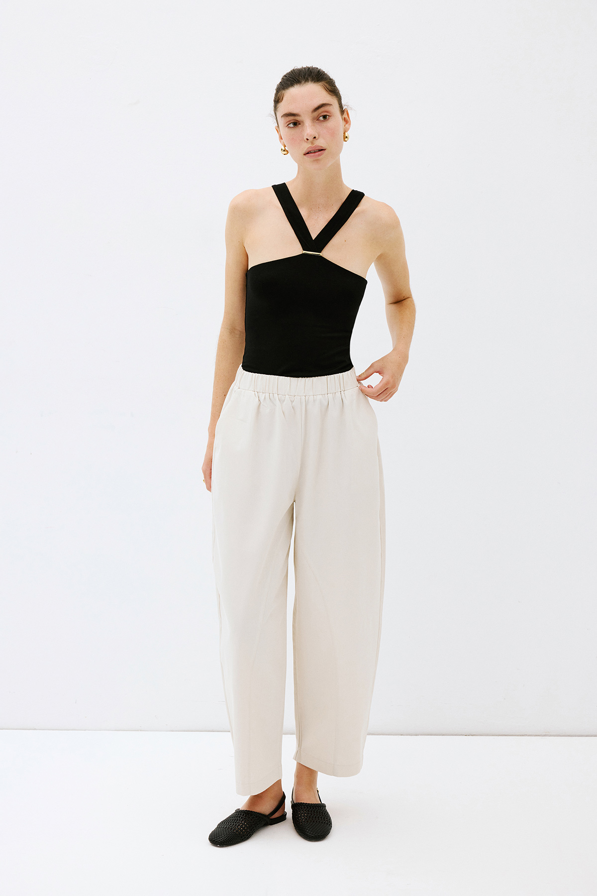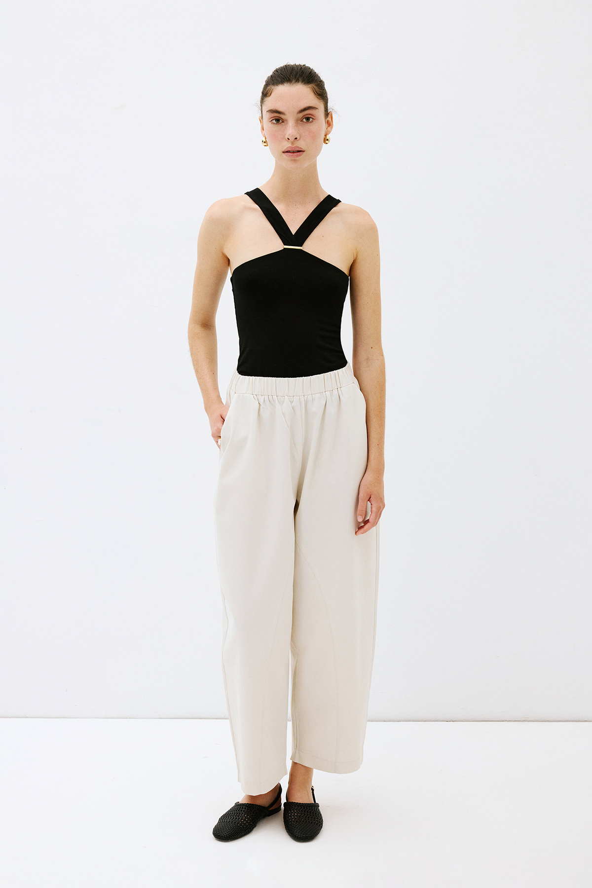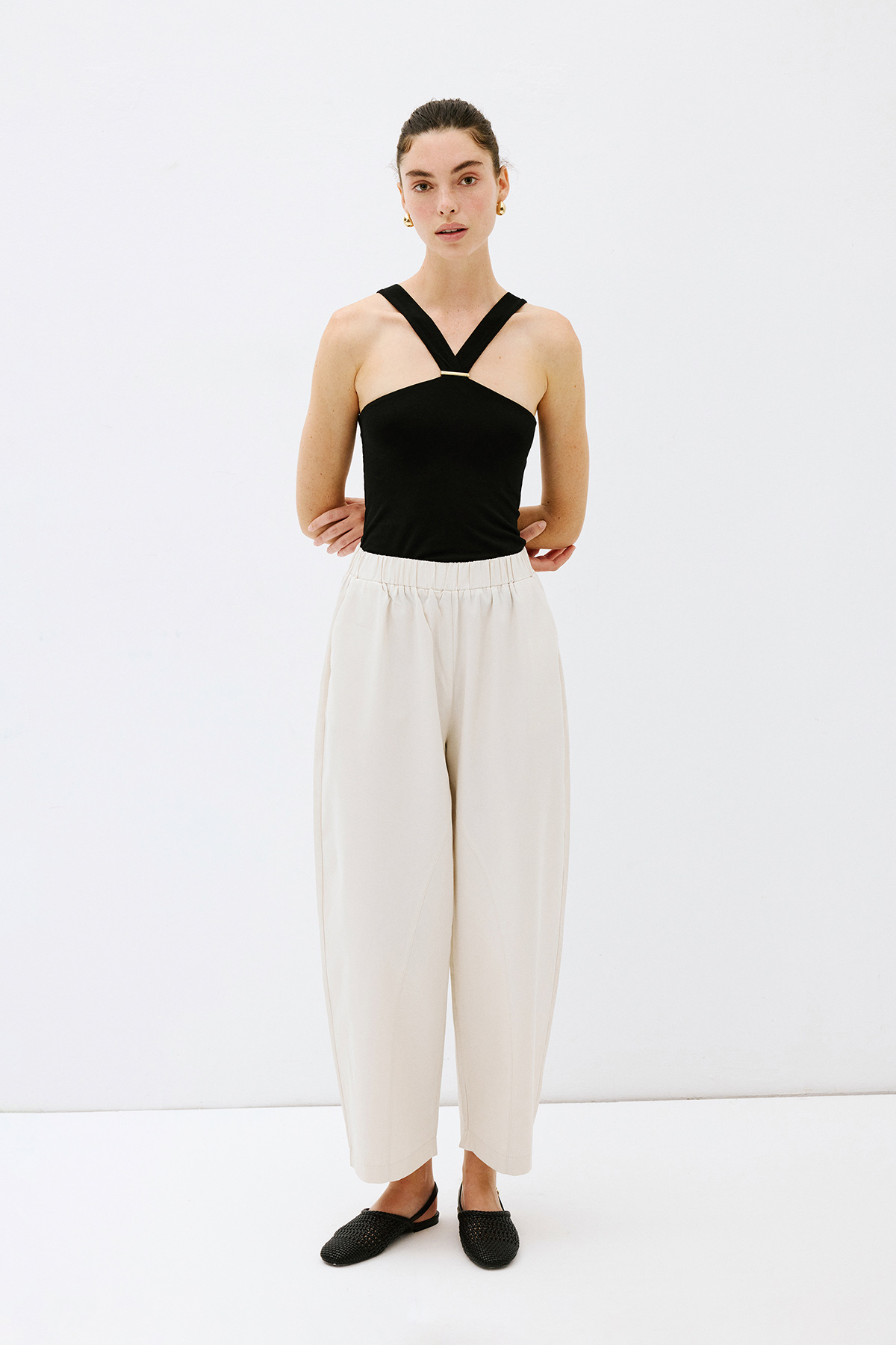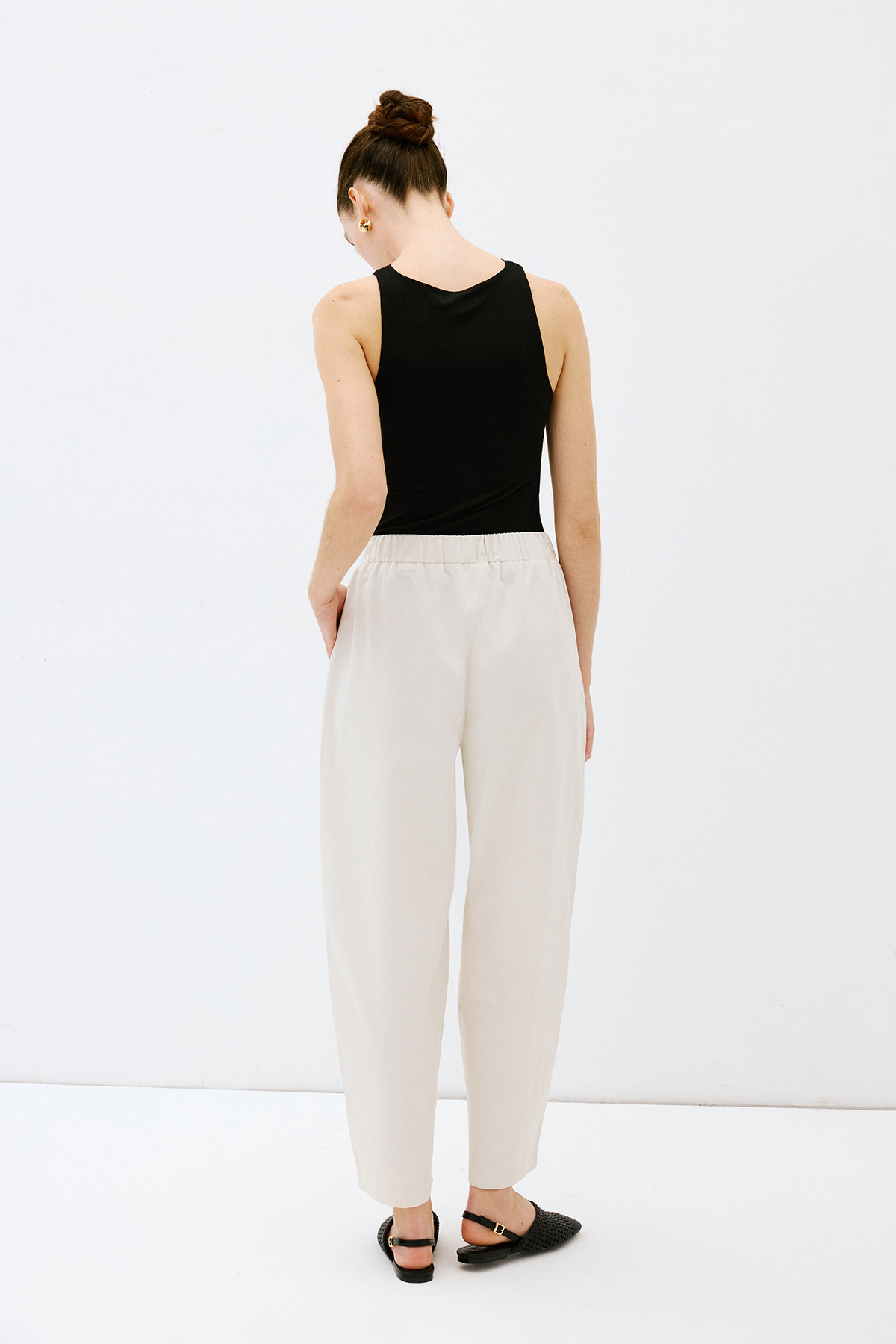 Yüksek bel, beli lastikli, yandan 2 cepli, balon pantolon.