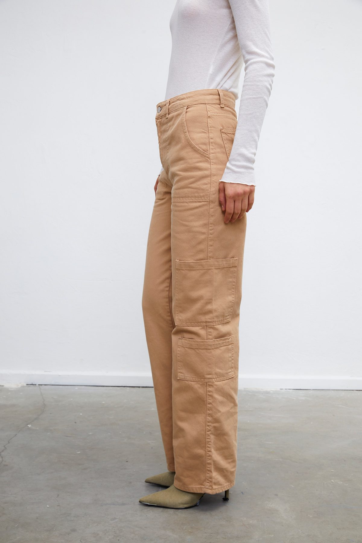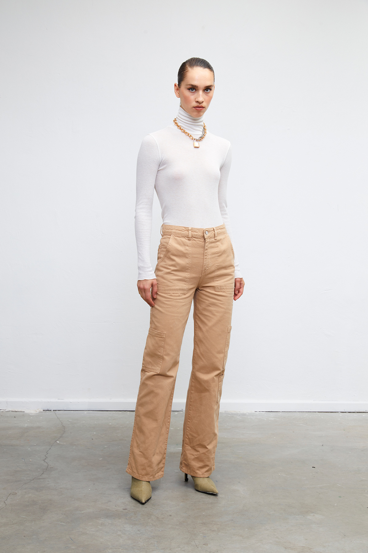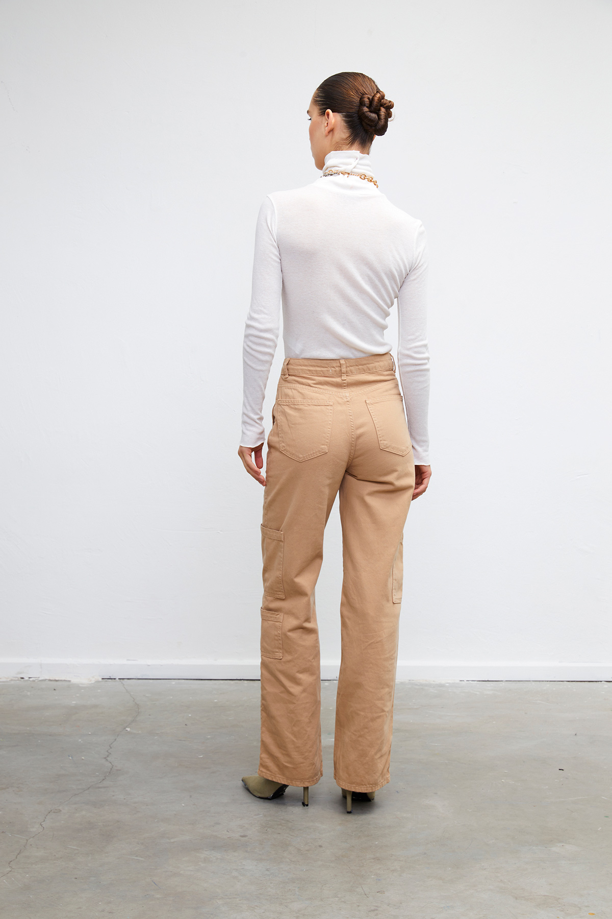 Yüksek bel , önü fermuarlı ve düğmeli, çok cepli, straight fit kadın kargo pantolon.
