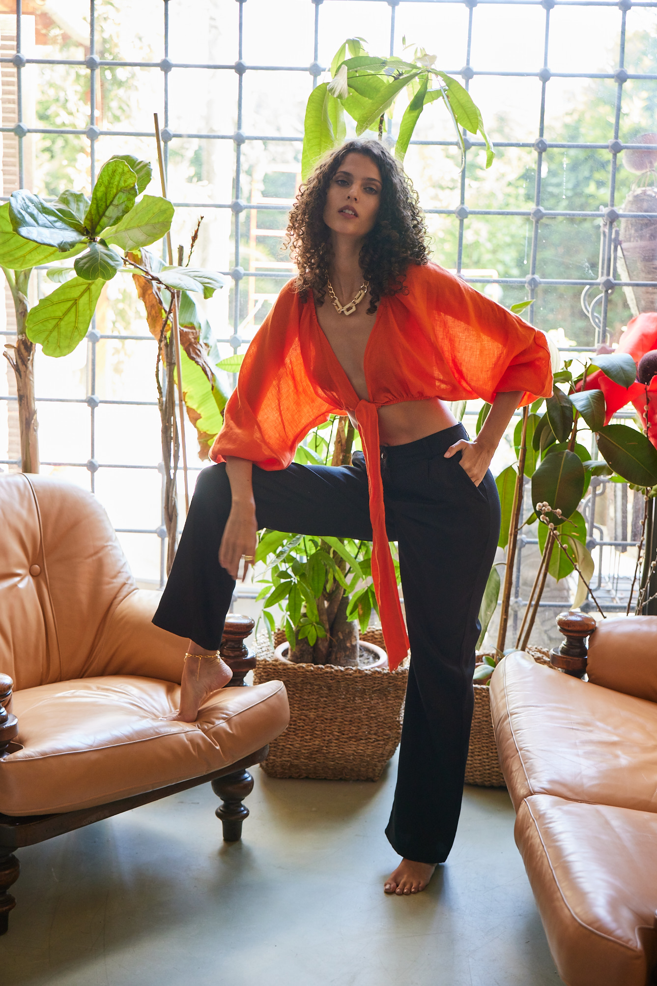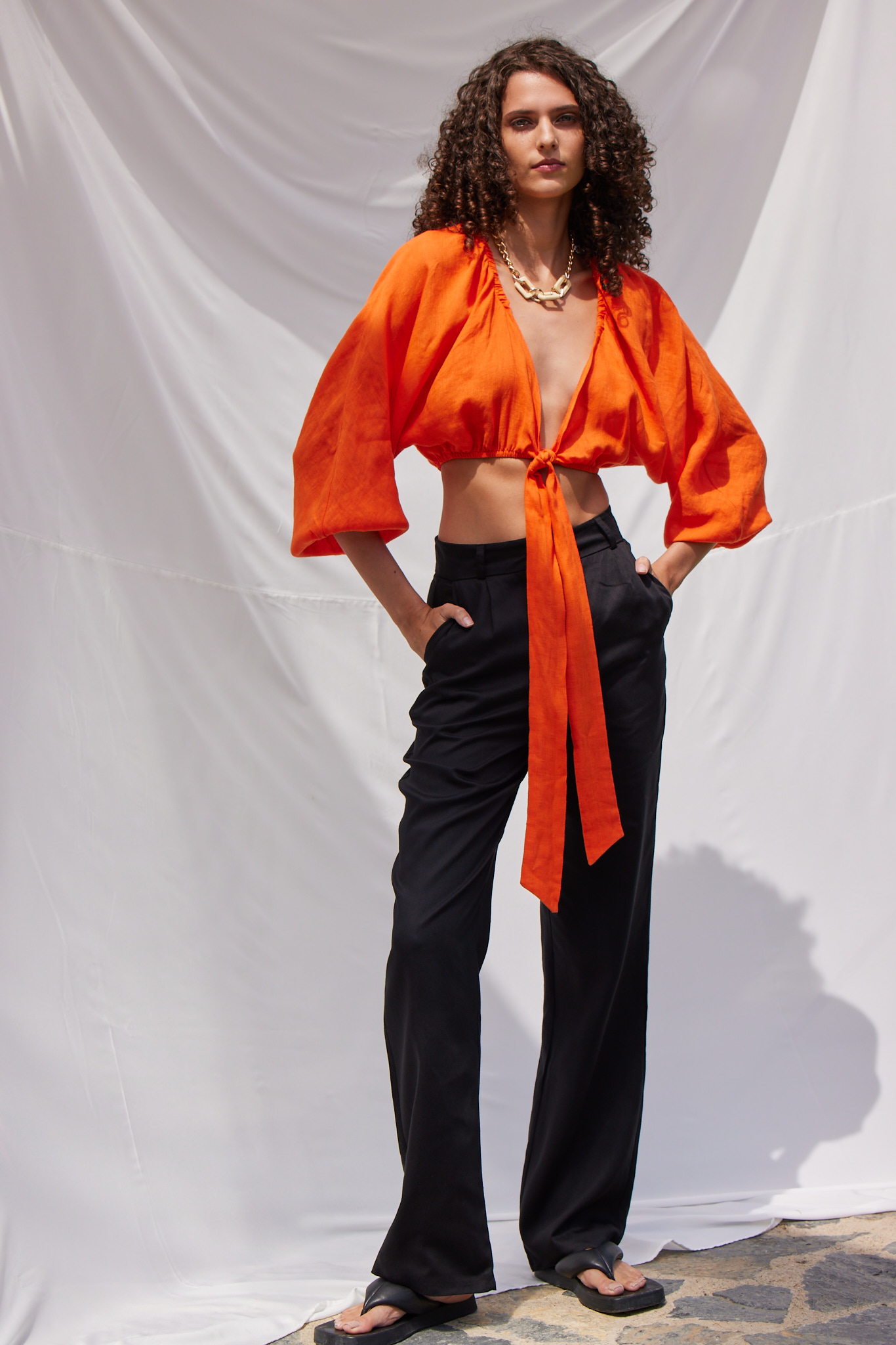 Balon kollu lasitkli, önü bağlamalı, ham keten kadın bluz.