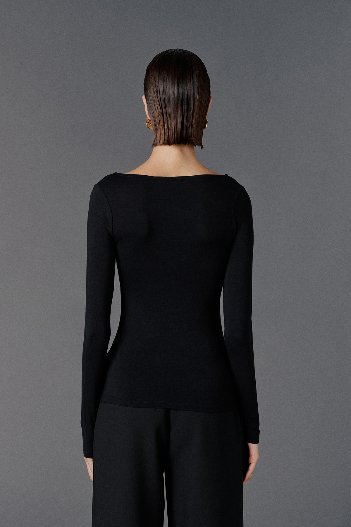 Derin V yaka, uzun kollu, fitted, halka aksesuar detaylı, büzgülü bluz.