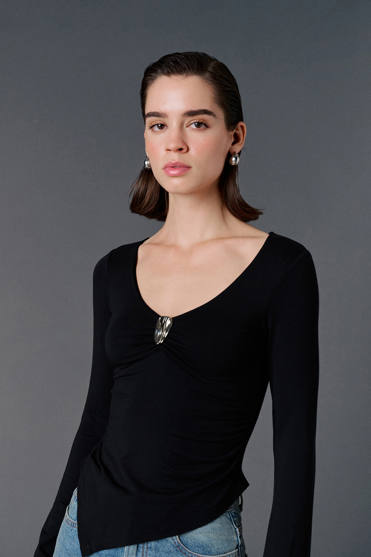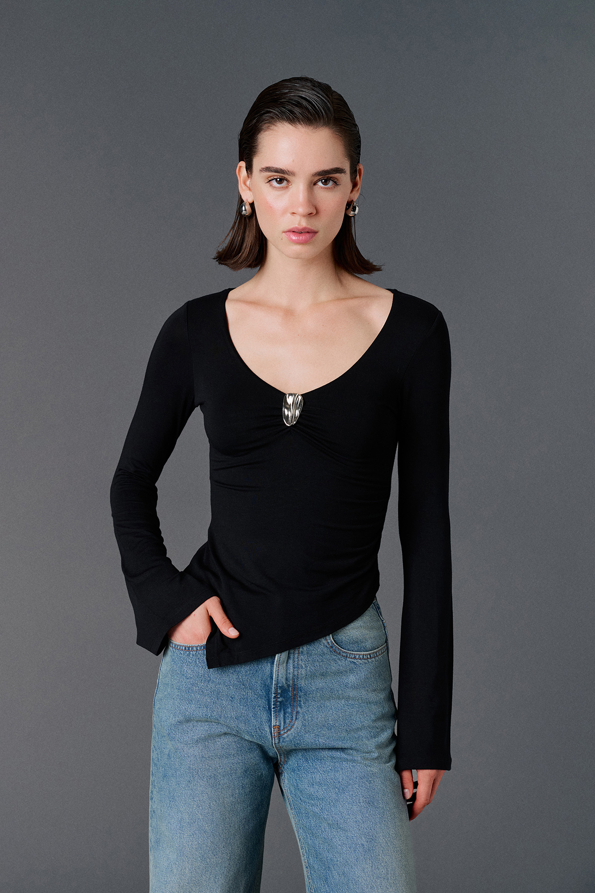 Asimetrik kesim, aksesuar detaylı, sol tarafı büzgülü, derin V yaka, uzun kollu, tam kalıp bluz.