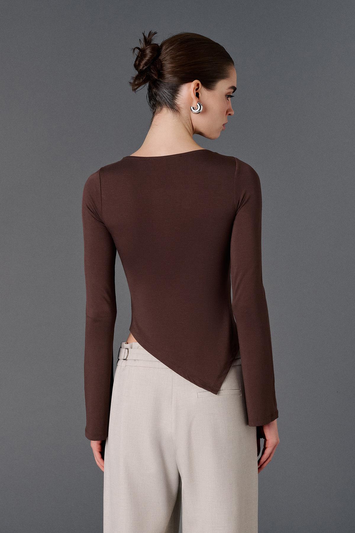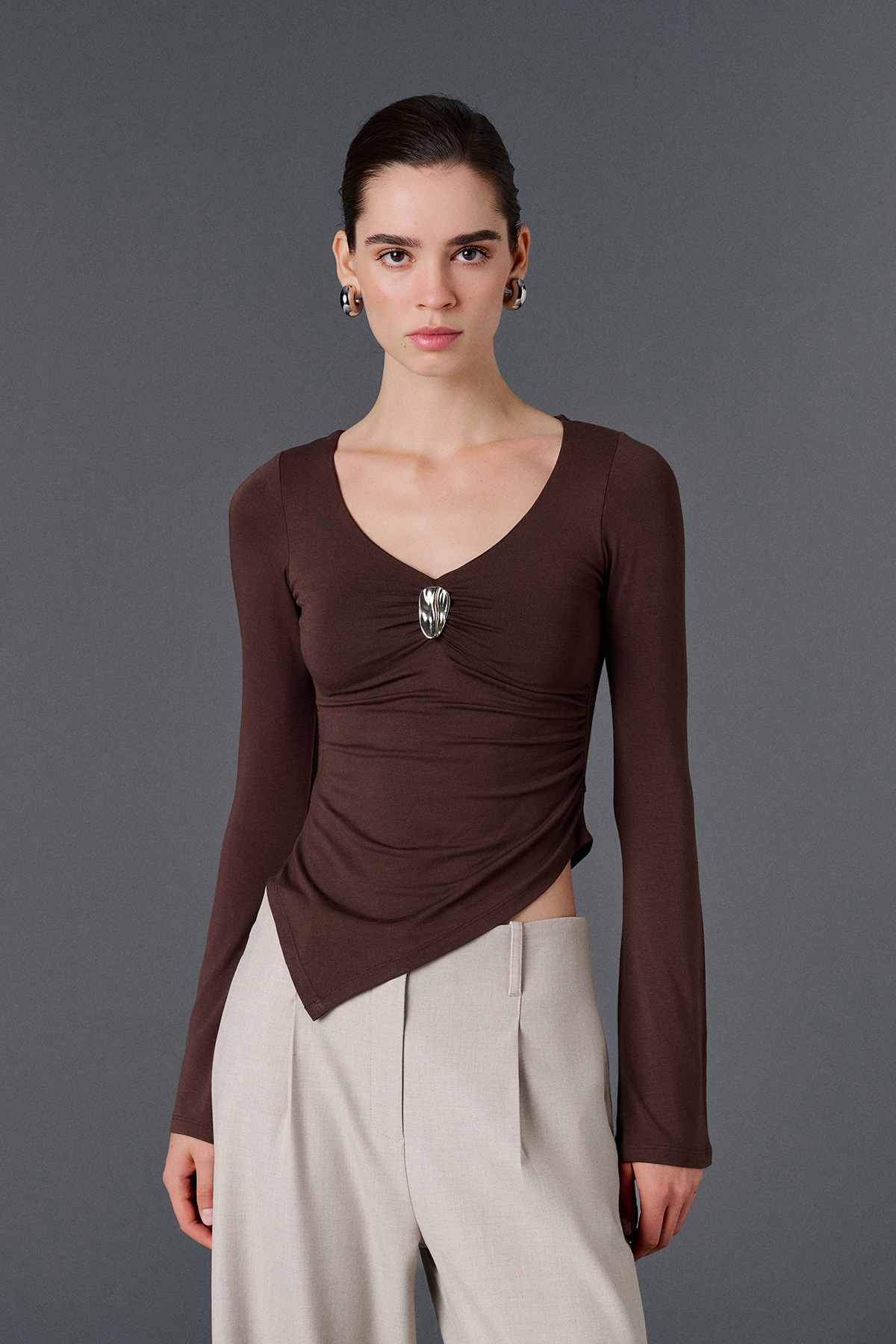 Asimetrik kesim, aksesuar detaylı, sol tarafı büzgülü, derin V yaka, uzun kollu, tam kalıp bluz.