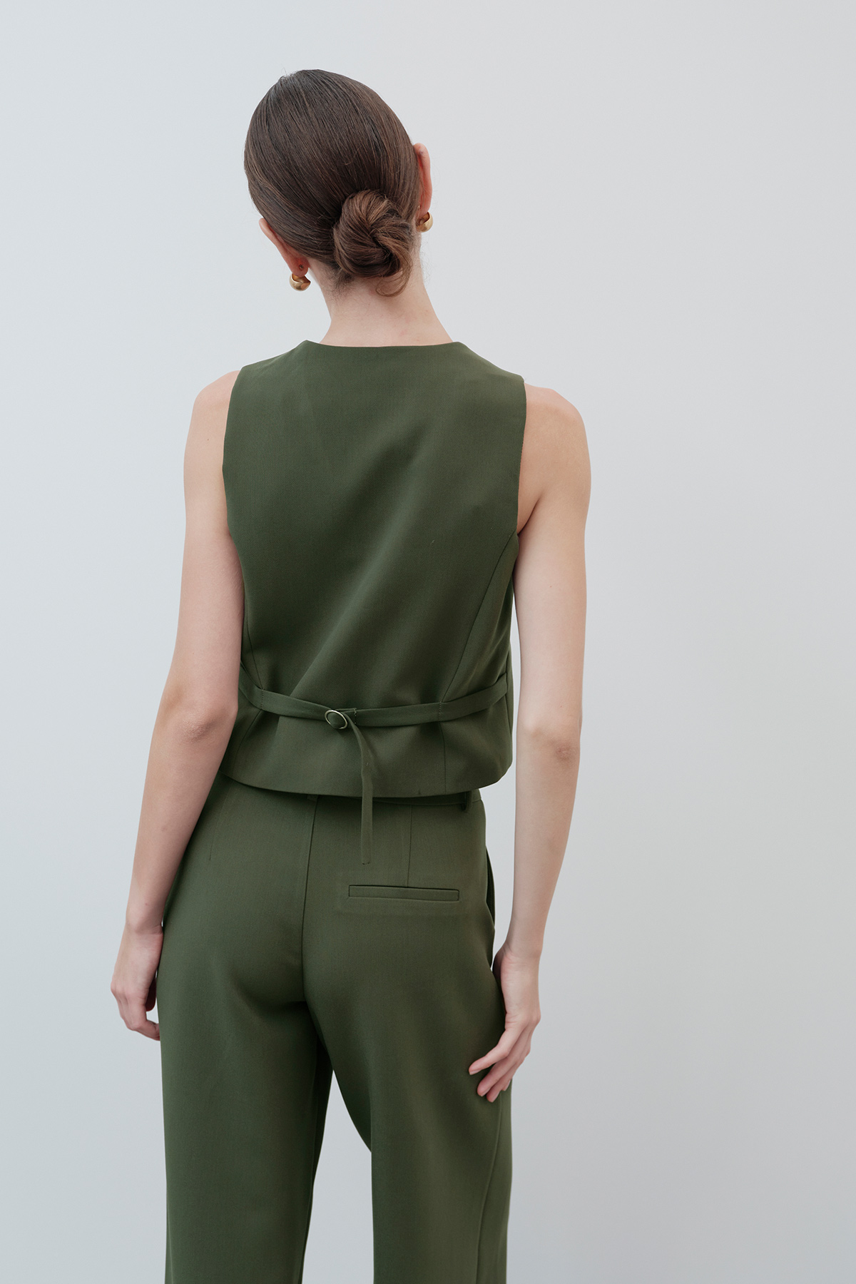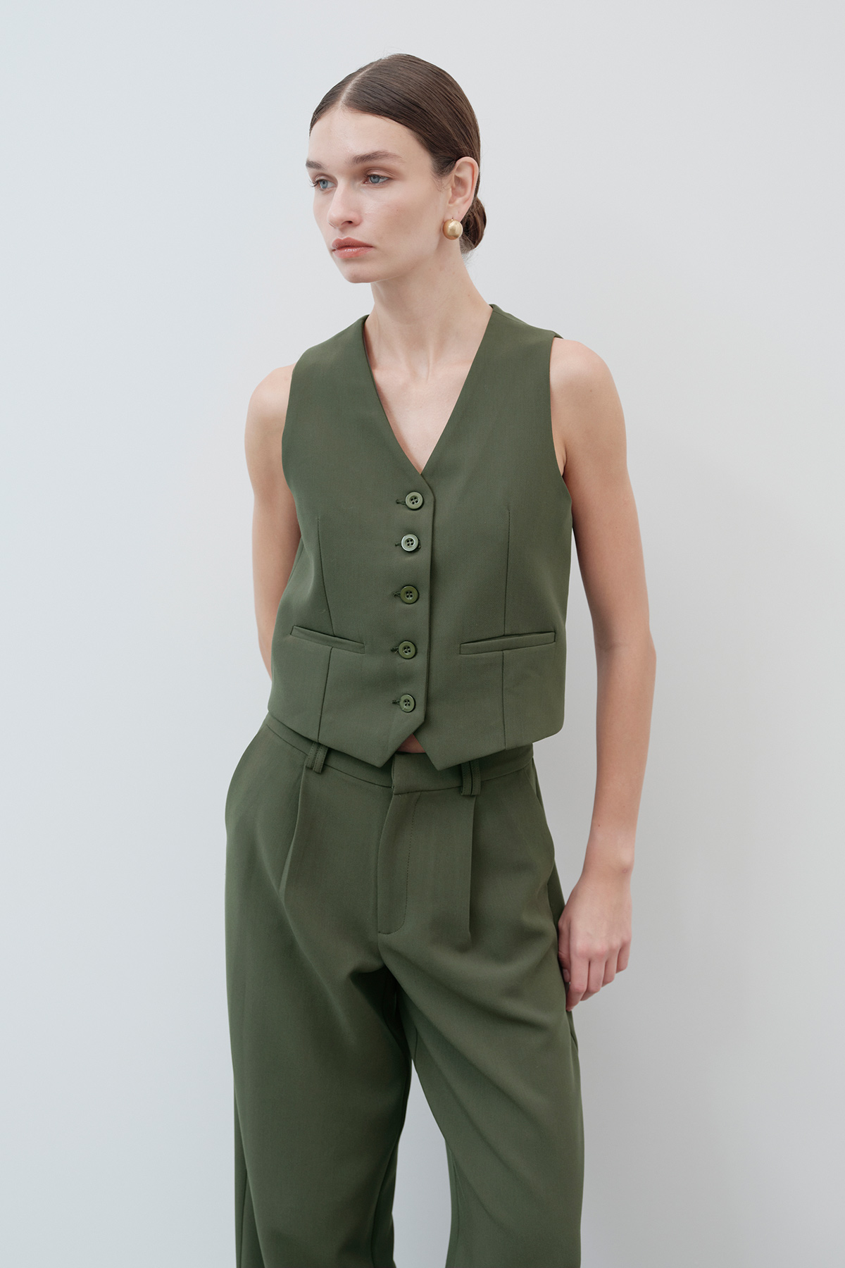 V yaka, kolsuz, önü düğmeli,astarlı, cepsiz, tam kalıp kısa yelek