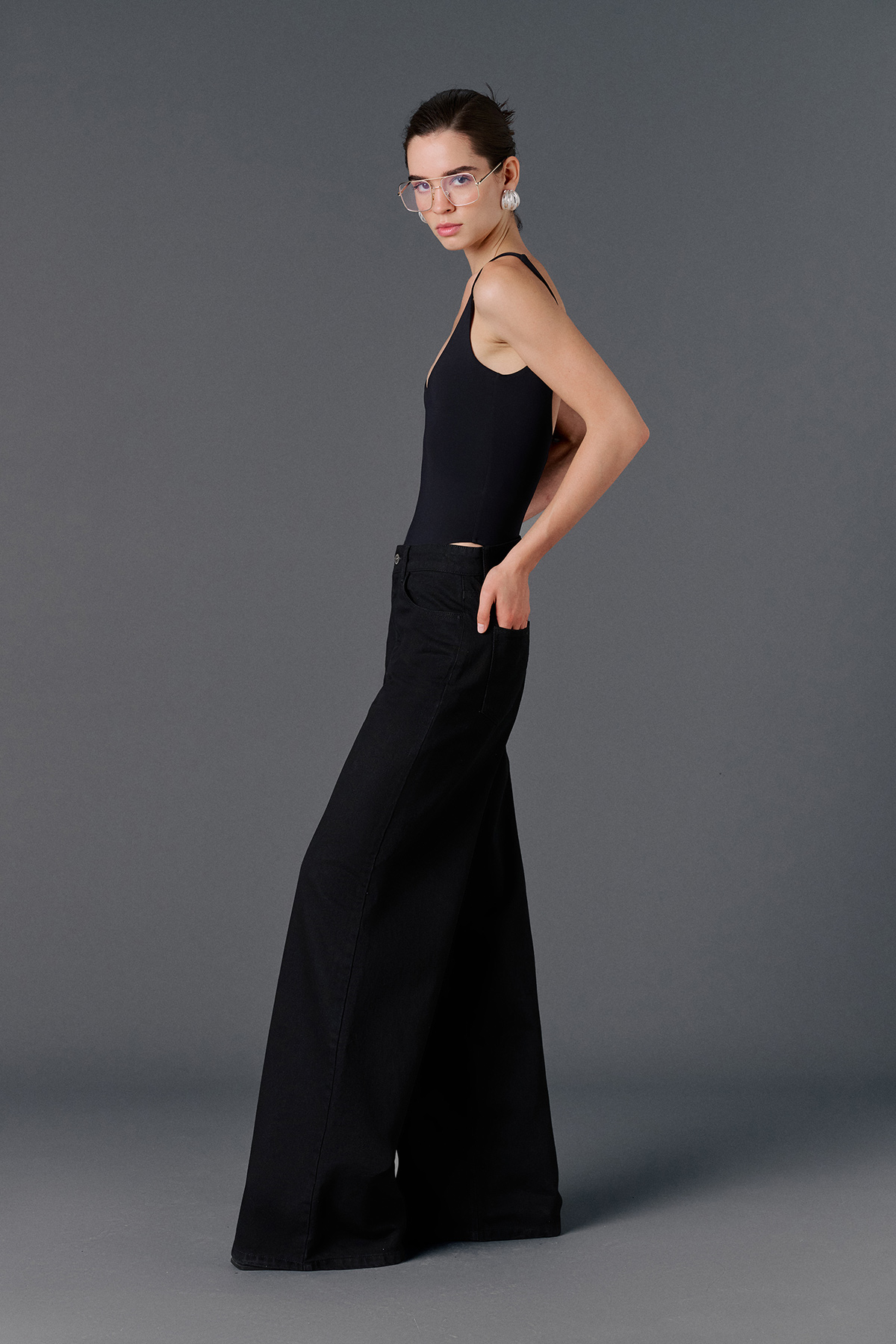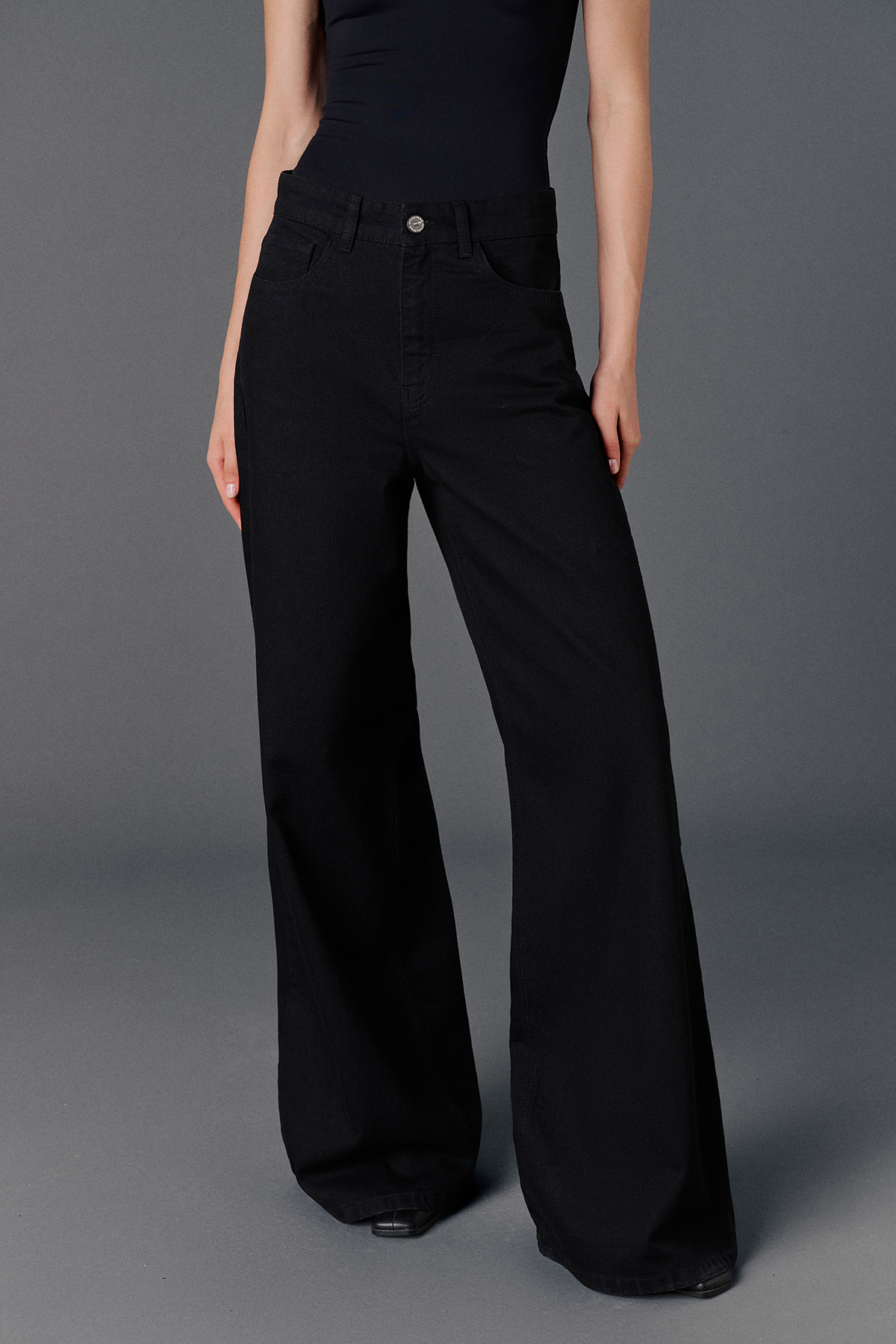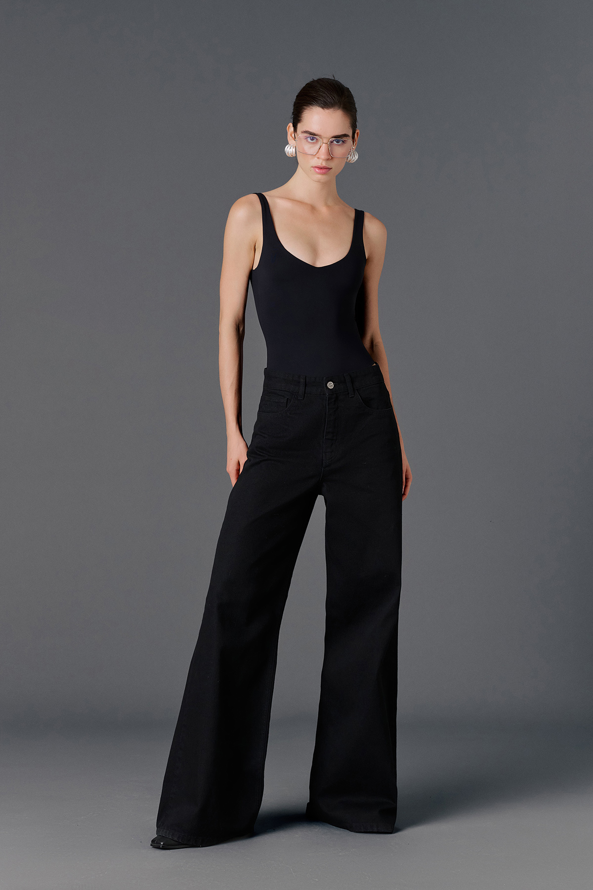 Yüksek bel, düğmeli ve fermuarlı, bol paça,  wide leg jean.