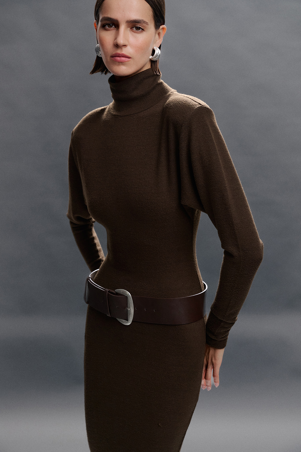 Vücuda oturan, balıkçı yaka, vatkalı, yarasa kol, örme kumaş, maxi elbise.