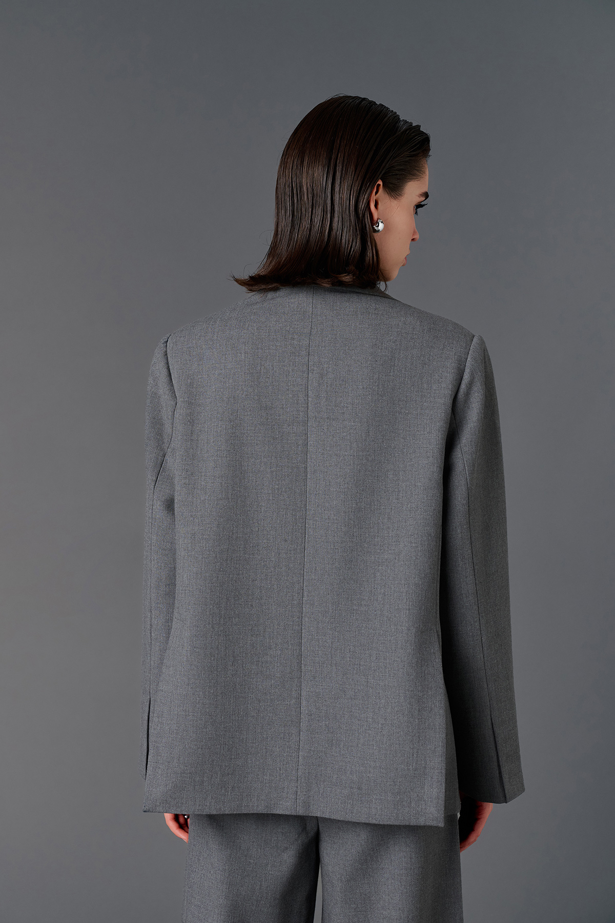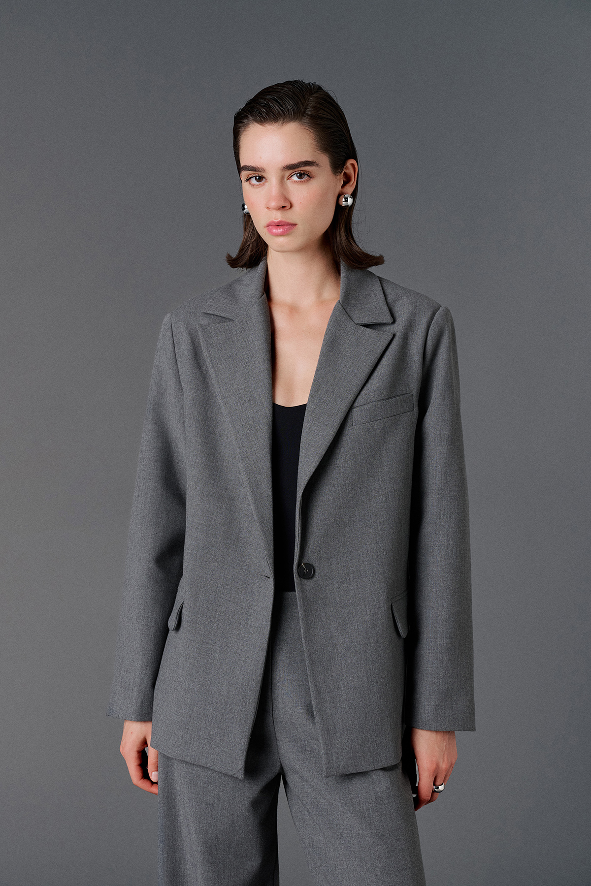 Oversize, önü tek düğmeli, vatkalı, astarlı, üç adet işlevsiz cep aksesuarlı, arkadan çift yırtmaçlı kruvaze yaka blazer ceket.