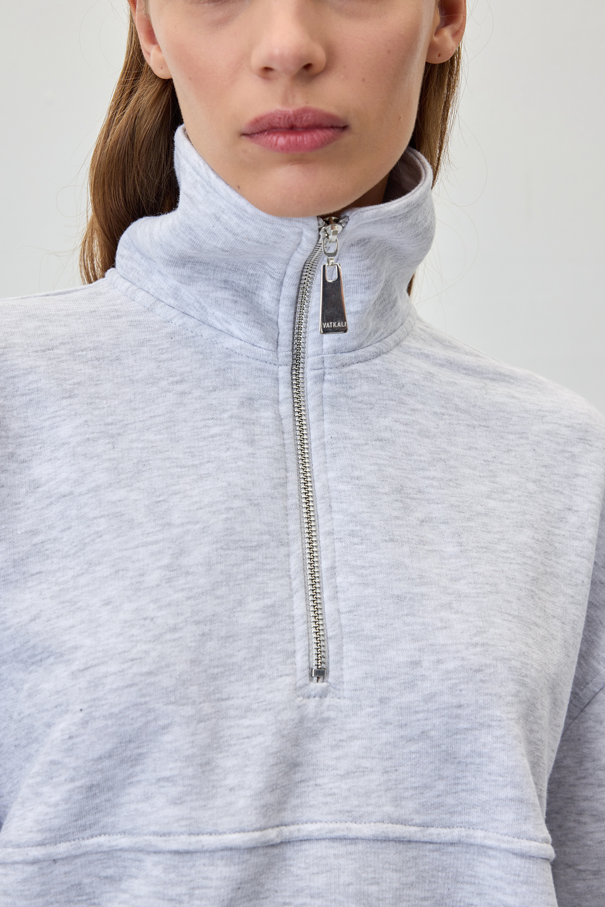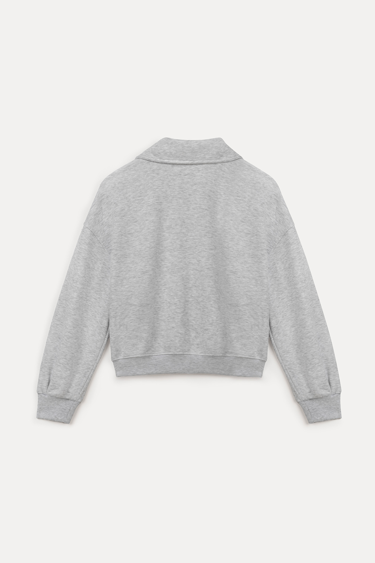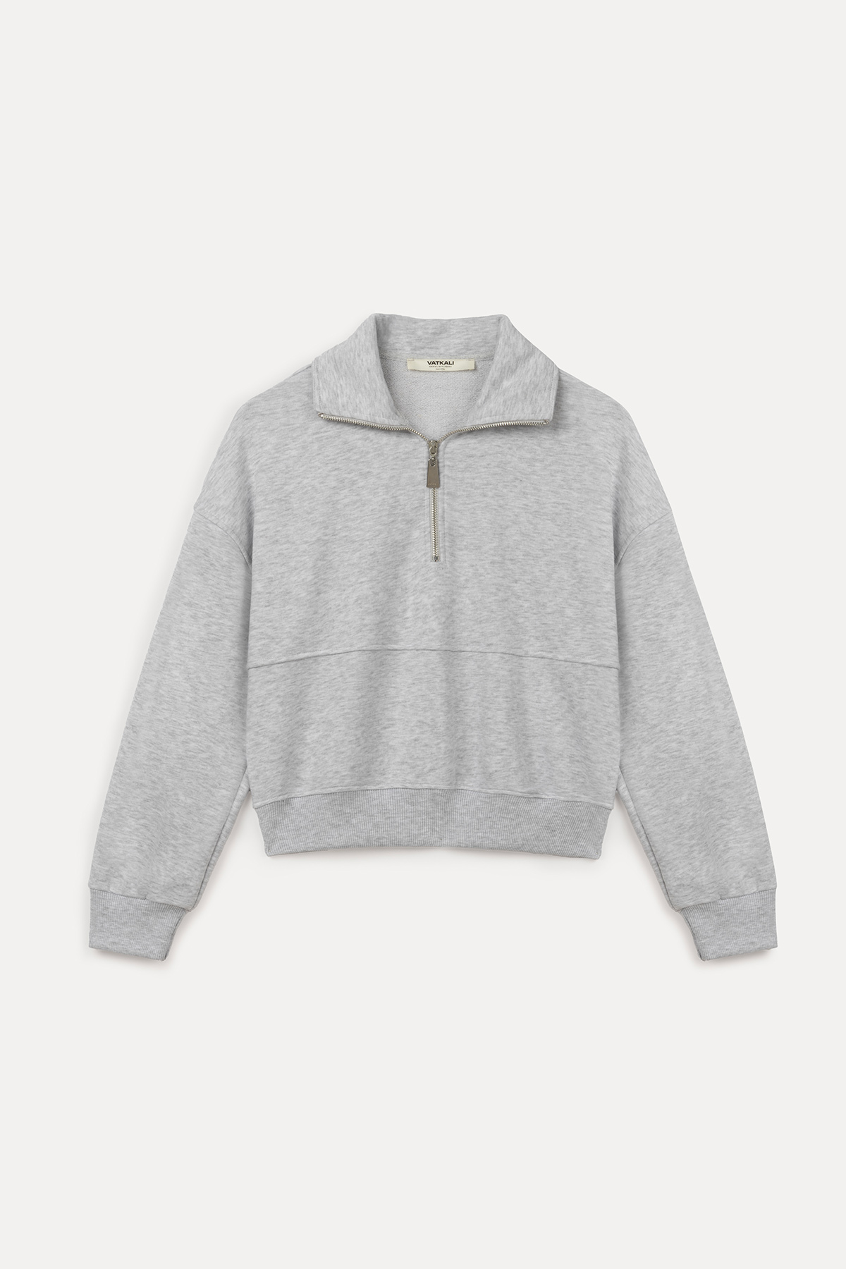 Boğazlı, uzun kollu, önü yarım fermurlı, pamuklu, oversıze kalıp sweatshirt.