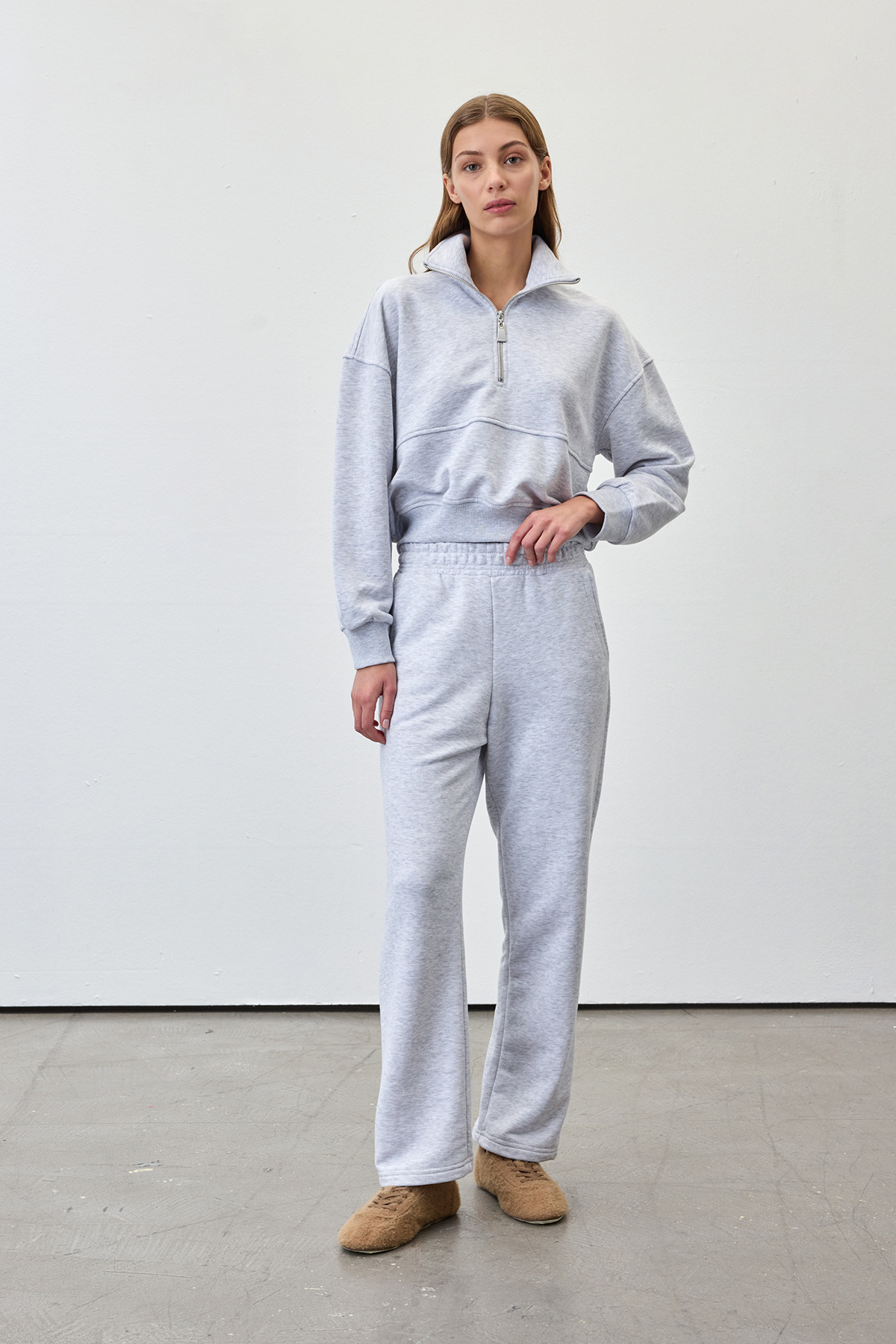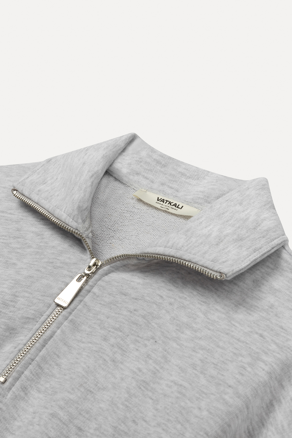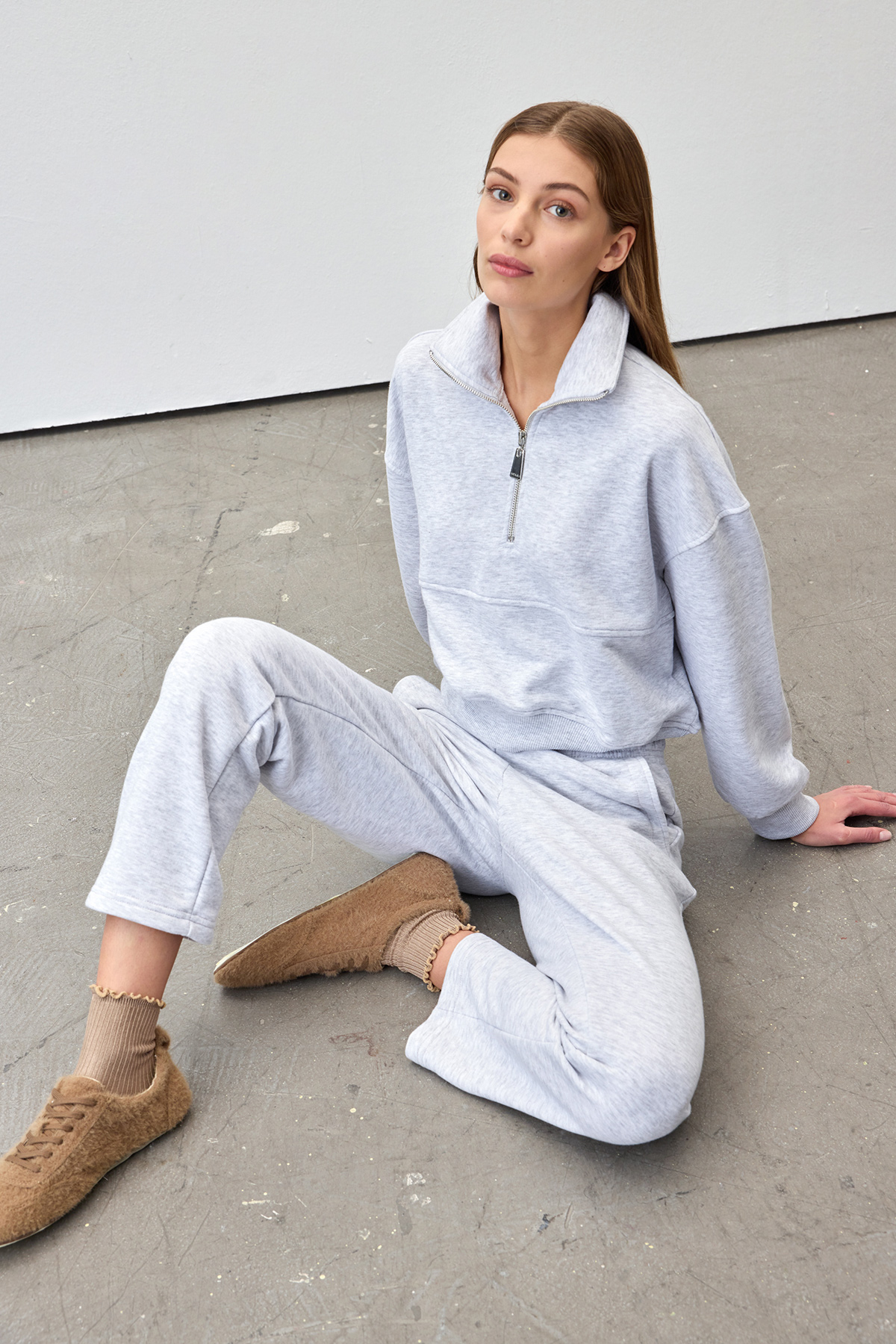 Boğazlı, uzun kollu, önü yarım fermurlı, pamuklu, oversıze kalıp sweatshirt.
