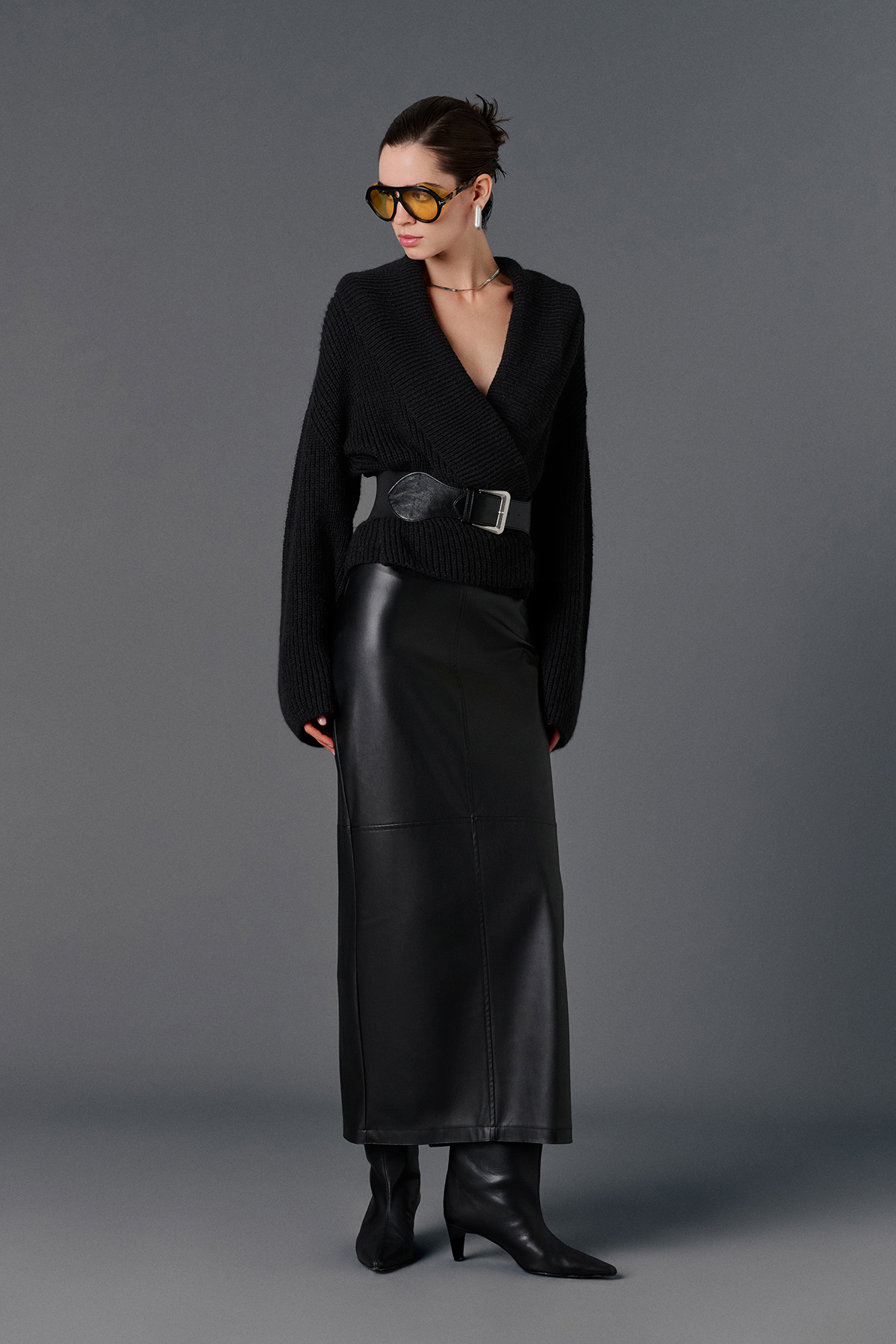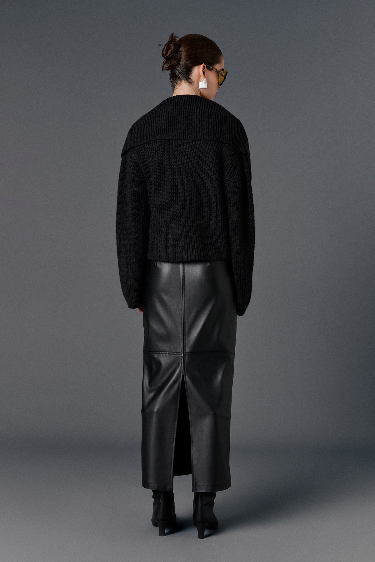 Deri görünümlü, dikiş detaylı, arkası yırtmaçlı, midi boy, fermuar kapamalı etek.