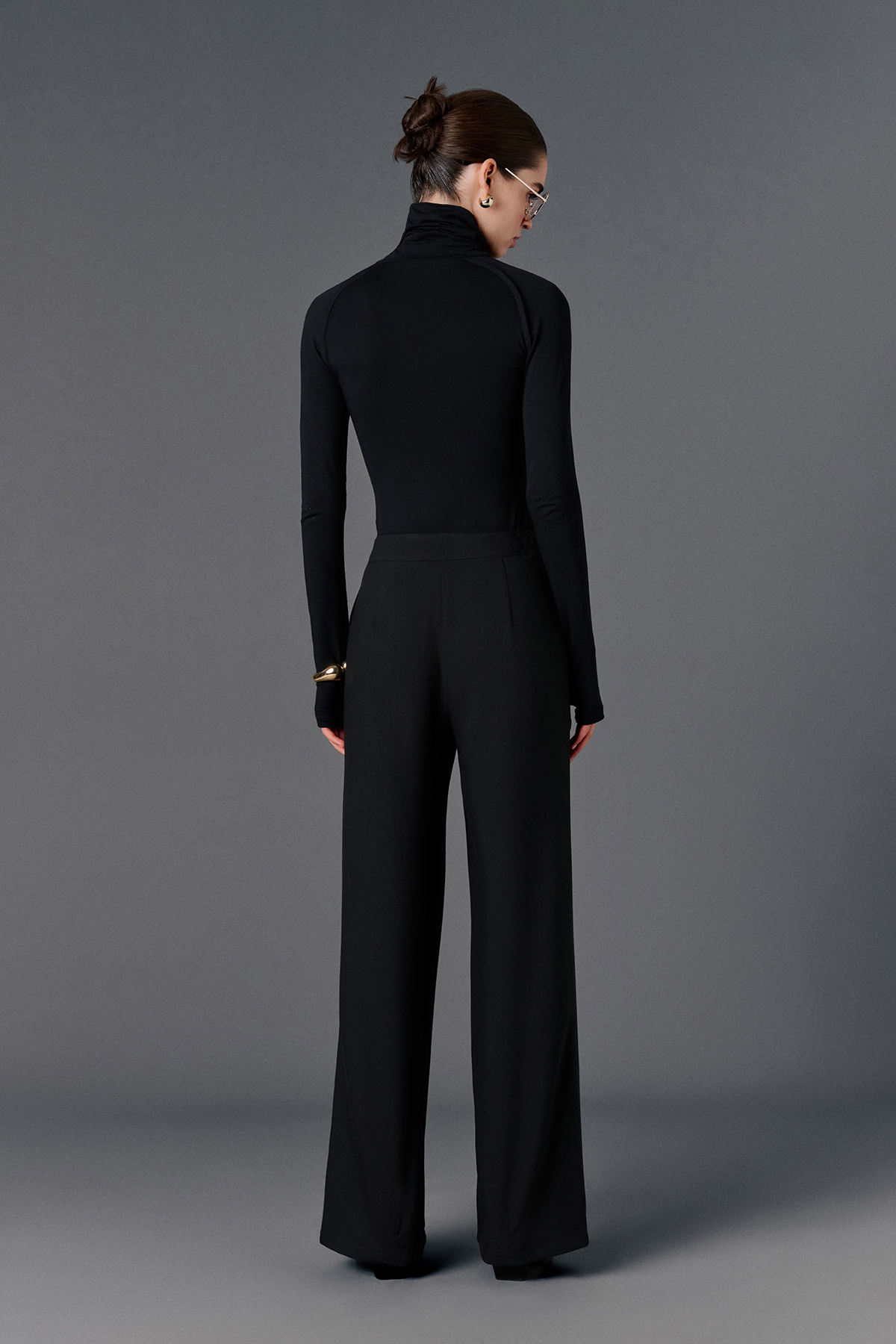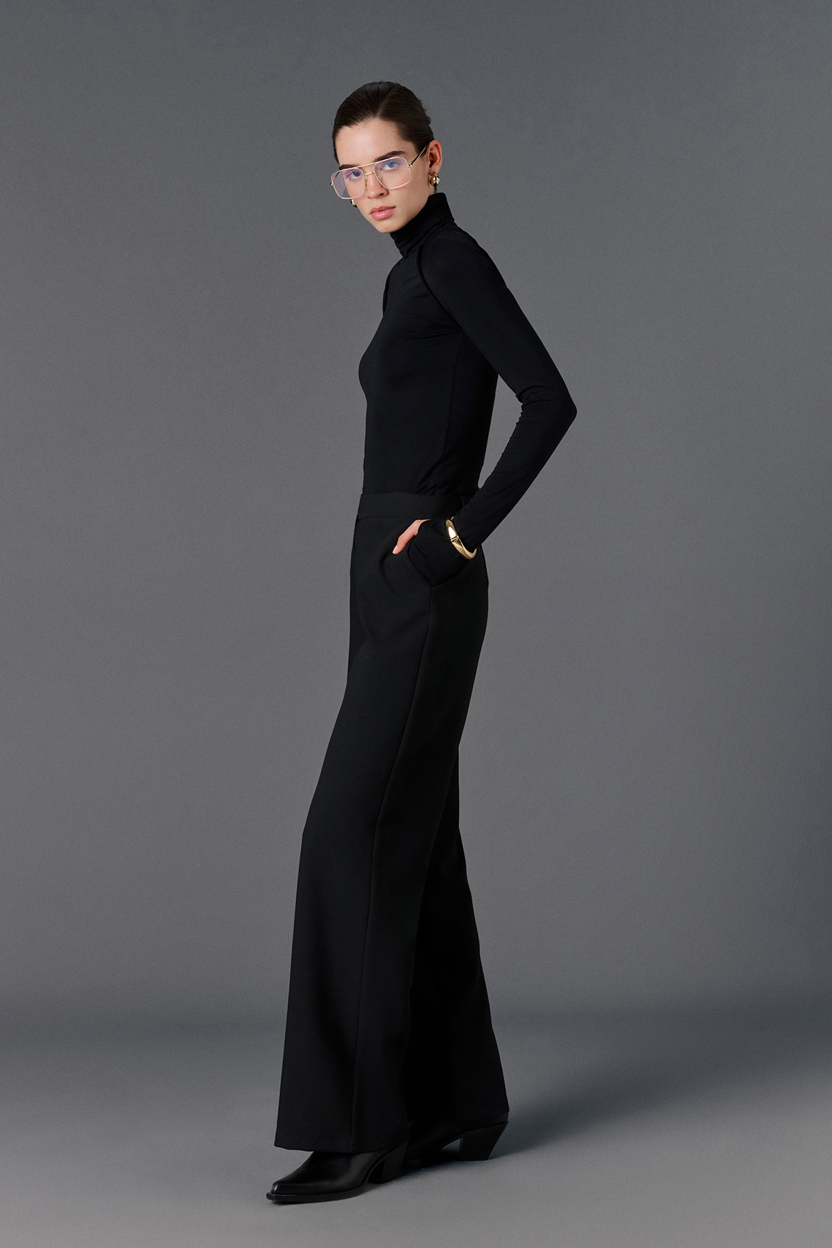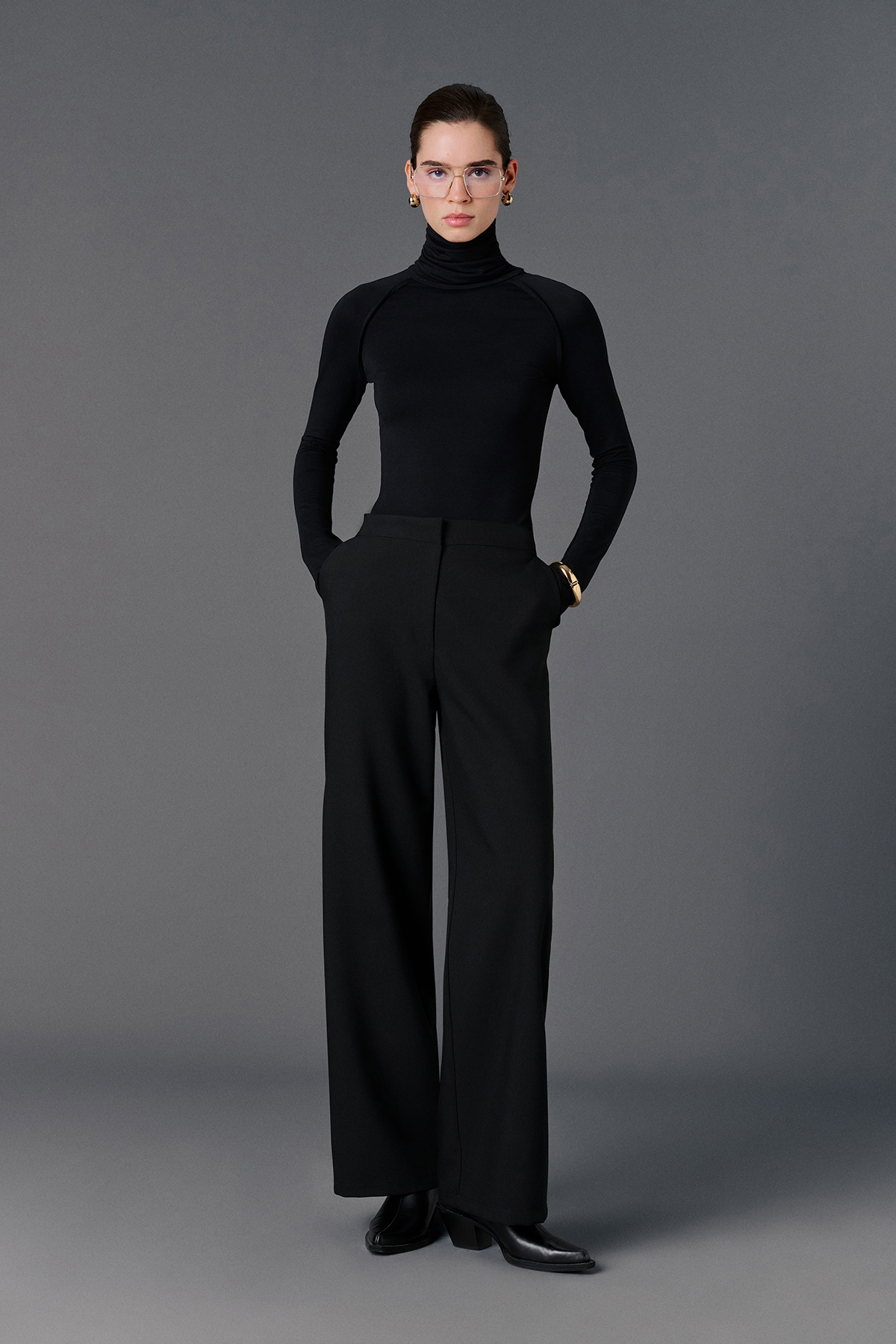 Yüksek bel, düğmeli ve fermuarlı, astarsız, tam kalıp, düz kesim pantolon