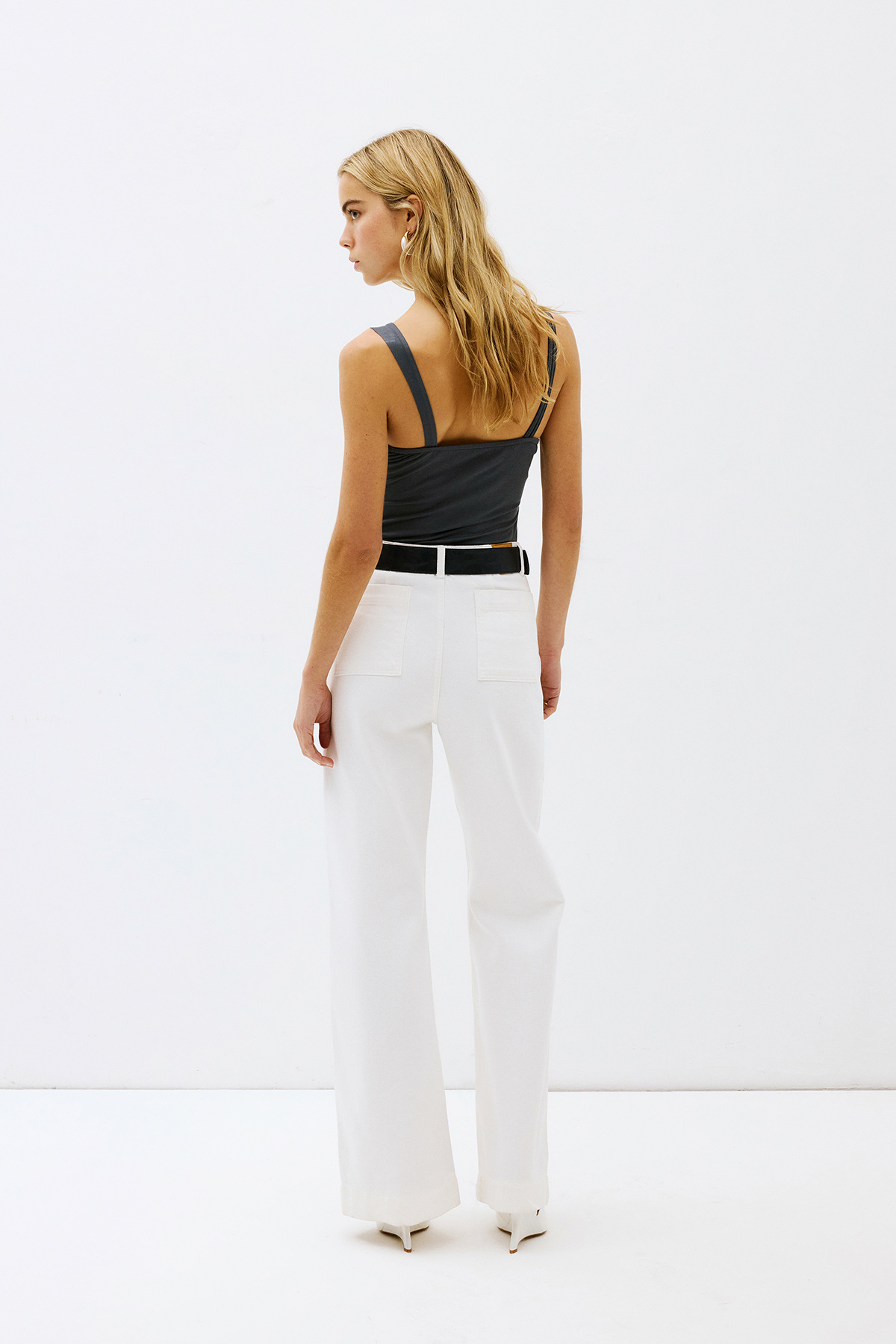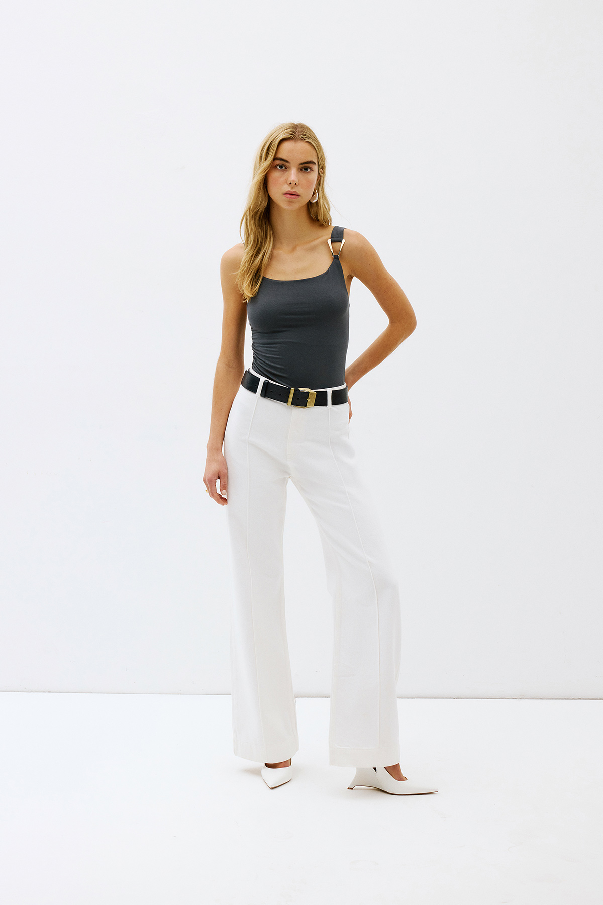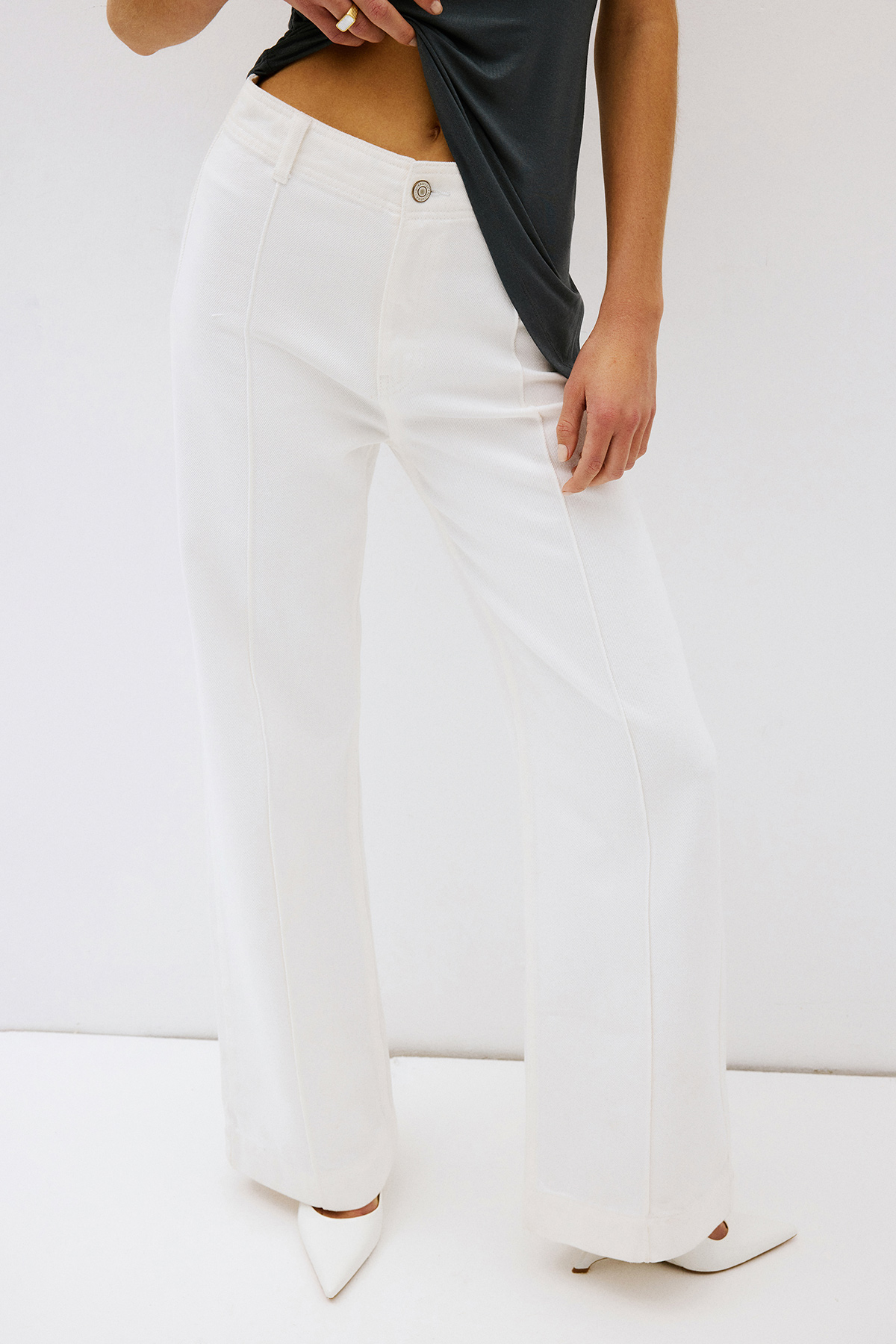 Yüksek bel, düğmeli ve fermuarlı, arkası 2 cepli, dikiş detaylı, bol paça, tam kalıp jean.