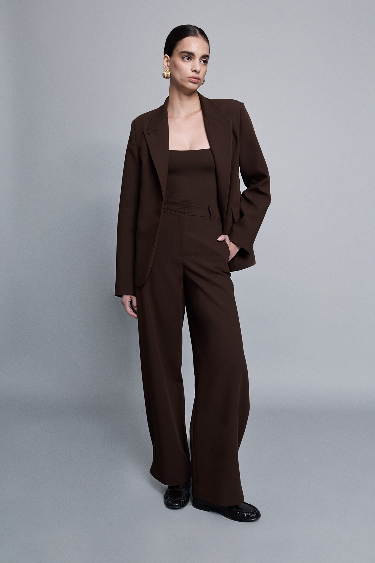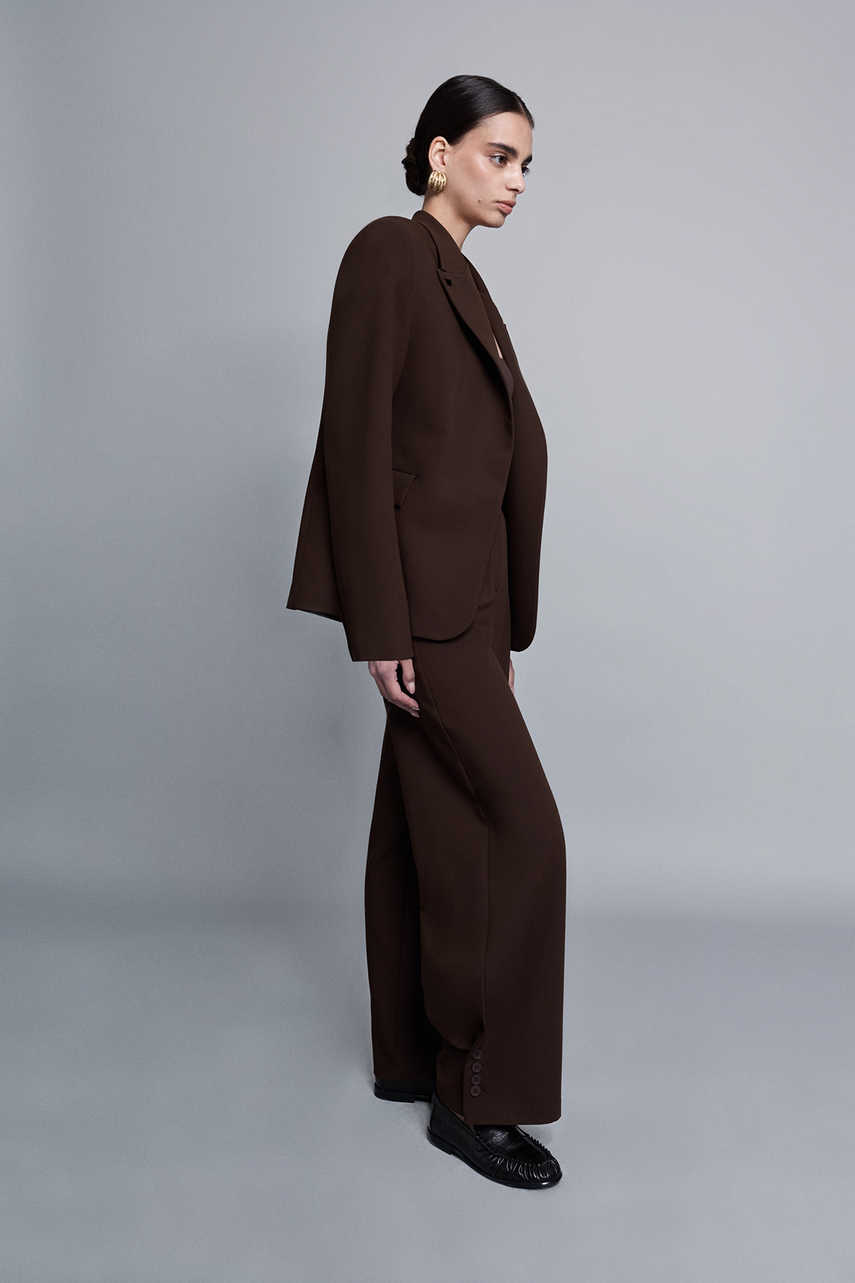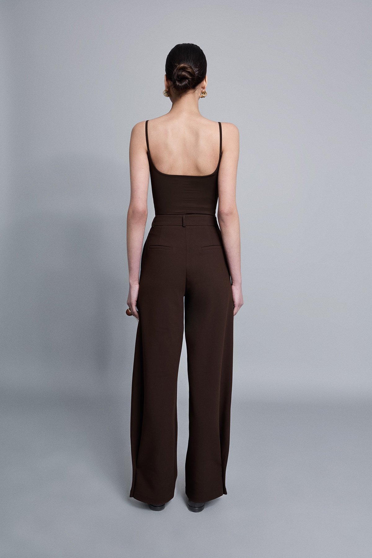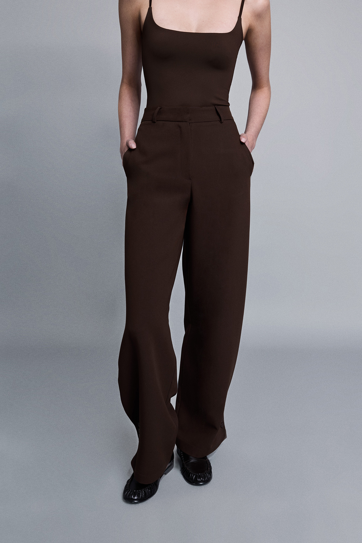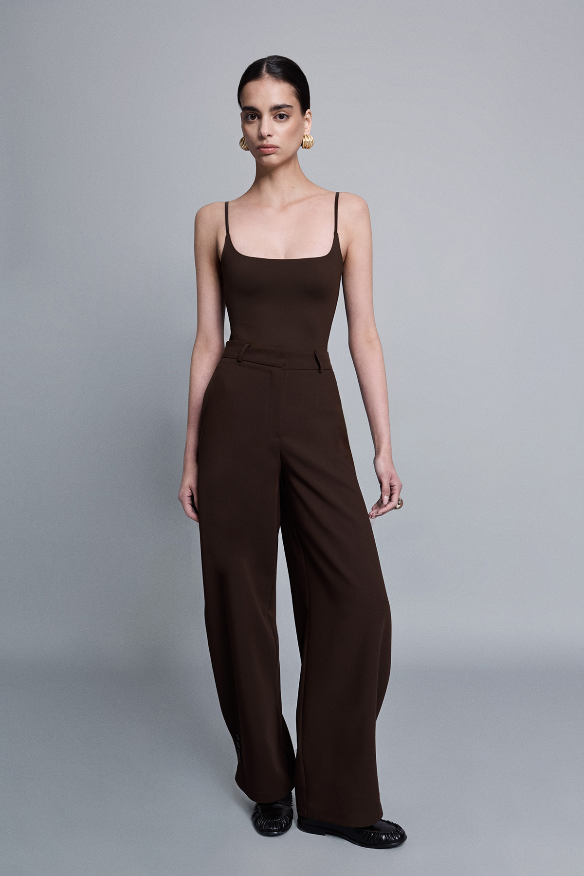 Paçası aksesuar düğmeli, yüksek bel, düğme, klips ve fermuar kapamalı, yanlardan 2 cepli relaxed fit pantolon.