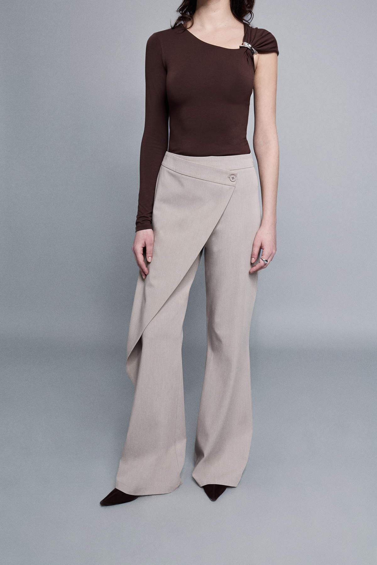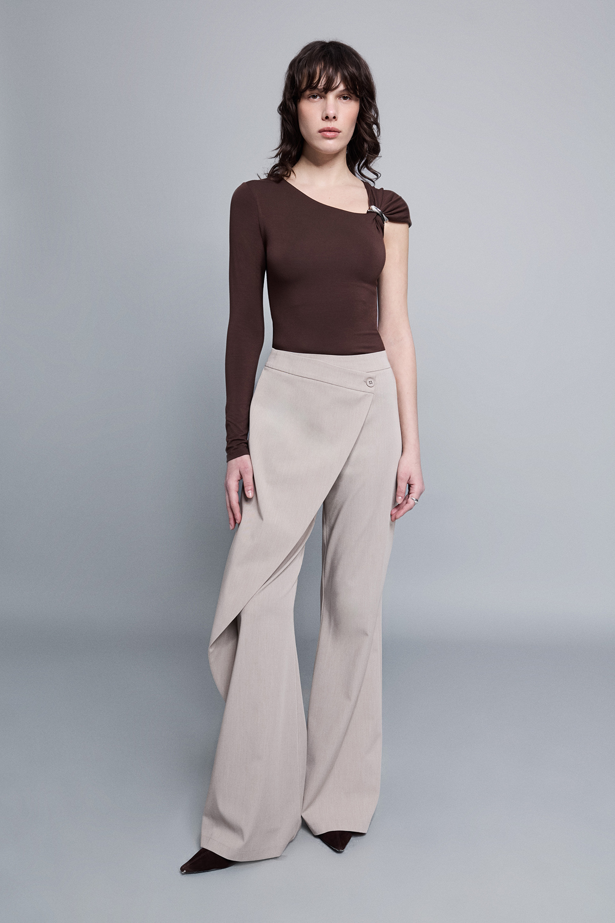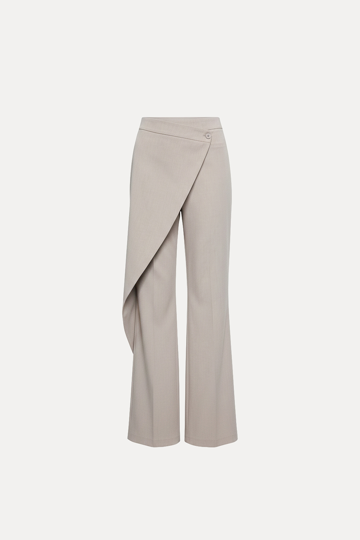 Yüksek bel, yanlardan çift cepli, asimetrik parça detaylı, flare kesim kumaş pantolon.