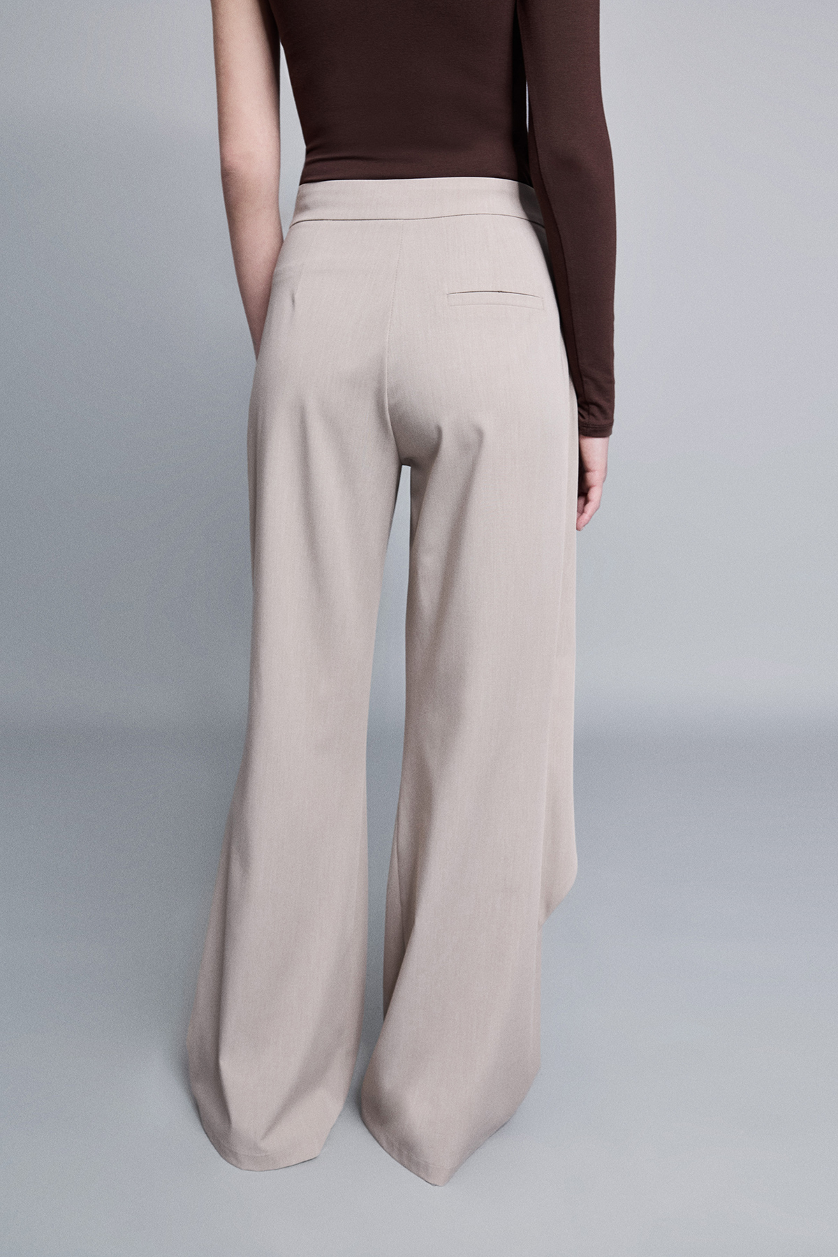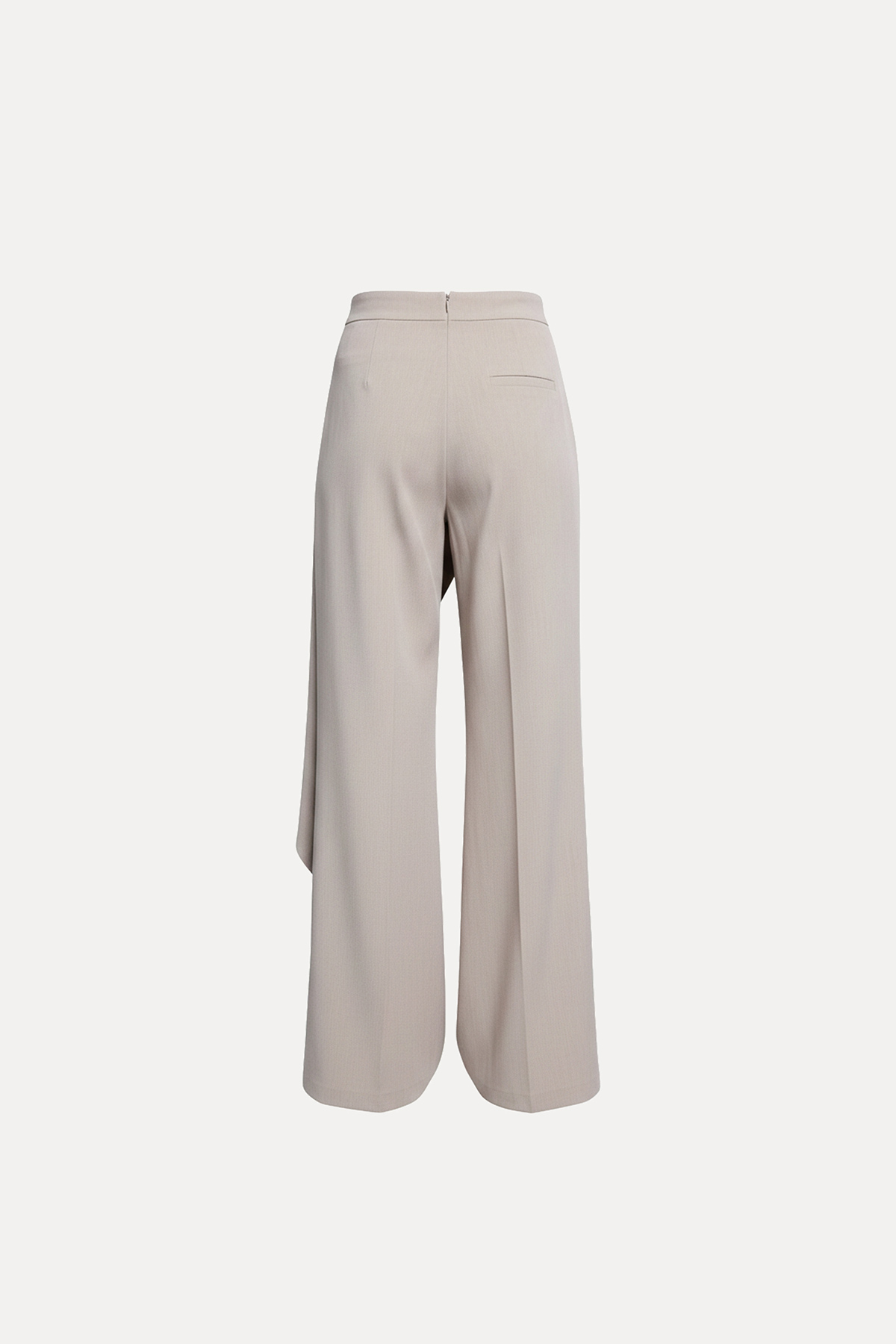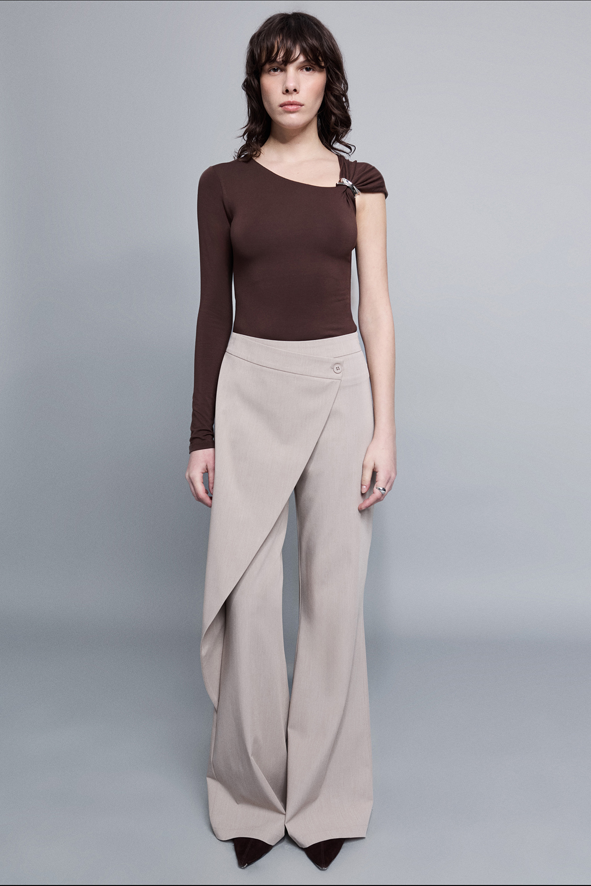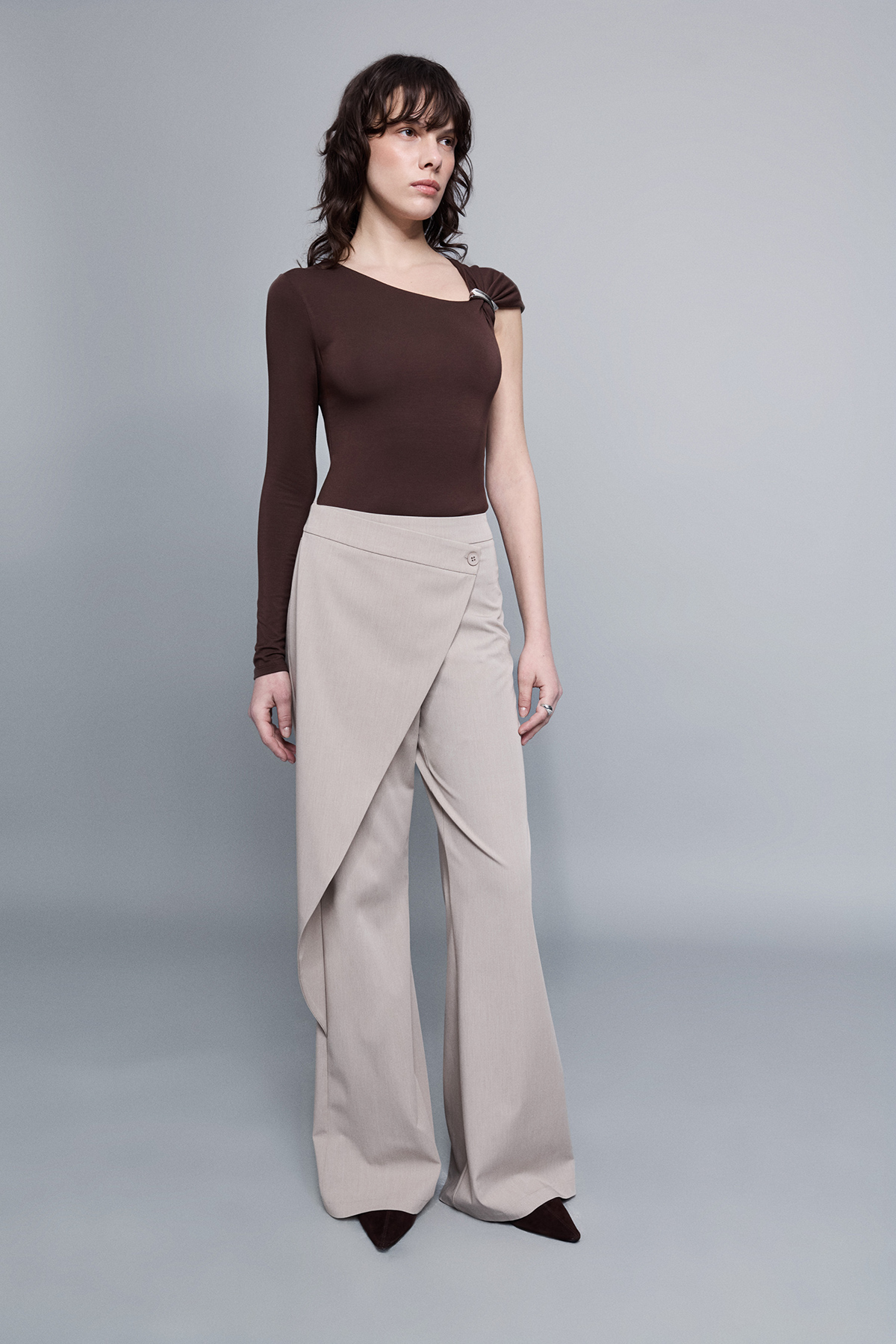 Yüksek bel, yanlardan çift cepli, asimetrik parça detaylı, flare kesim kumaş pantolon.