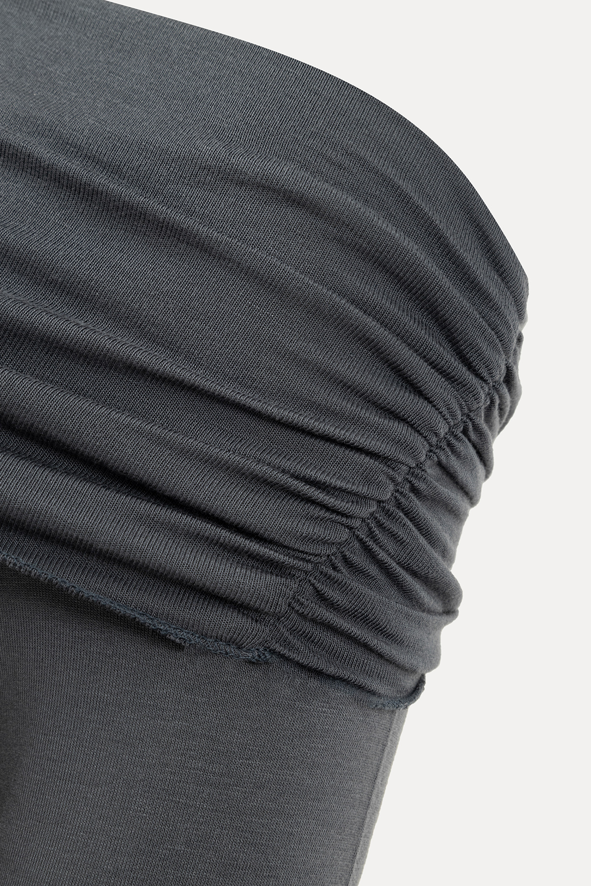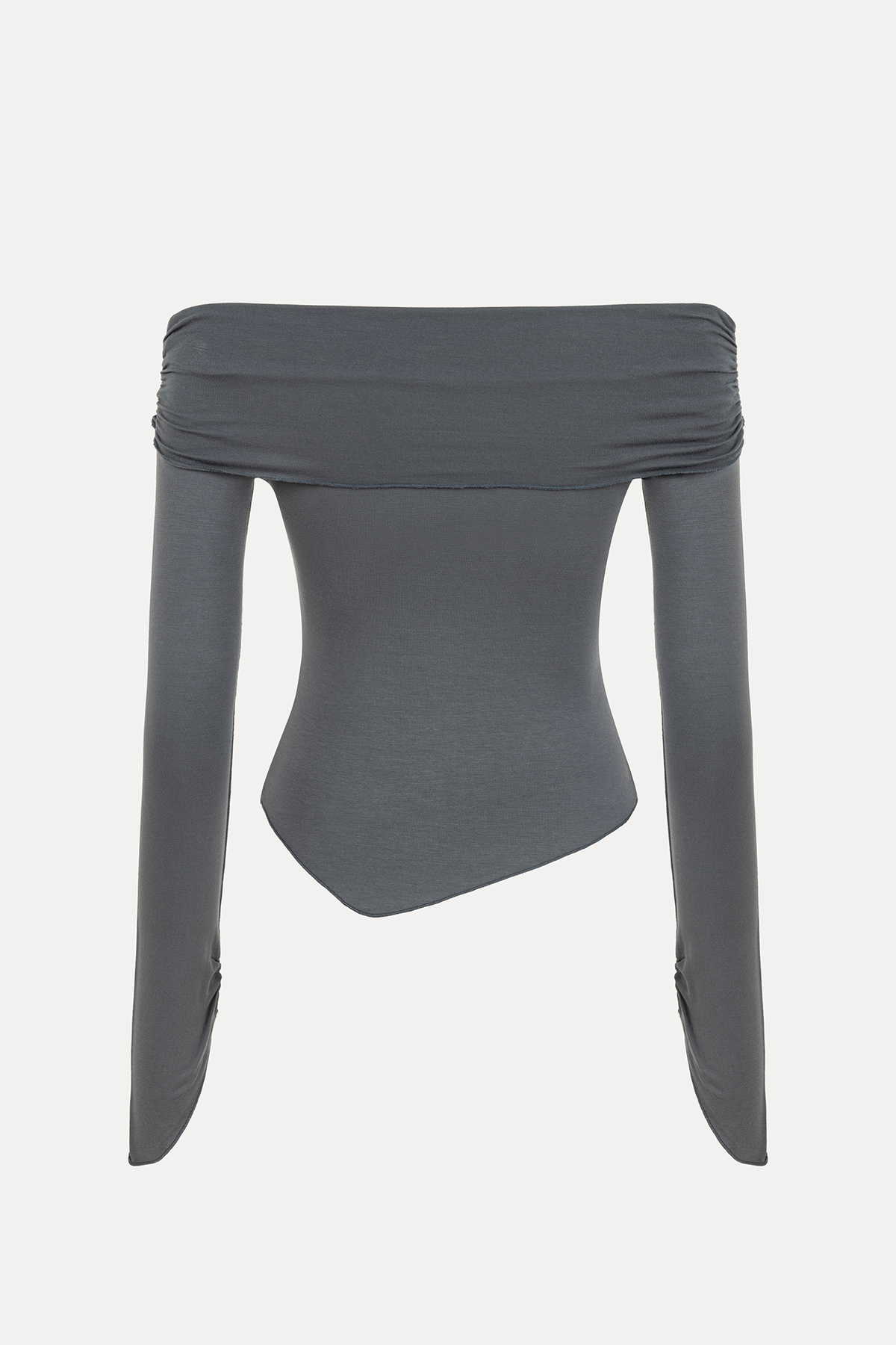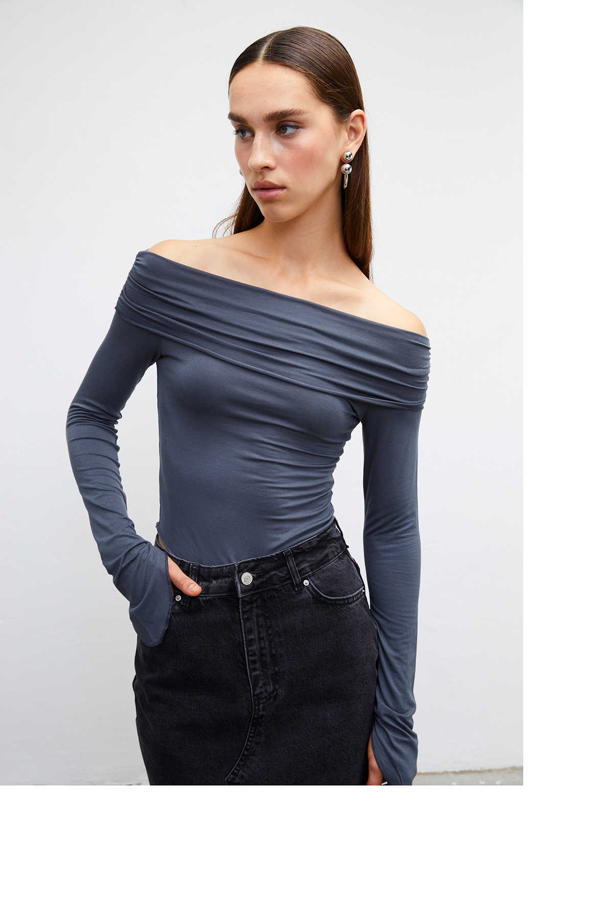 Asimetrik kesim, omuzları açık, uzun kollu, tam kalıp bluz
