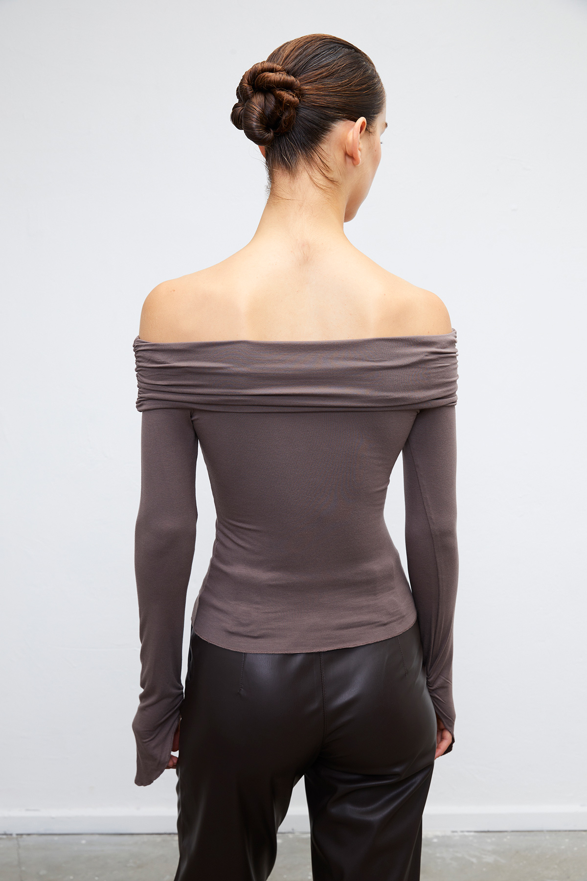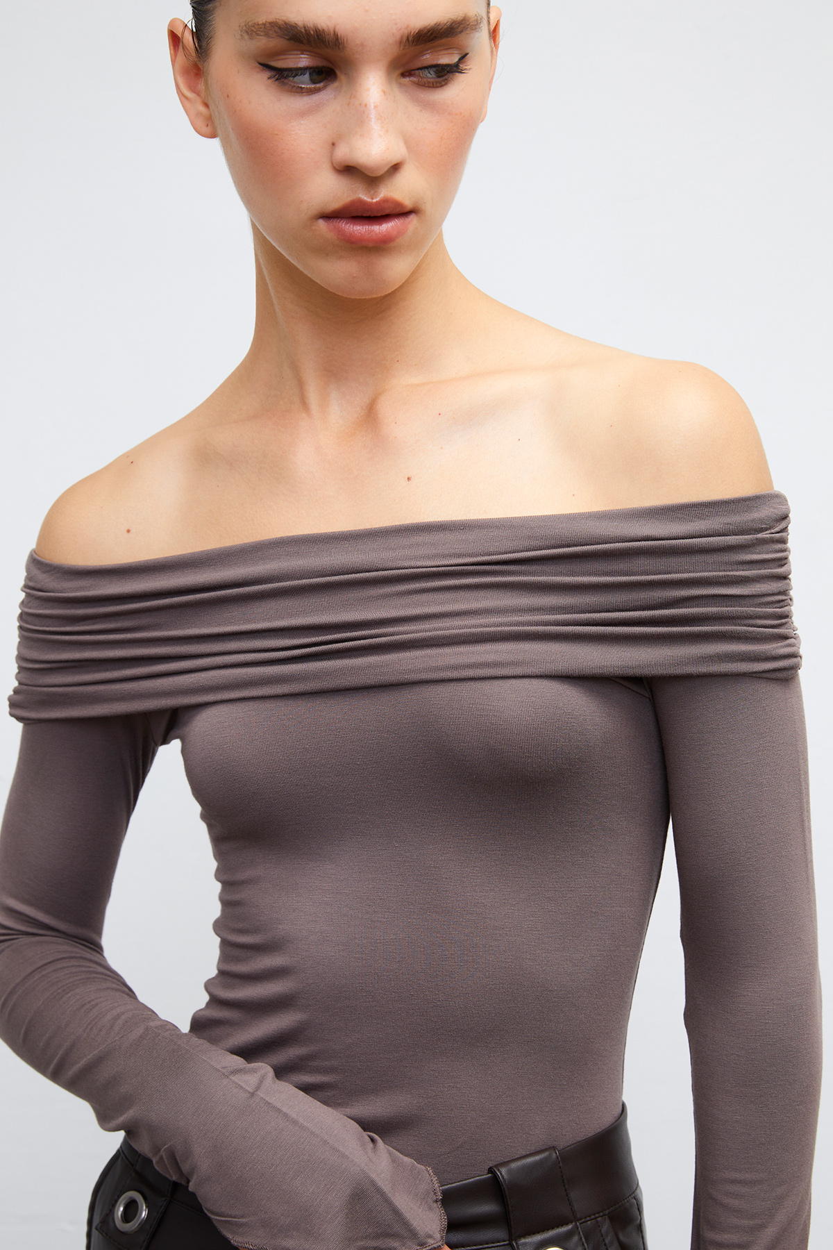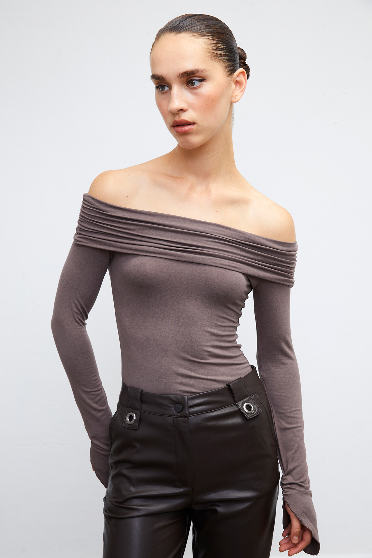 Asimetrik kesim, omuzları açık, uzun kollu, tam kalıp bluz