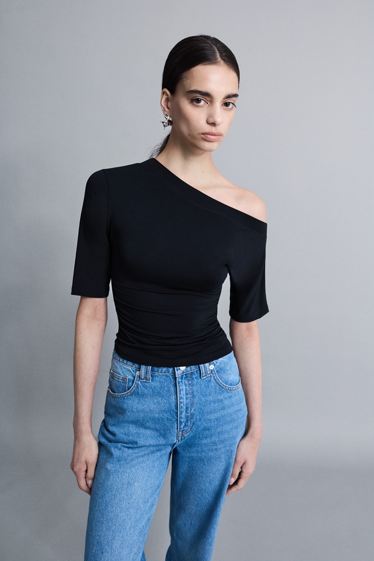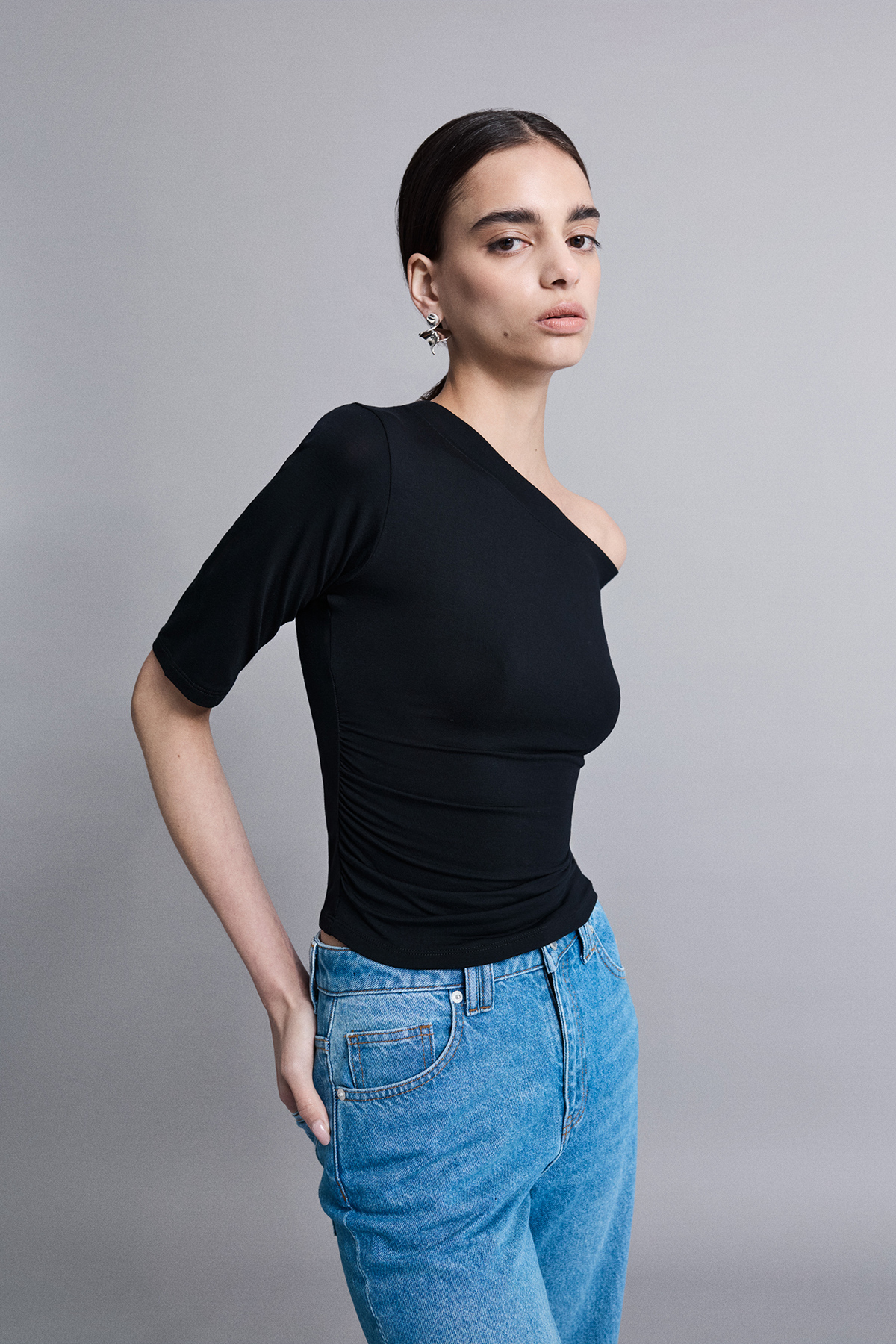 Asimetrik yaka büzgülü bluz