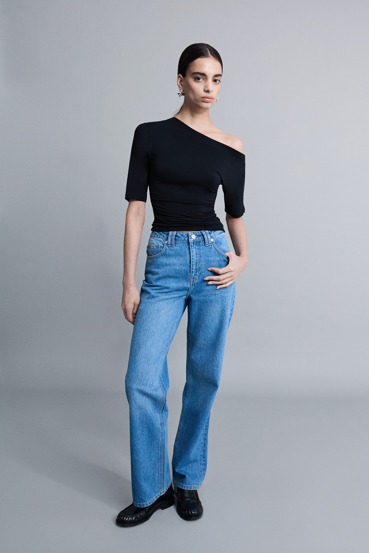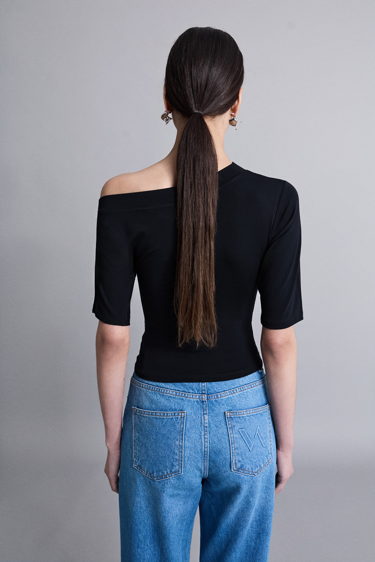 Asimetrik yaka, fakir kol, omuzları açık, tam kalıp örme bluz.