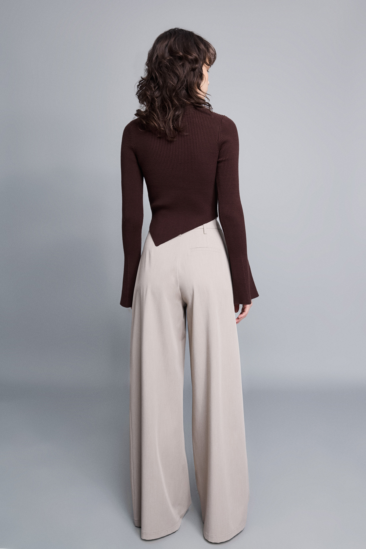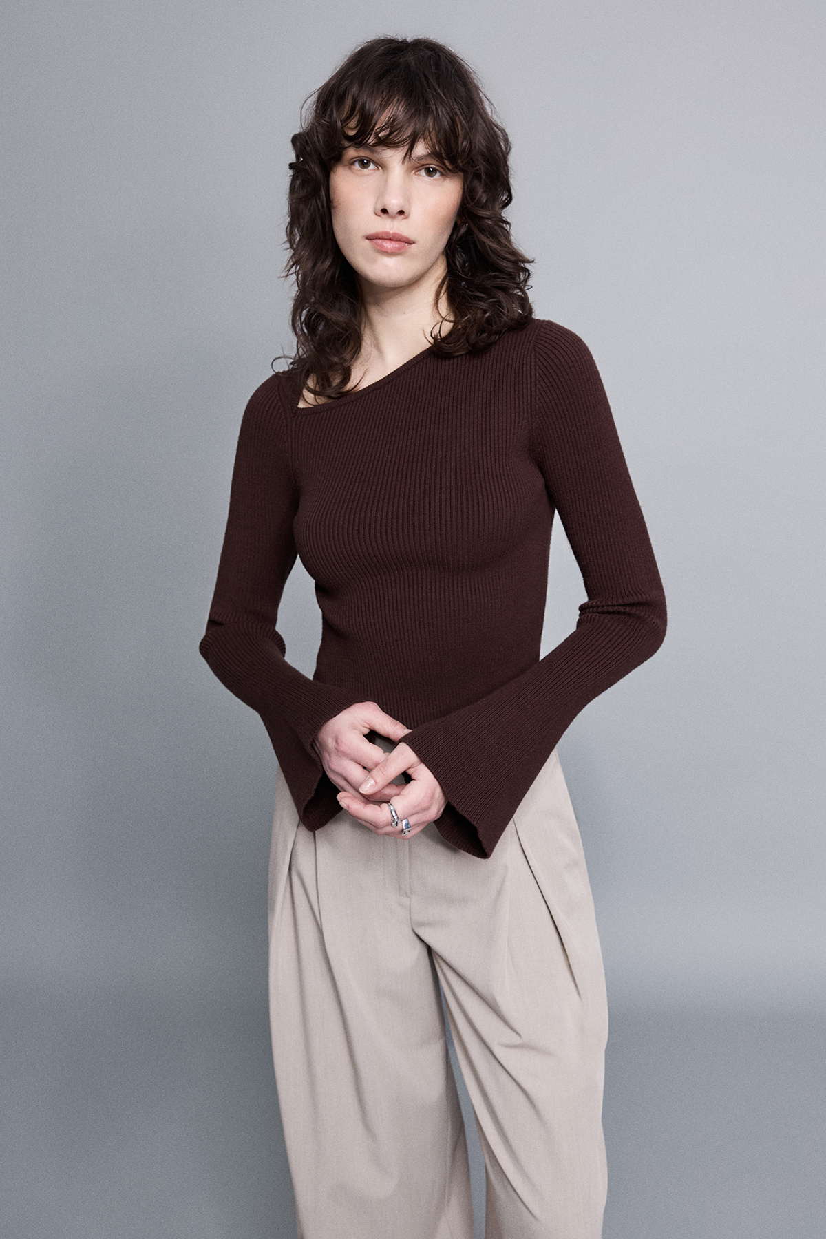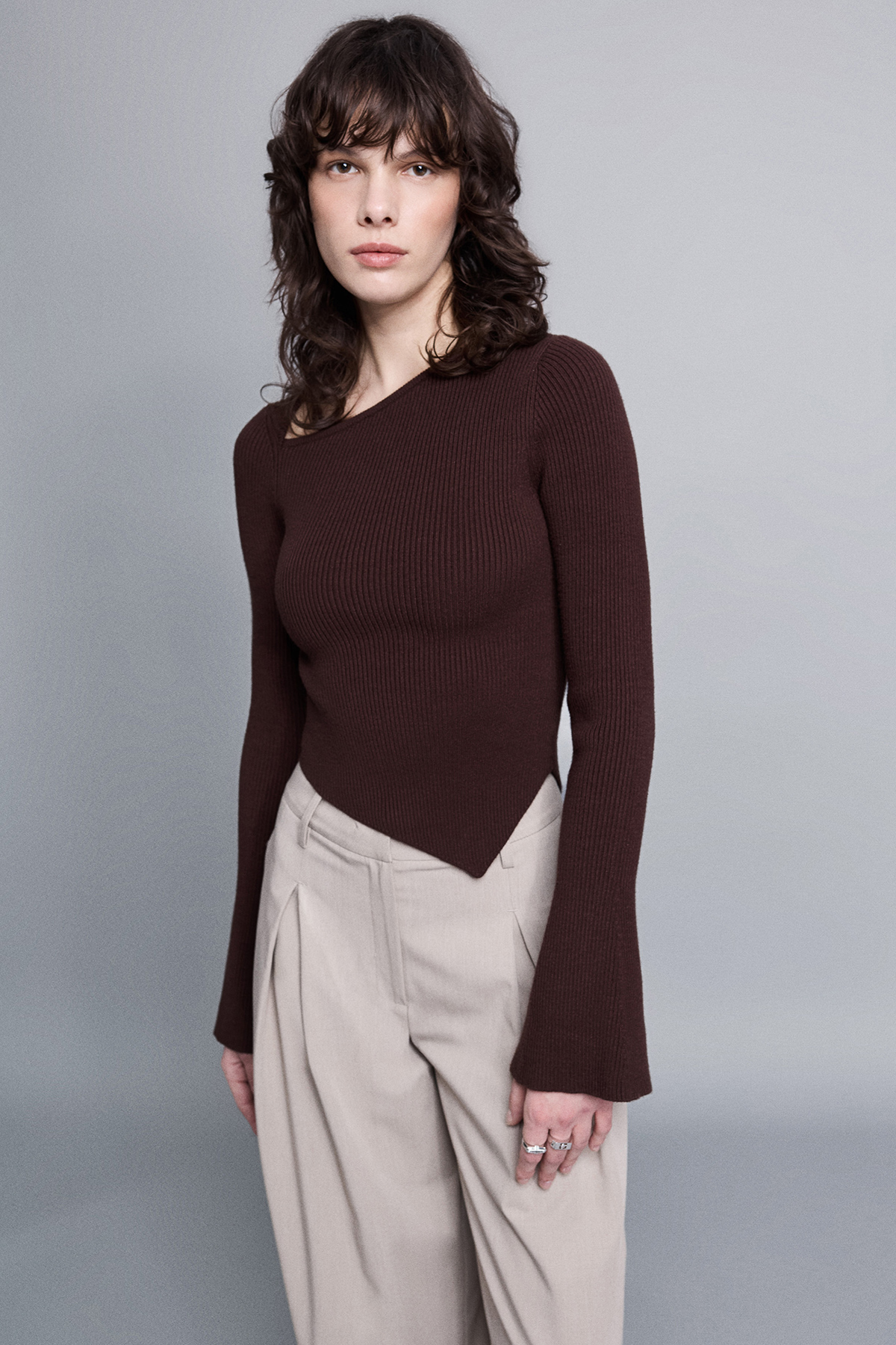 Asimetrik kesim, ispanyol kol, tam kalıp, triko bluz.