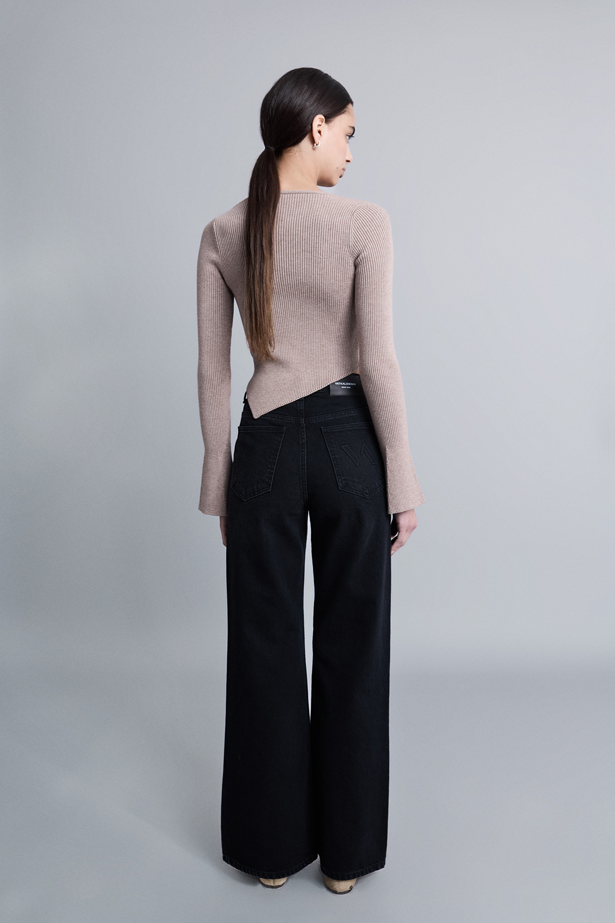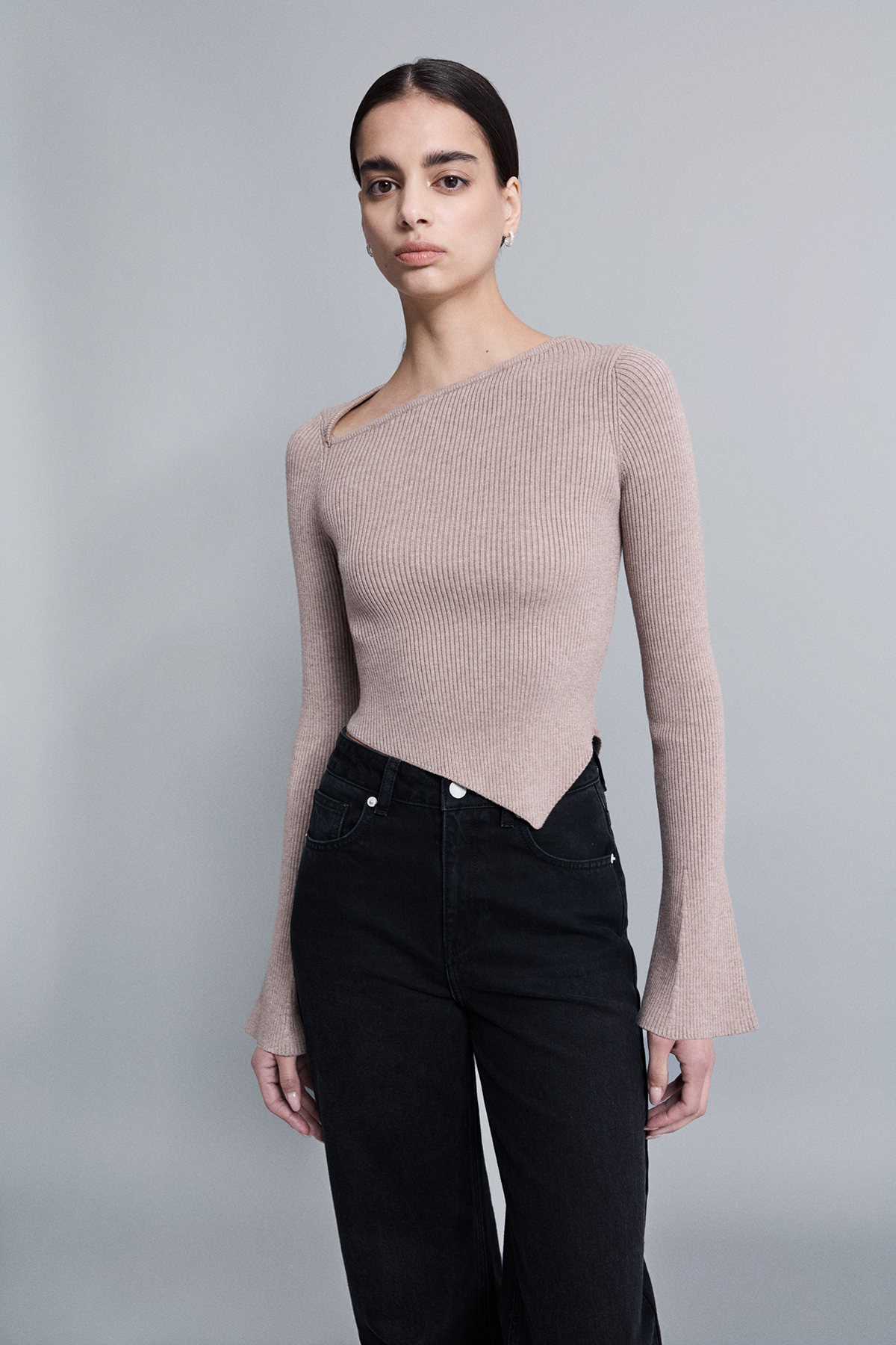 Asimetrik kesim, ispanyol kol, tam kalıp, triko bluz.