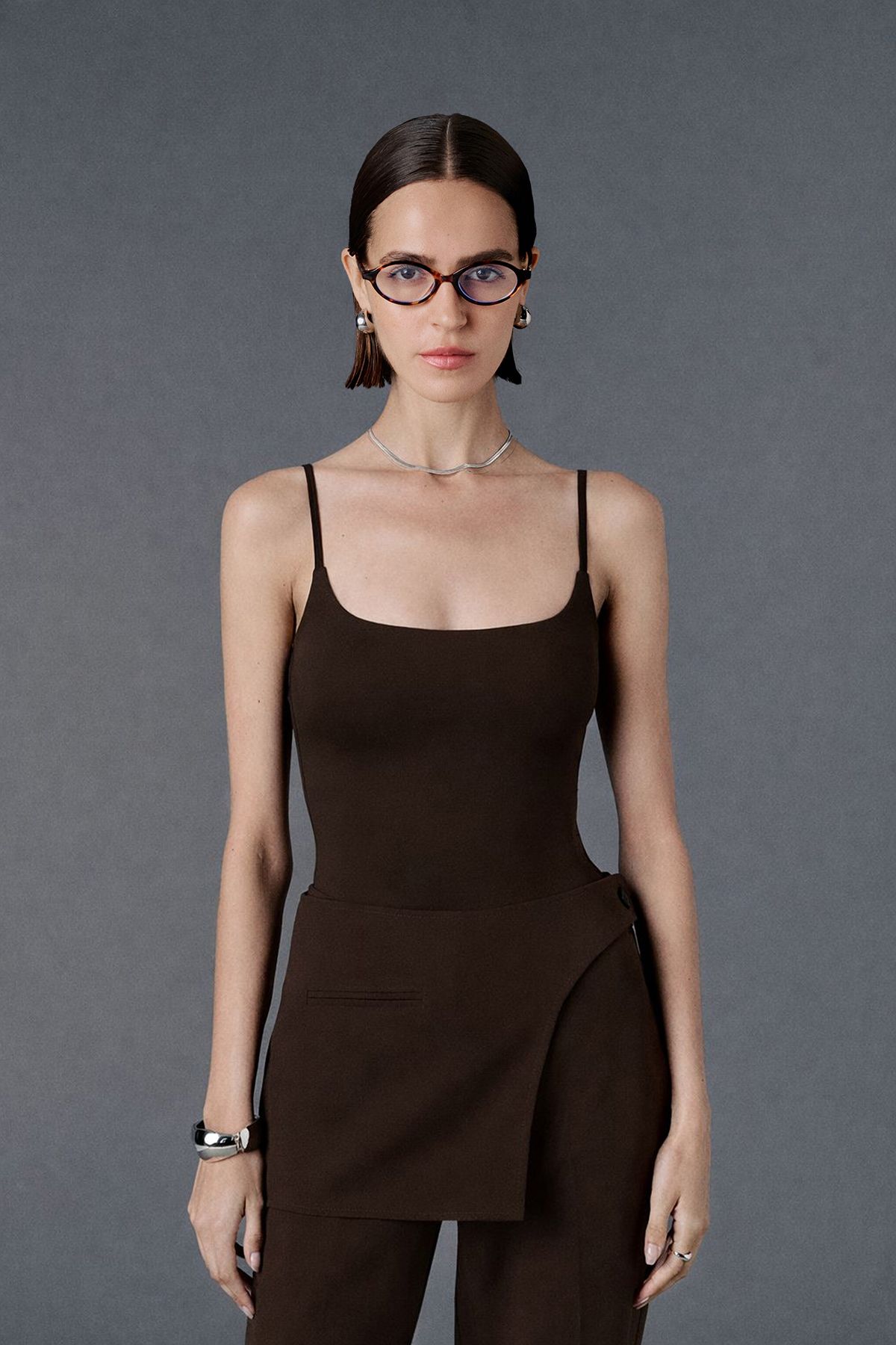 Kare yaka, alttan çıtçıtlı, vücuda oturan kalıp, astarsız, askılı bodysuit.