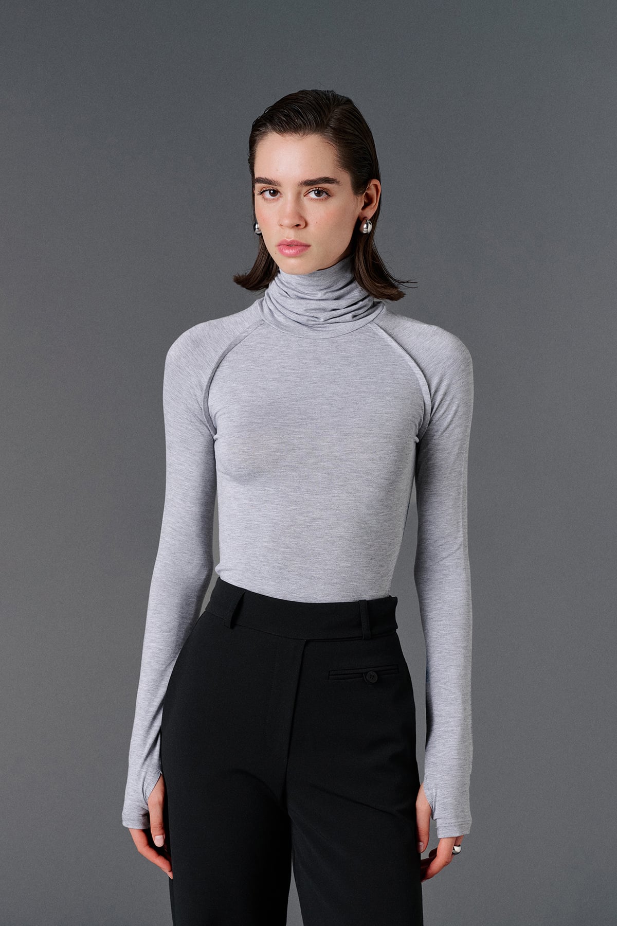 Balıkçı yaka, esnek kumaş, kol ucundan parmak geçirme detaylı, raglan kol detaylı, örme, tam kalıp, basic bluz.