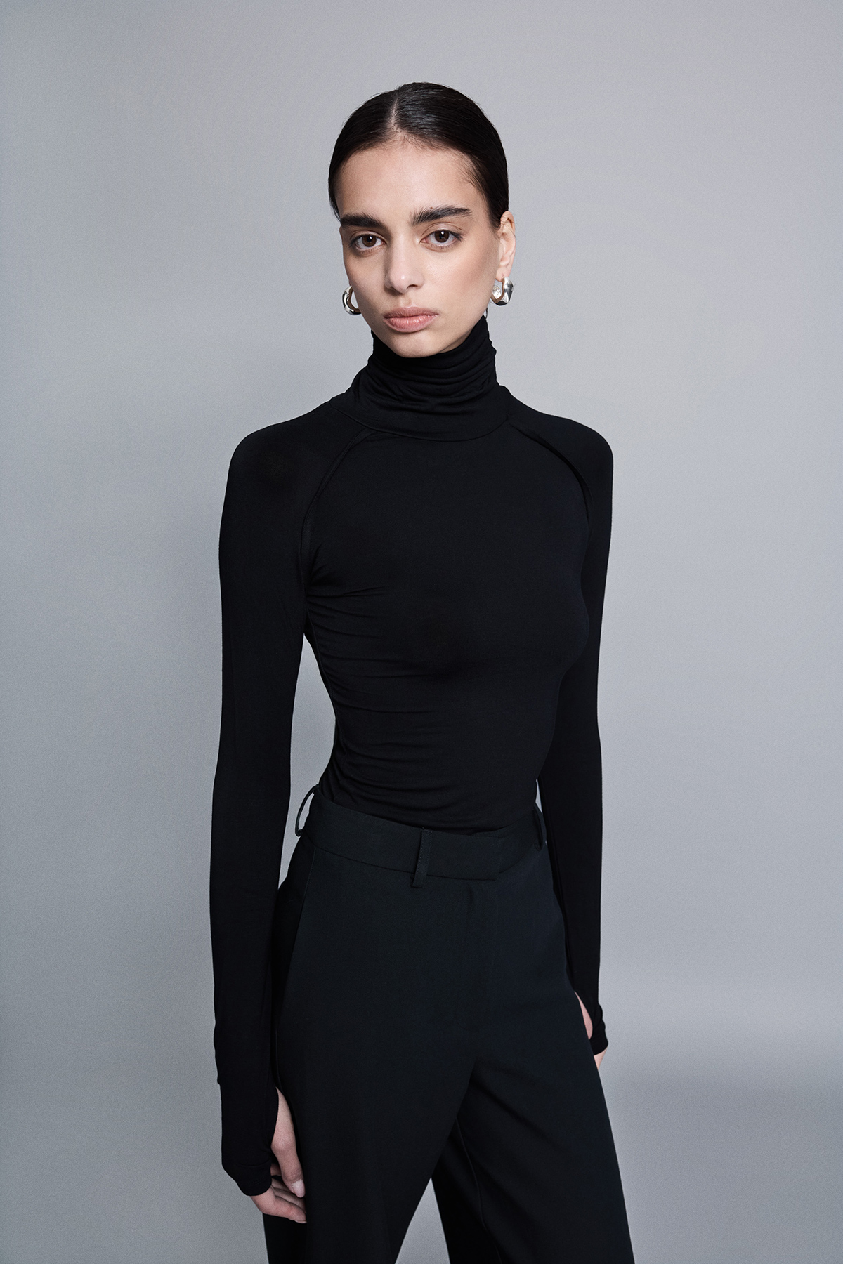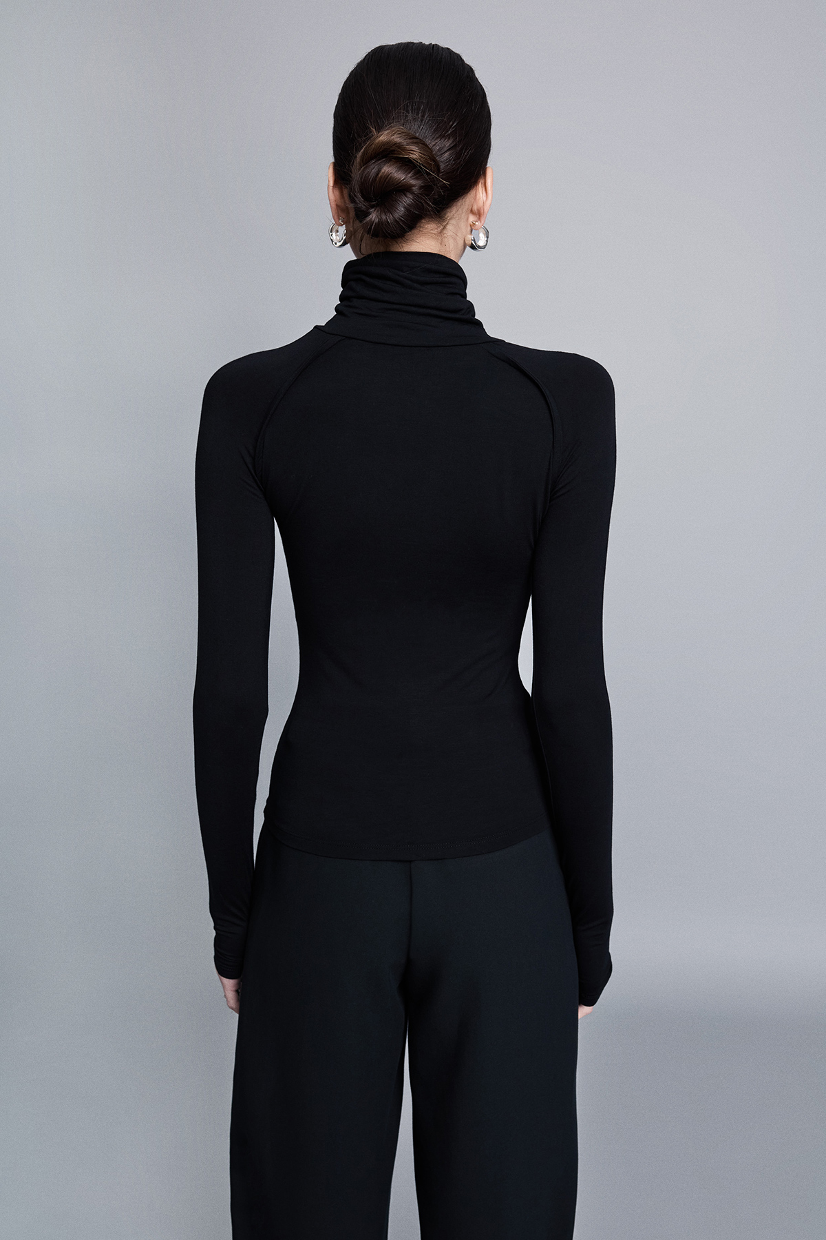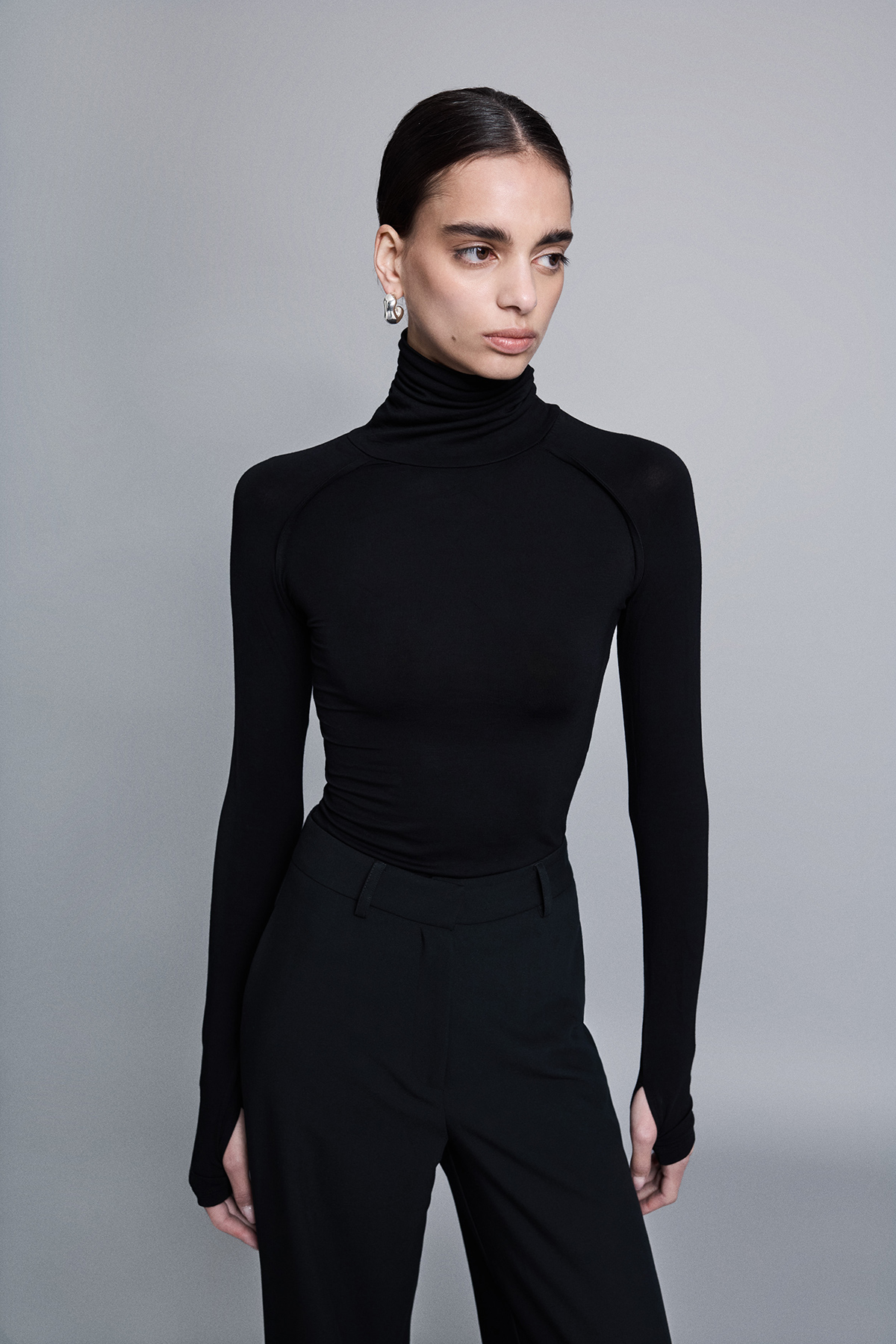 Balıkçı yaka, esnek kumaş, kol ucundan parmak geçirme detaylı, raglan kol detaylı, örme, tam kalıp, basic bluz.